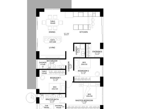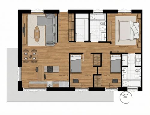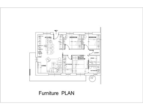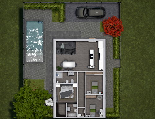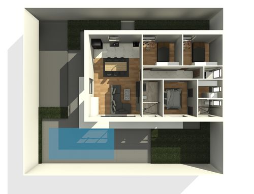 I would like a modern and functional house. I need 3 bedrooms (1 master bedroom + 2 for my two children), 2 bathrooms, and a living area that integrates well with the kitchen (preferably with a view of the pool), which I already own. I would also like to include a small space for an indoor laundry room.