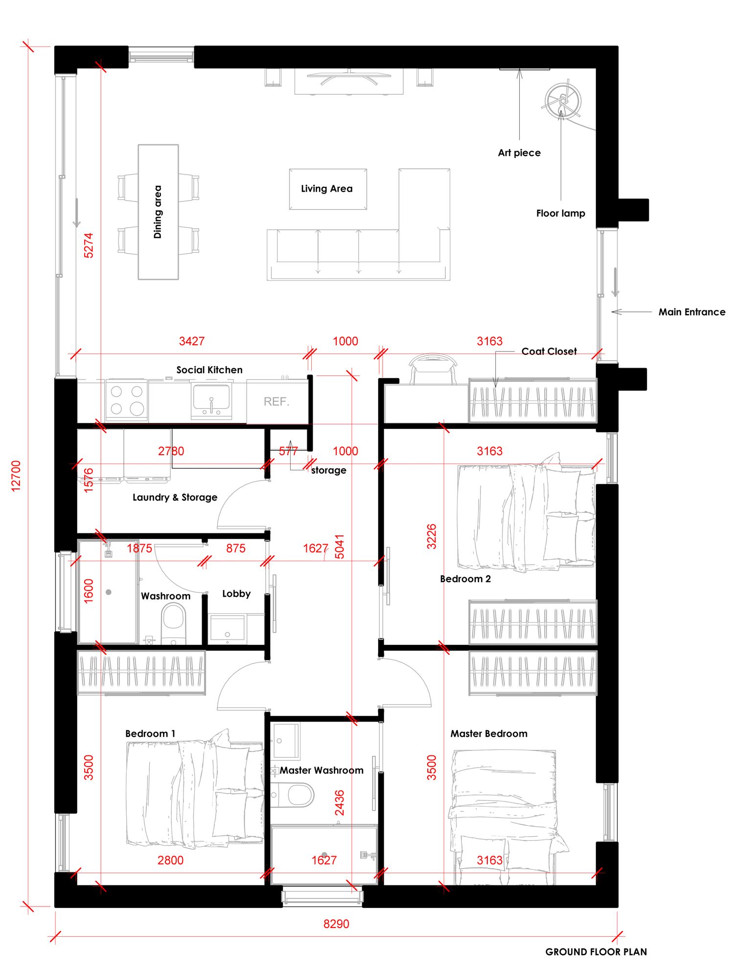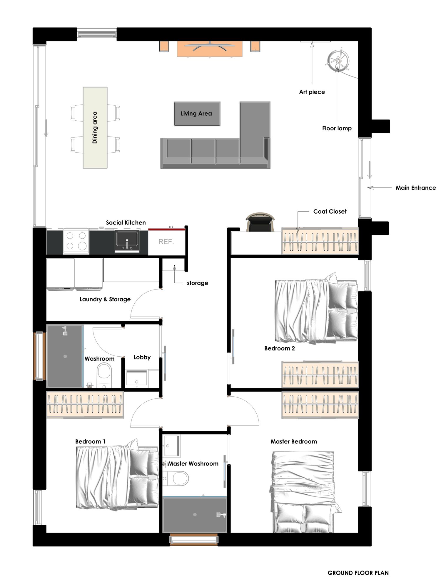 The main entry leads directly into the living area, where a coat cabinet and footwear storage provide comfort and practicality during seasonal changes. The living room layout ensures uninterrupted TV viewing, with circulation space placed behind the sofa. Large openings maximize daylight and pool views, while thoughtful details such as floor lamps, gallery walls, and art pieces add warmth and personality.