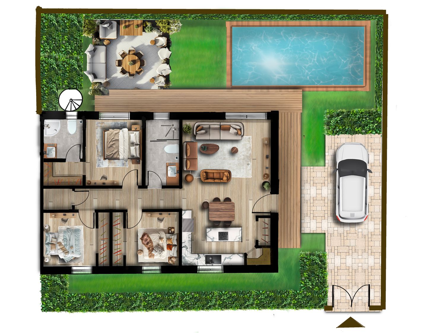 I have also created a landscape design for the outdoor areas to provide a complete vision of the project.