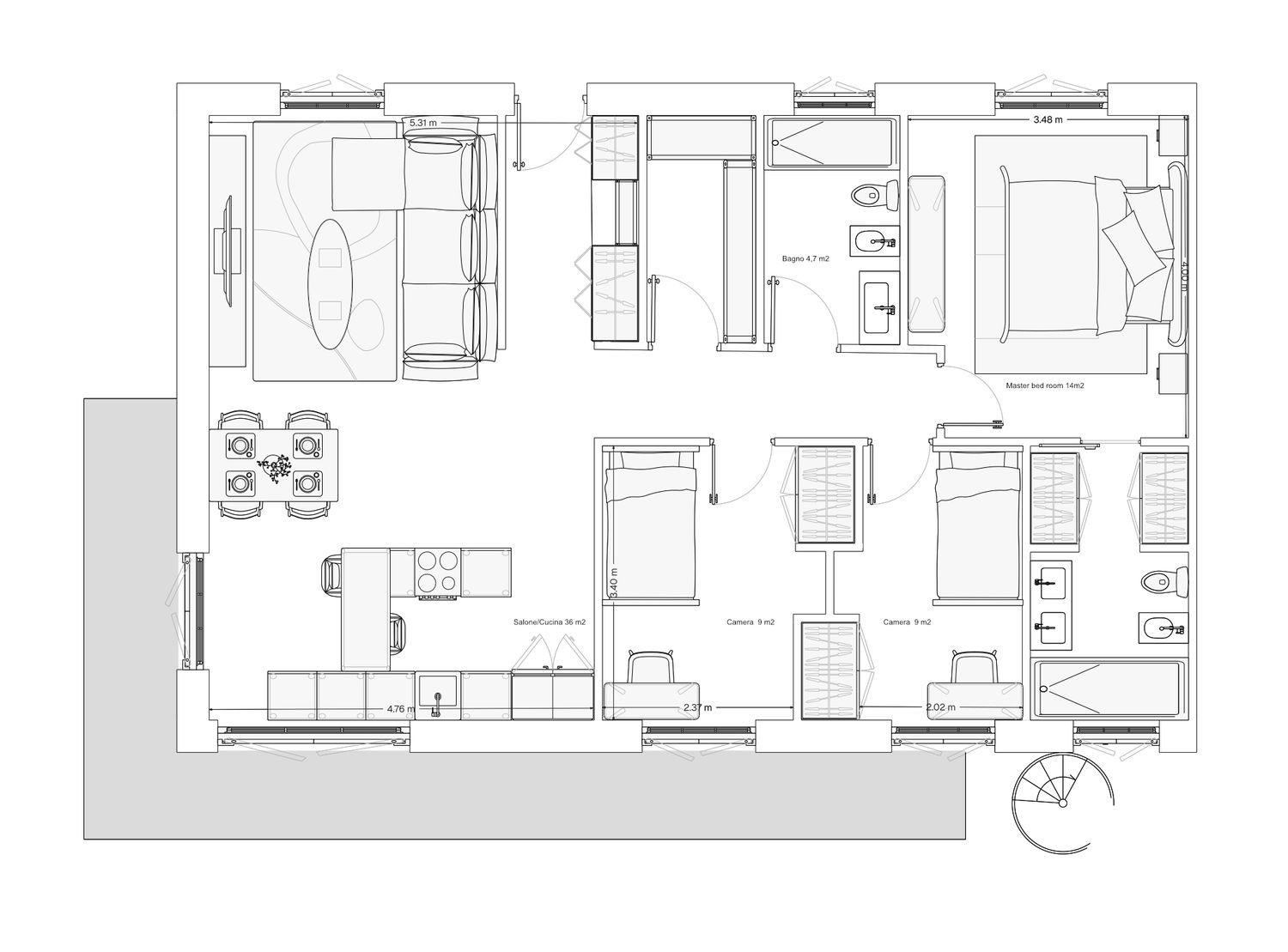 La zona giorno è concepita come un open space dinamico, cuore pulsante della casa. Per la zona notte, ho voluto creare una vera e propria suite padronale: un ambiente privato e rilassante completo di bagno dedicato e cabina armadio. Infine, la terza stanza è stata progettata all'insegna della versatilità, fungendo sia da accogliente camera ospiti che da ufficio funzionale, rispondendo così alle moderne esigenze lavorative