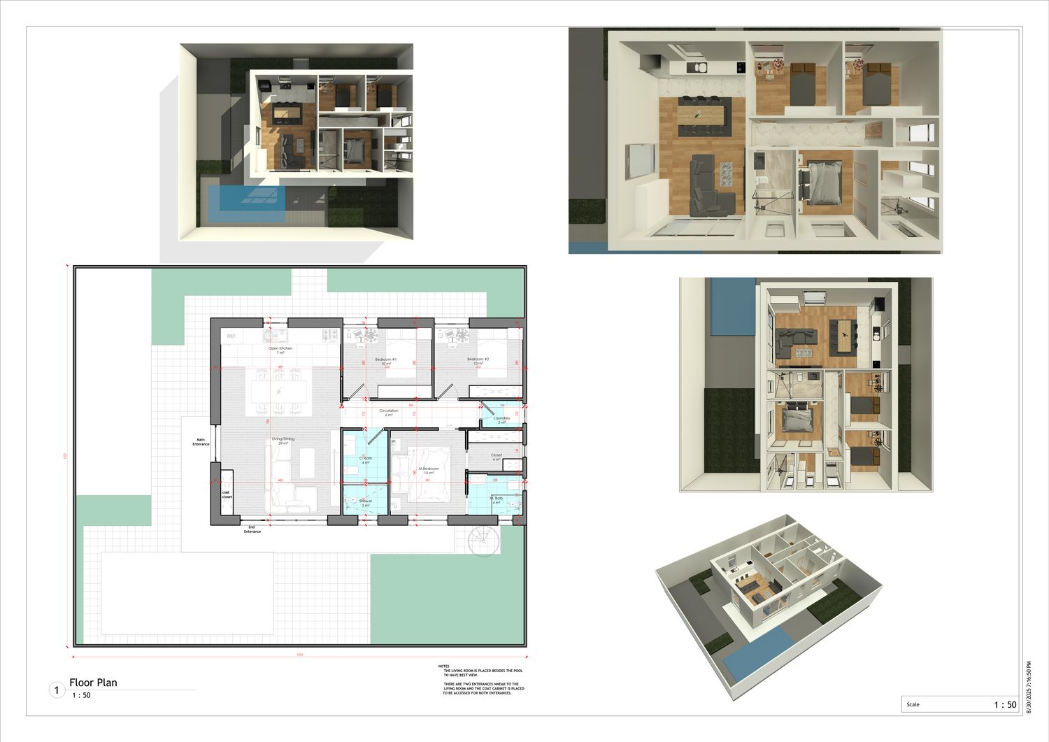 To be functional in daily use, the design includes an indoor laundry room and coat closet entrance. Window locations and main entrance have been designed as the villa is not yet built, while keeping in mind maximizing natural light, privacy, and circulation.