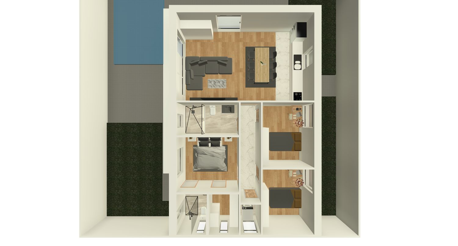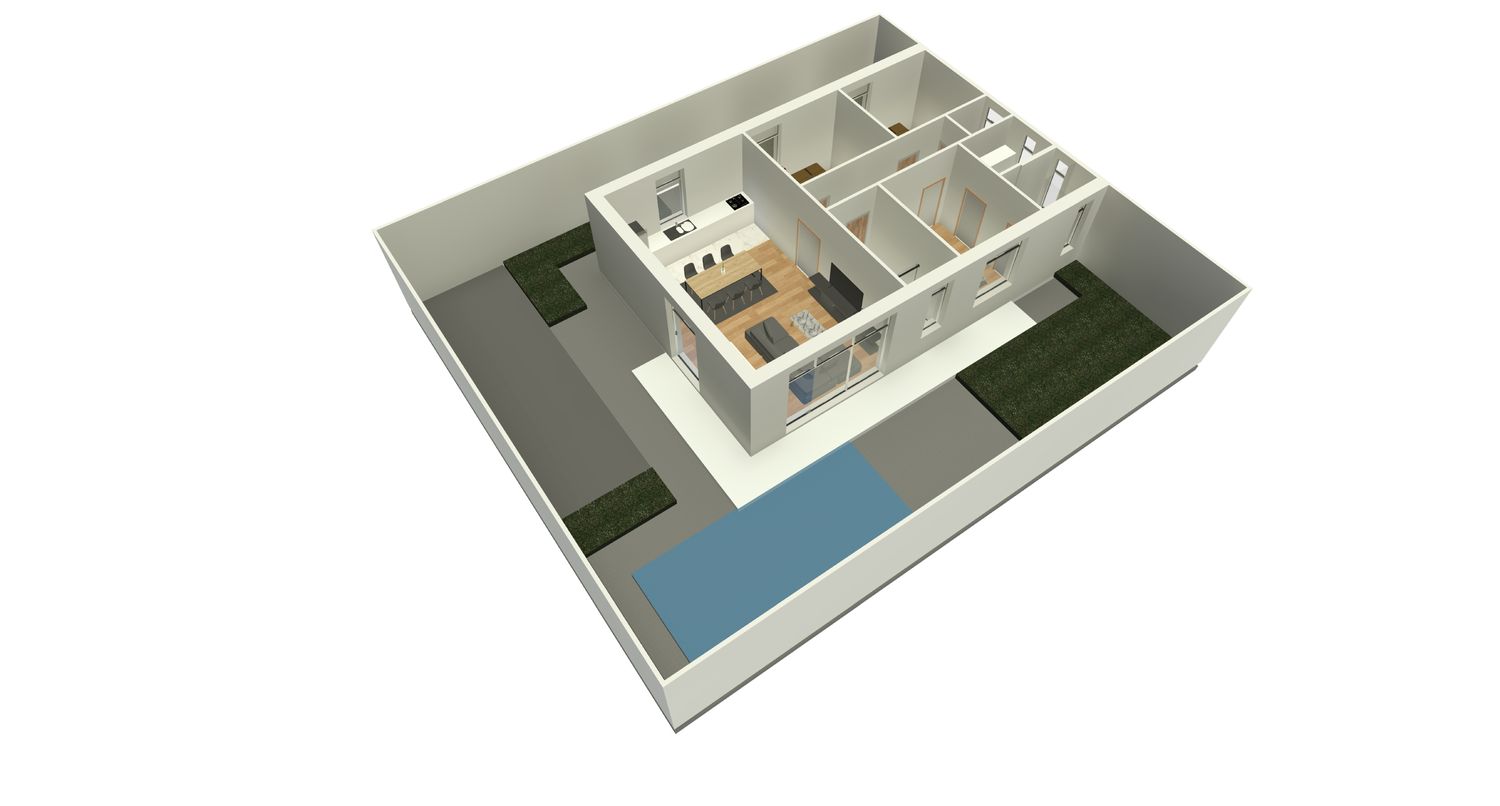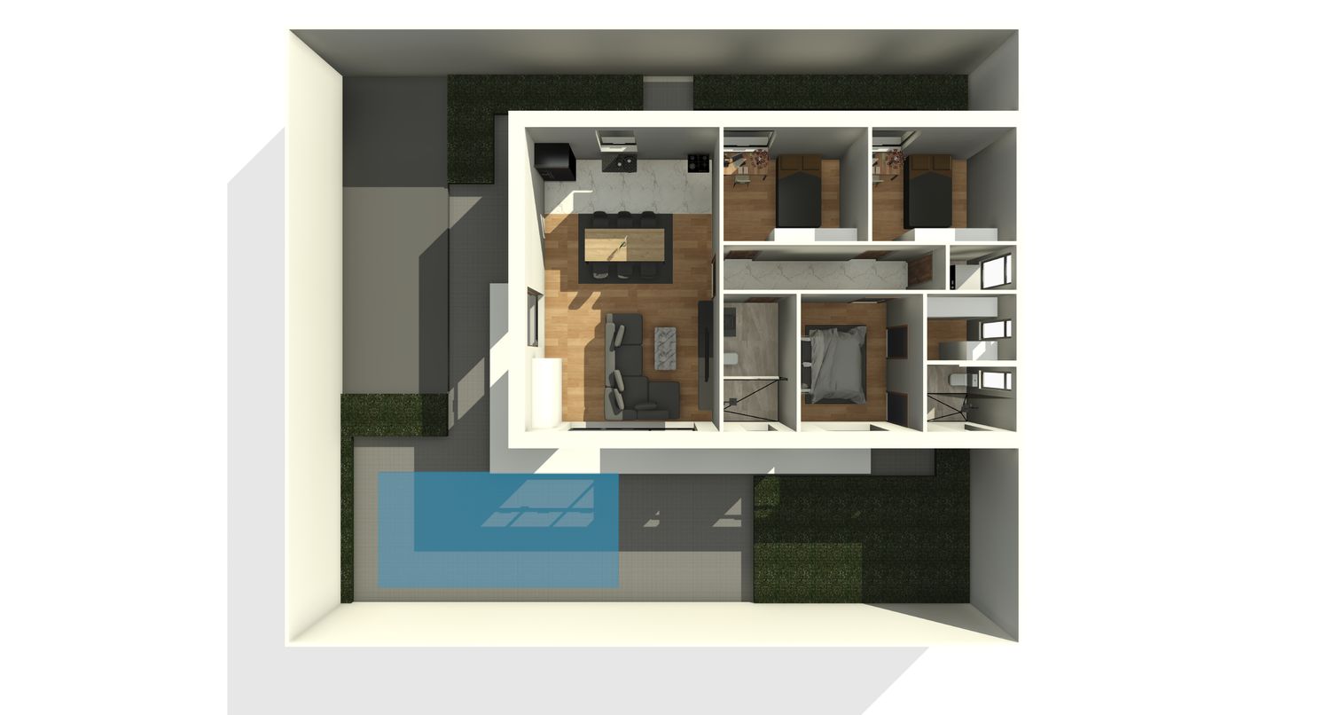 This villa design is done in accordance with your request for a modern and functional house for the family. The house has a big master bedroom, two warm children bedrooms, and two accessible bathrooms. In the center of the house, the living room is combined with the kitchen and faces the pool to bring about openness, light, and a calming view.