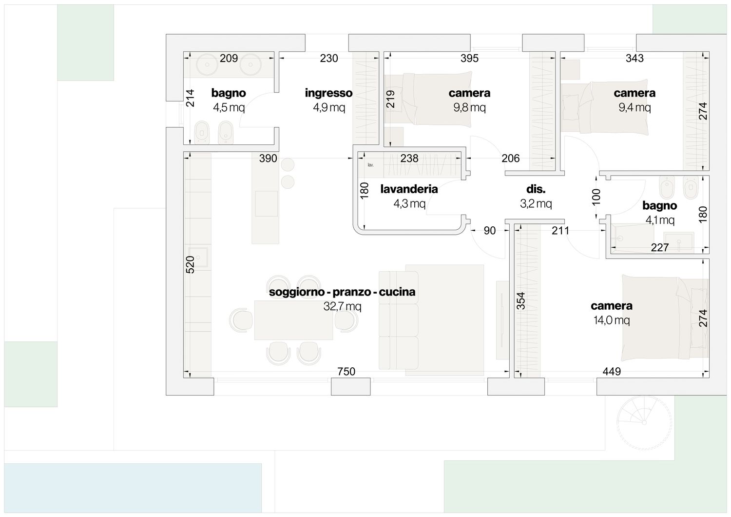 All’inizio del corridoio della zona notte si trova una piccola lavanderia, collocata qui perché non è possibile destinare questo spazio a camere, data l’assenza di un collegamento diretto con l’esterno. Le camere singole dei ragazzi sono adiacenti tra loro e distanti dalla camera matrimoniale, che affaccia sulla piscina.