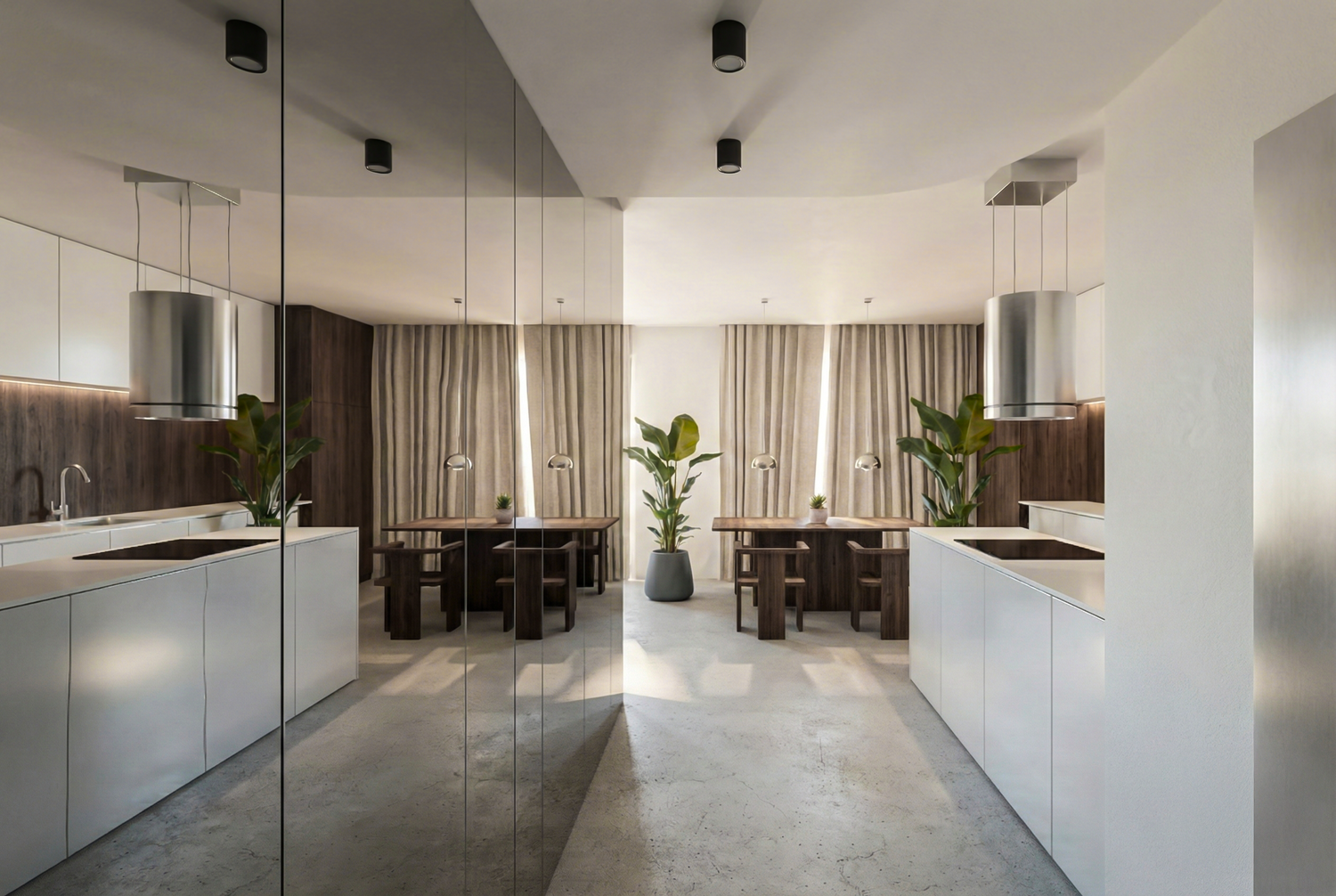 L’idea alla base del progetto è organizzare gli spazi di servizio attorno a quelli principali. Seguendo le richieste del cliente e valorizzando la splendida cucina realizzata, si è pensato innanzitutto a un ingresso di rappresentanza: una boiserie rivestita in cromo amplia lo spazio antistante il bagno degli ospiti e nasconde il guardaroba destinato a riporre le giacche.