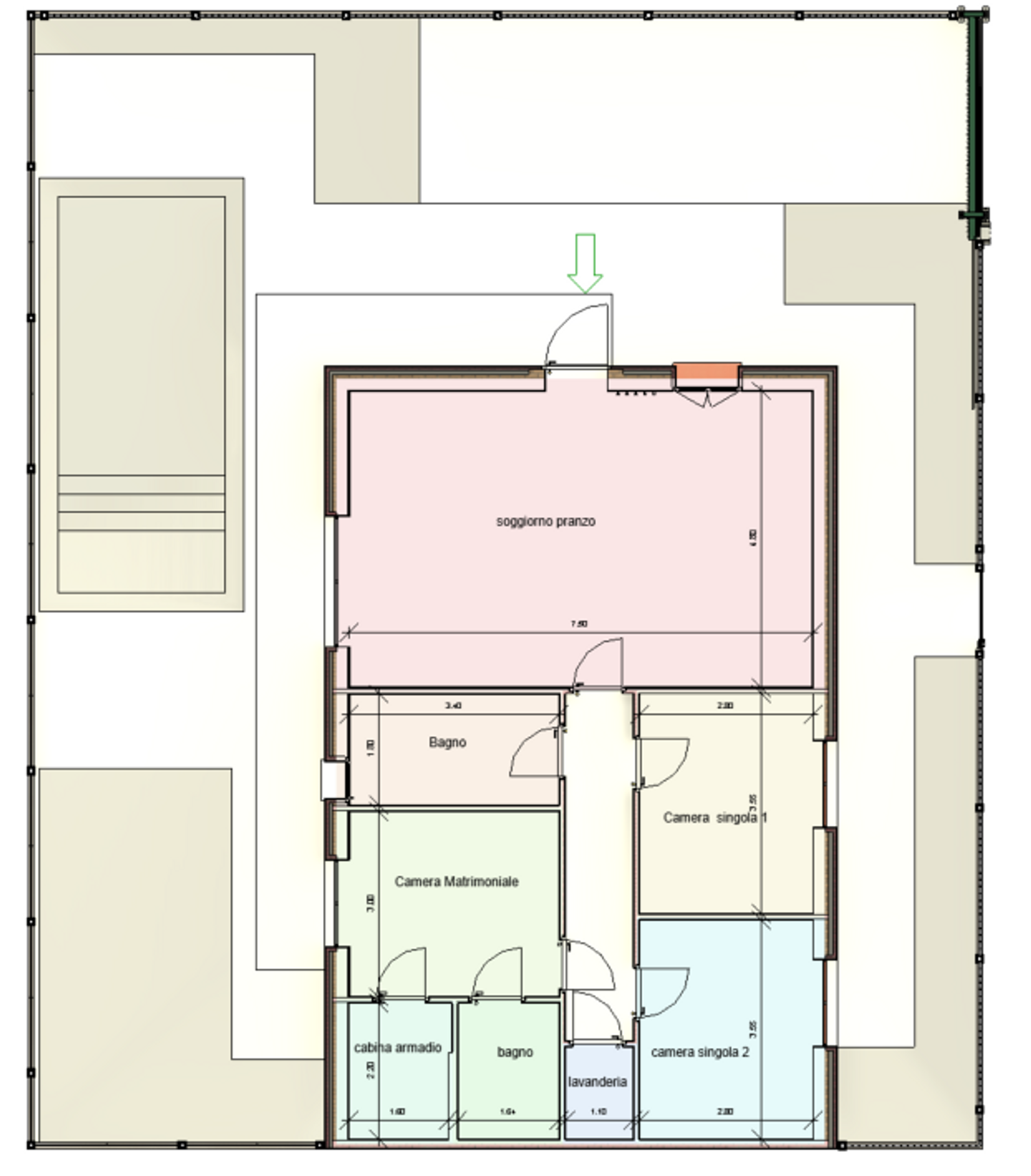 Per quanto riguarda i servizi, sono stati inseriti due bagni di cui uno vicino alla zona notte, e una lavanderia interna discreta e facilmente accessibile. Nella zona d’ingresso trova spazio una cappottiera, soluzione elegante e funzionale. È stata sfruttata la libertà compositiva per il posizionamento degli infissi e dell’ingresso, massimizzando luce e collegamento con gli spazi esterni.