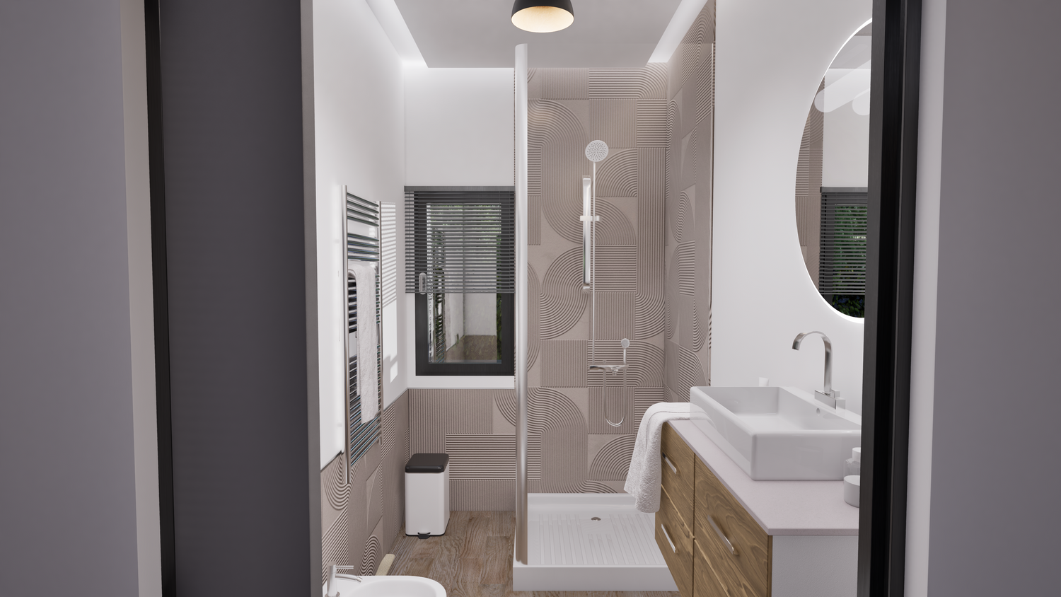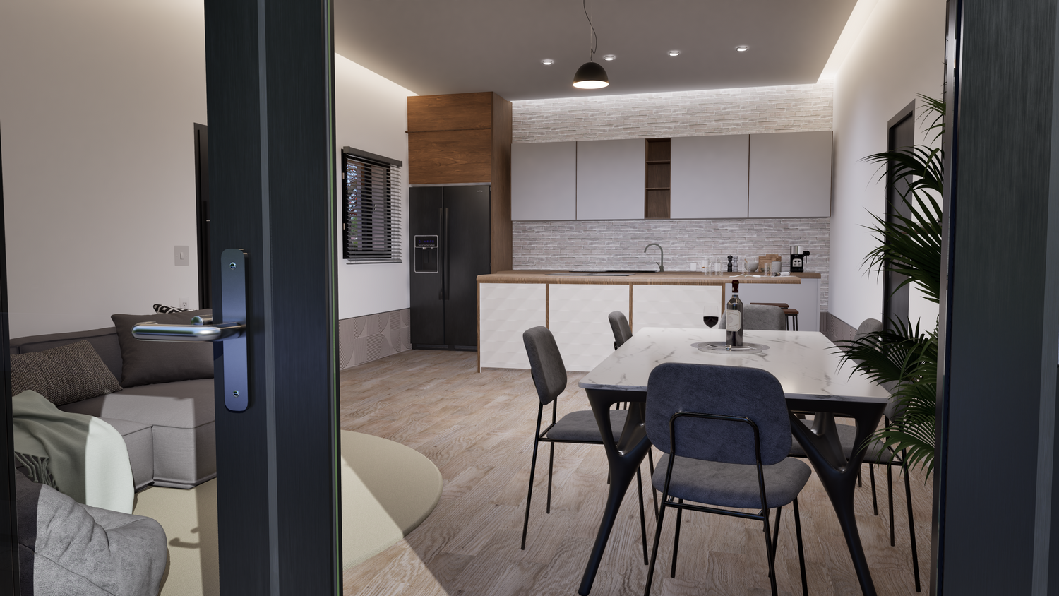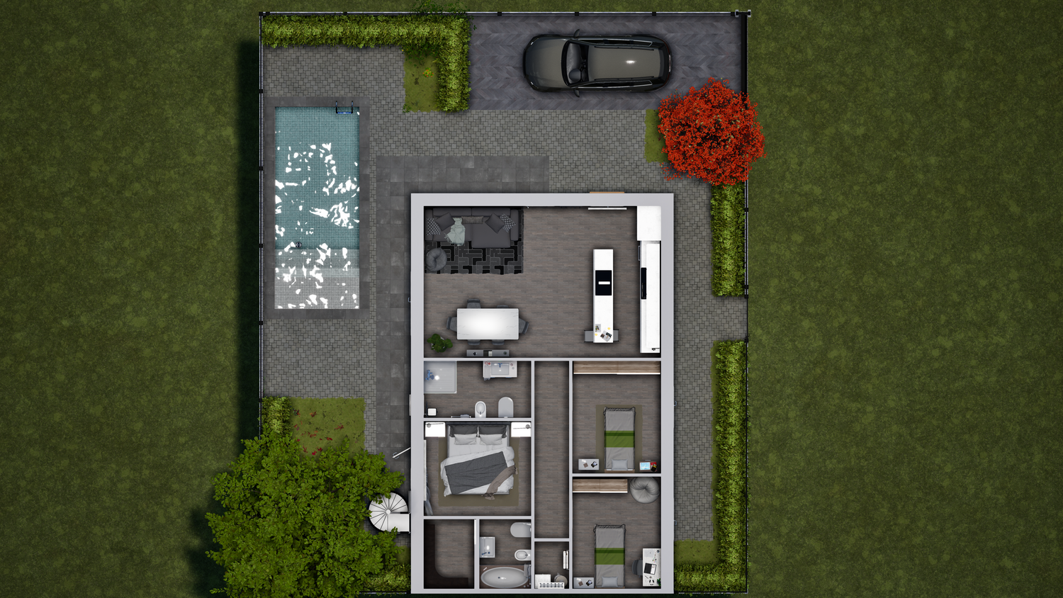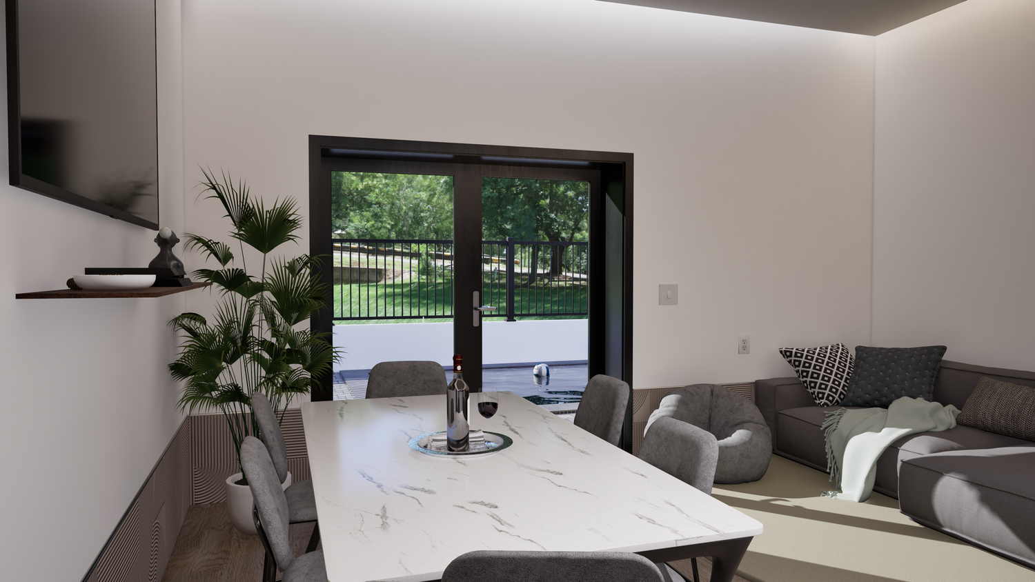 L’abitazione progettata nasce per soddisfare esigenze di modernità, funzionalità e comfort familiare. La zona giorno è ampia, caratterizzata da spazi luminosi e collegati tra loro: la cucina, già in possesso del cliente, si integra perfettamente con l’area pranzo e soggiorno, offrendo una piacevole vista sulla piscina esterna. L’ambiente è pensato per la convivialità grazie al layout open space e ai materiali contemporanei.