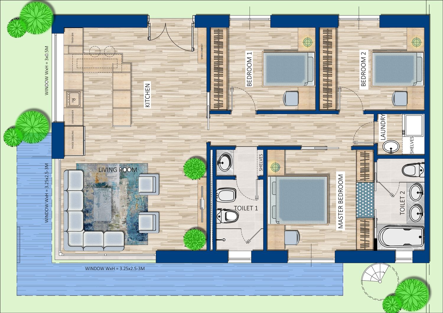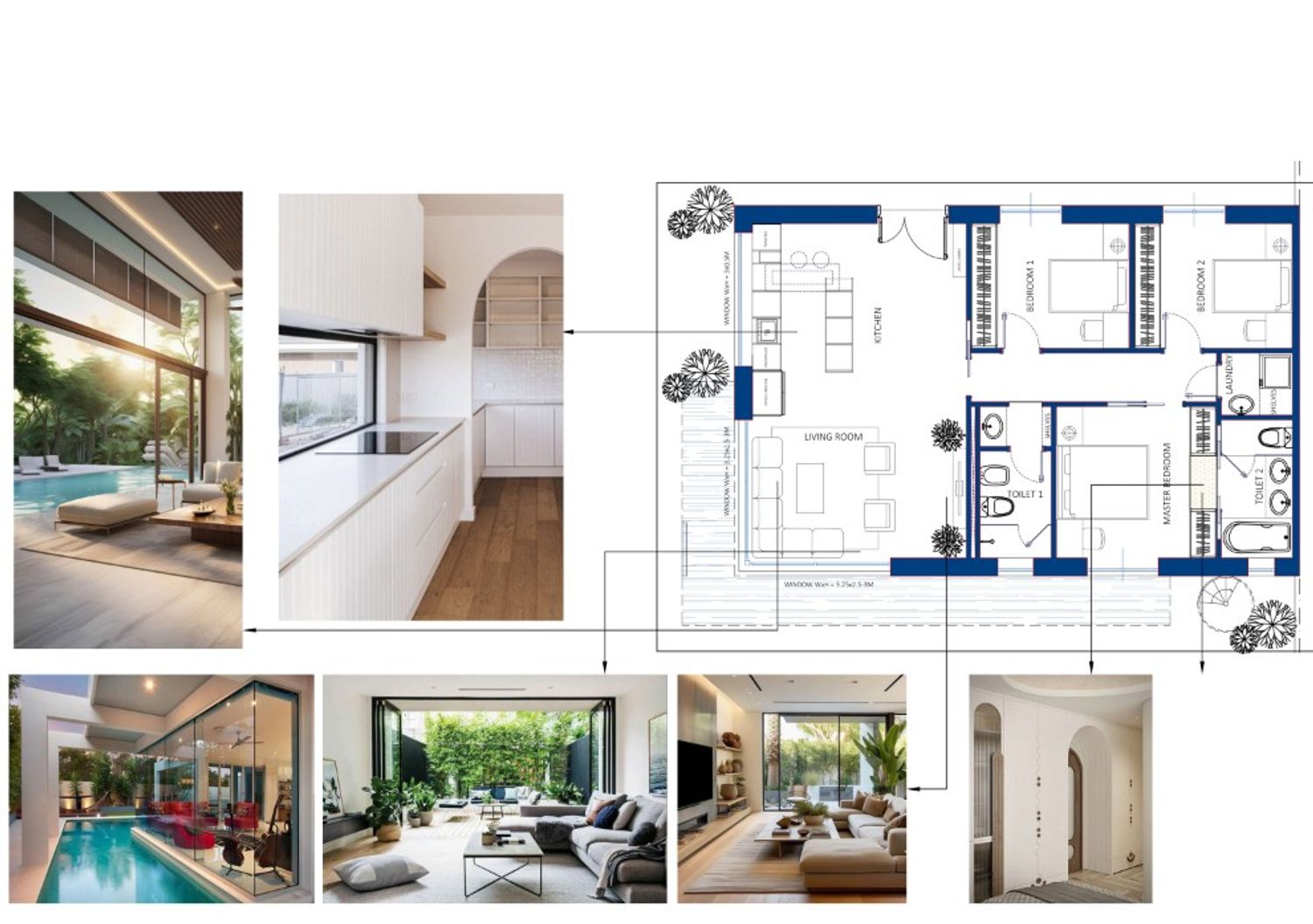 I’ve enlarged the main entrance door, creating a direct view toward the living room, which features a large glass wall that opens up the view to the pool and greenery outside. The living room includes a large, long sofa, a rug, a small table, and two accent chairs. The opposite wall has a TV shelf and a decorative wall that can be painted in a different color or used to hang art, depending on the owner’s preference.