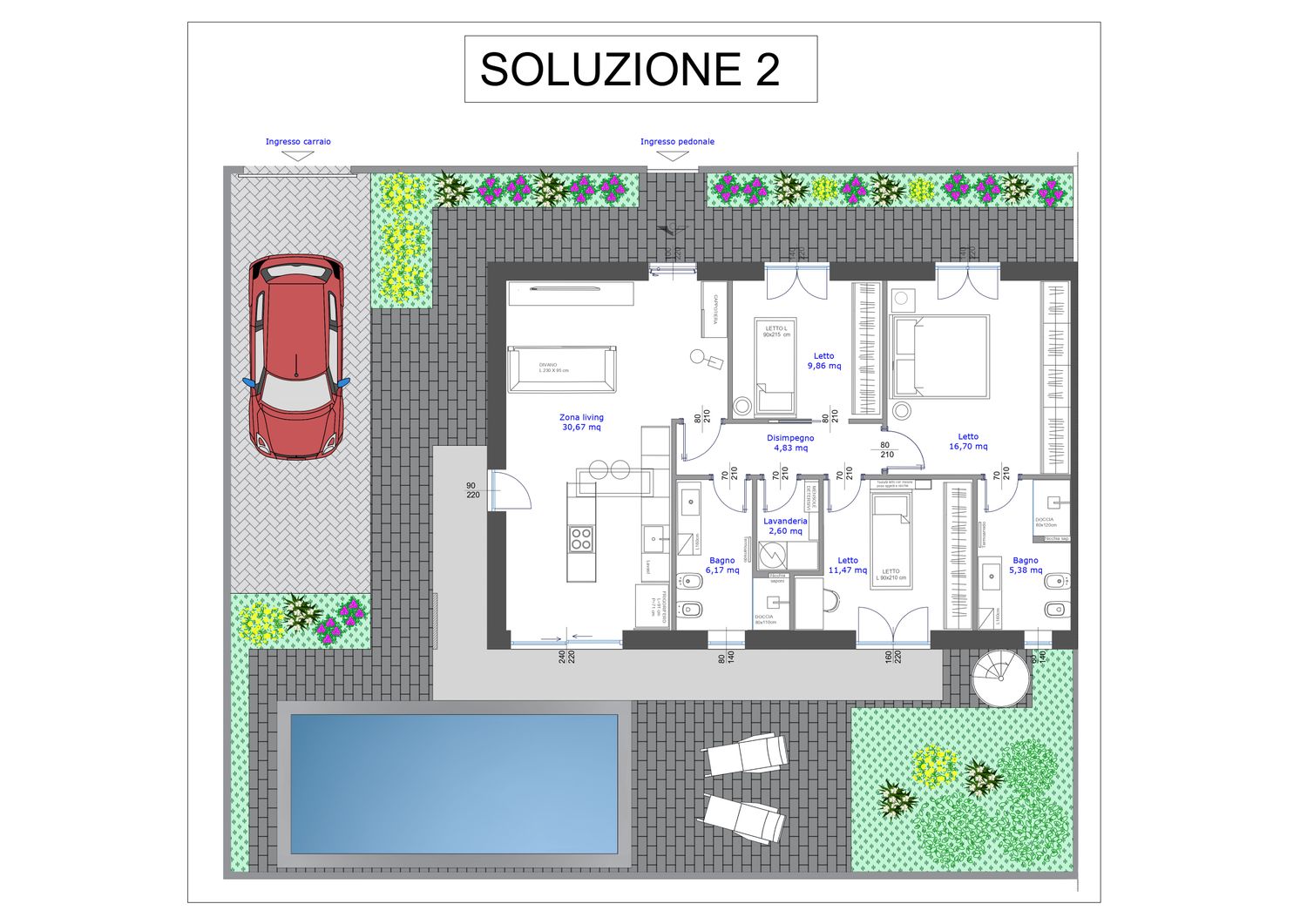 In questa soluzione l’ingresso è collocato sul fronte verso la strada, con percorsi ben definiti per pedoni e auto.