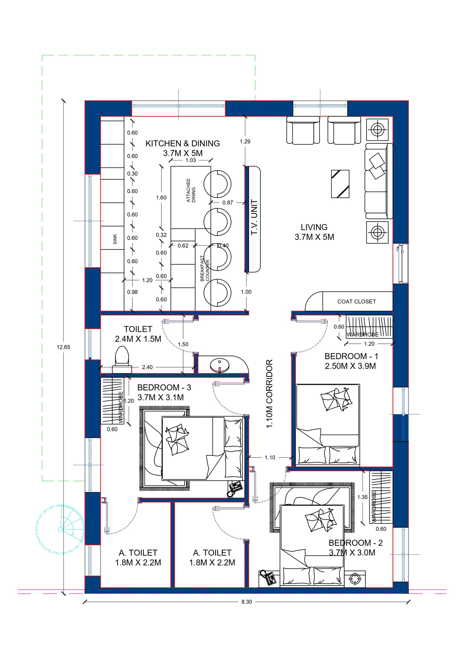 This thoughtfully designed 3-bedroom residential plan emphasizes cross ventilation, spacious interiors, and strong indoor–outdoor connection. The open living, kitchen, and dining layout enhances spatial flow and natural interaction, while a wide window behind the kitchen frames the pool view, bringing in abundant light and ventilation. Clear zoning between public and private spaces, along with well-planned bedrooms and bathrooms, ensures comfort, privacy, and functional efficiency throughout the home.