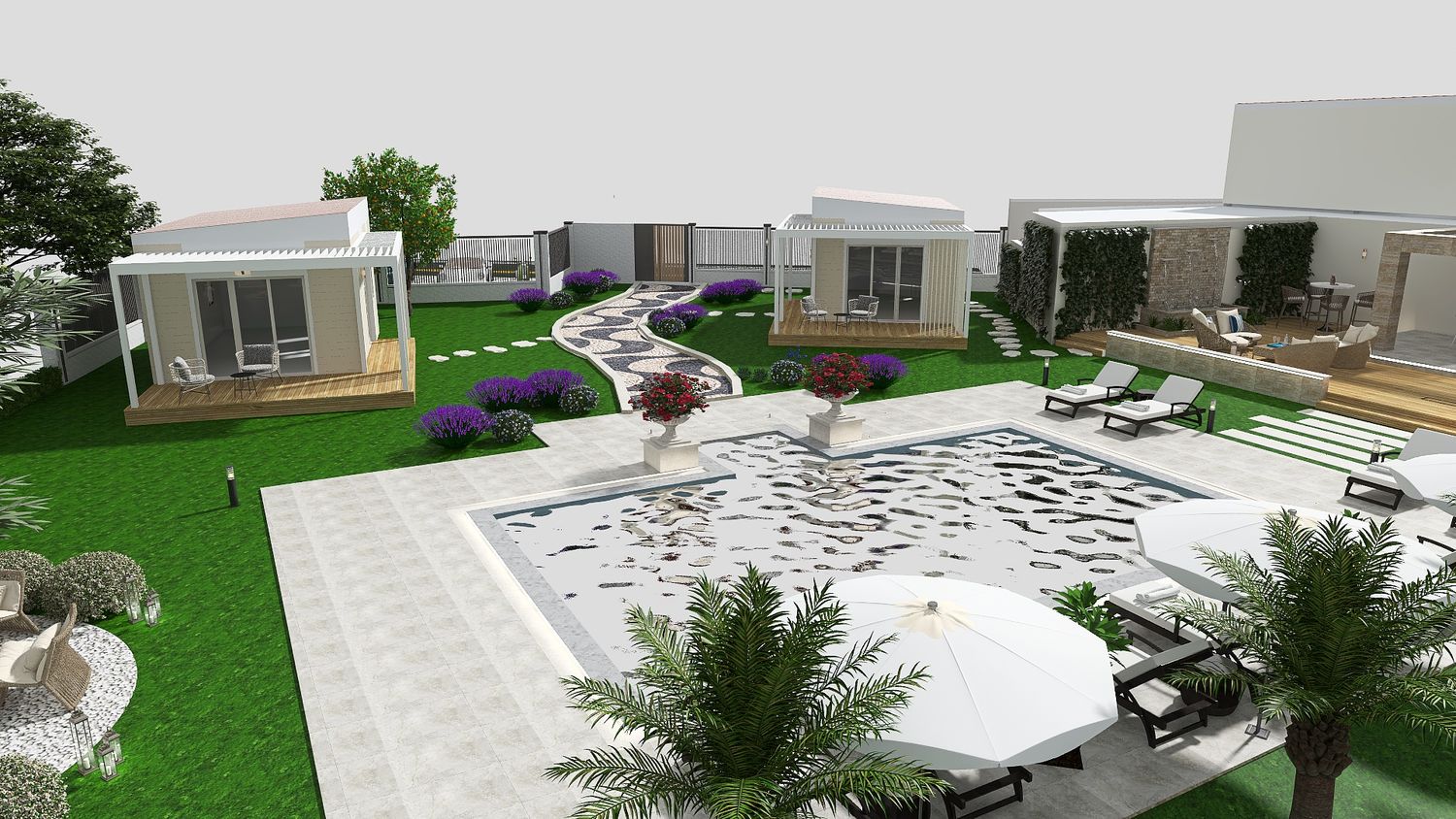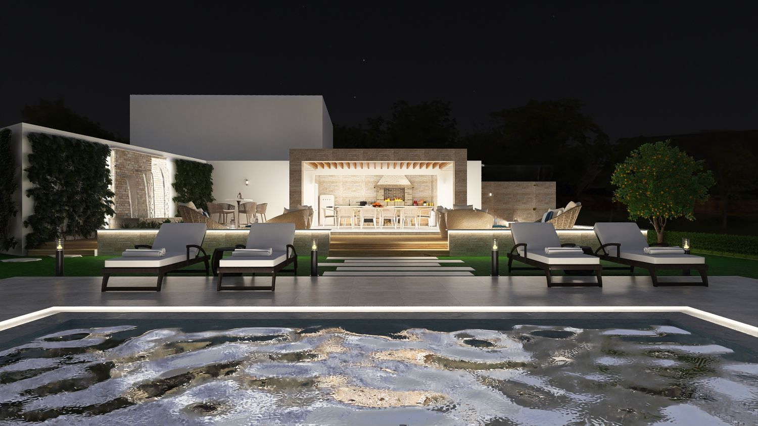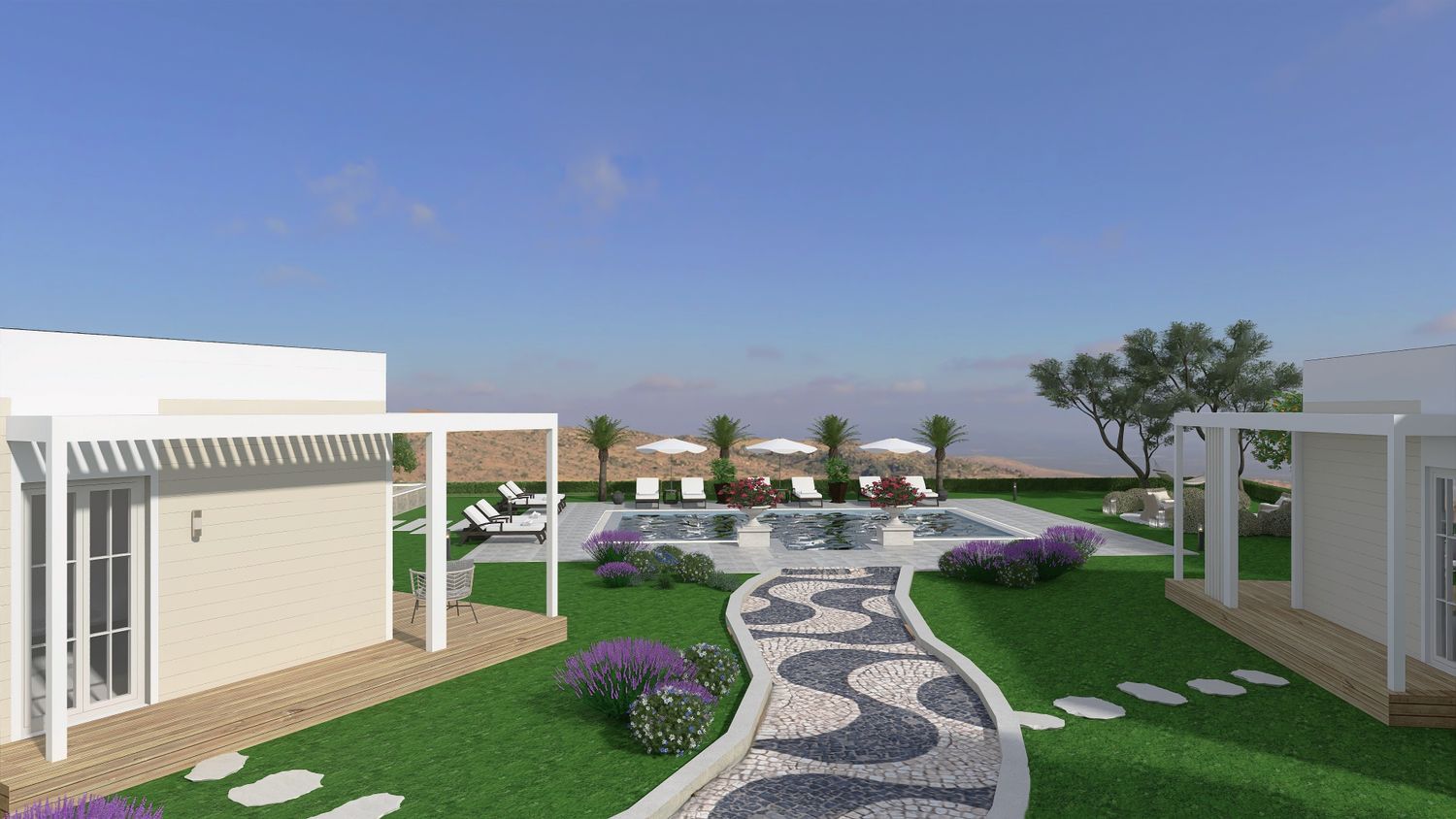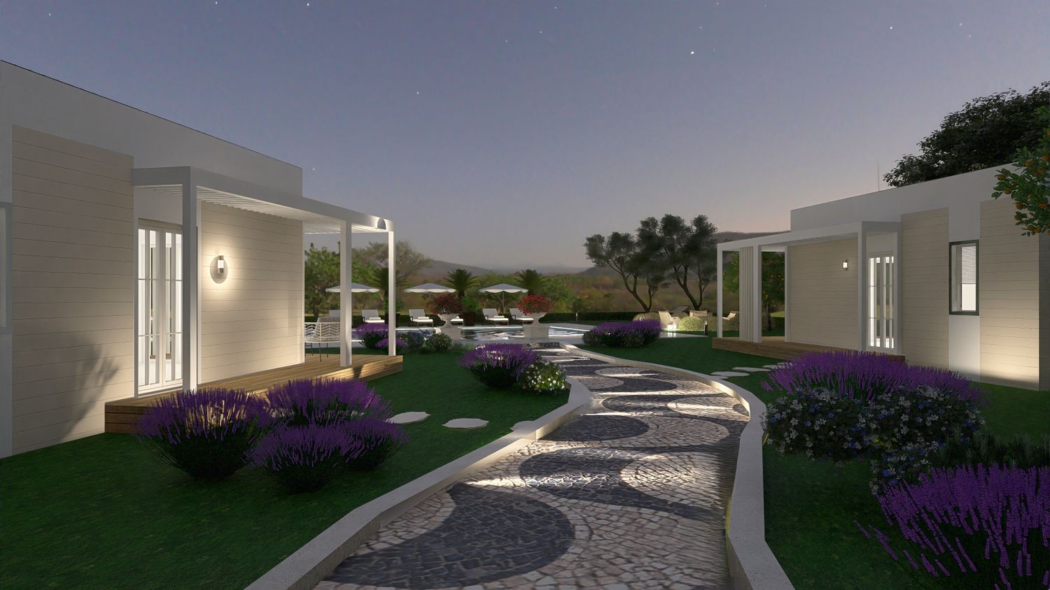 A sinuous, free-form pathway defines the primary circulation through the site. Composed of concrete cubes arranged in an accent pattern and edged with integrated recessed lighting, it guides movement in a fluid and intuitive manner. Along its length, clusters of Mediterranean planting enrich the sensory experience, reinforcing the connection between architecture and landscape as guests are gradually led towards the focal point of the project โ the pool area.