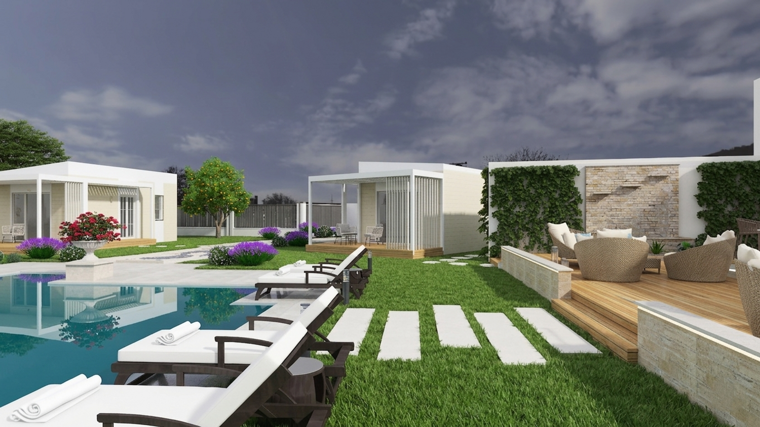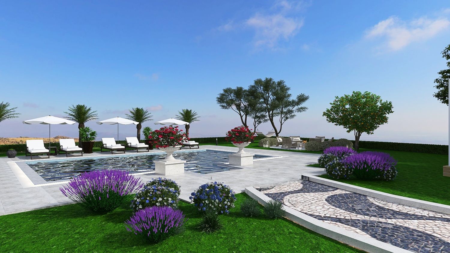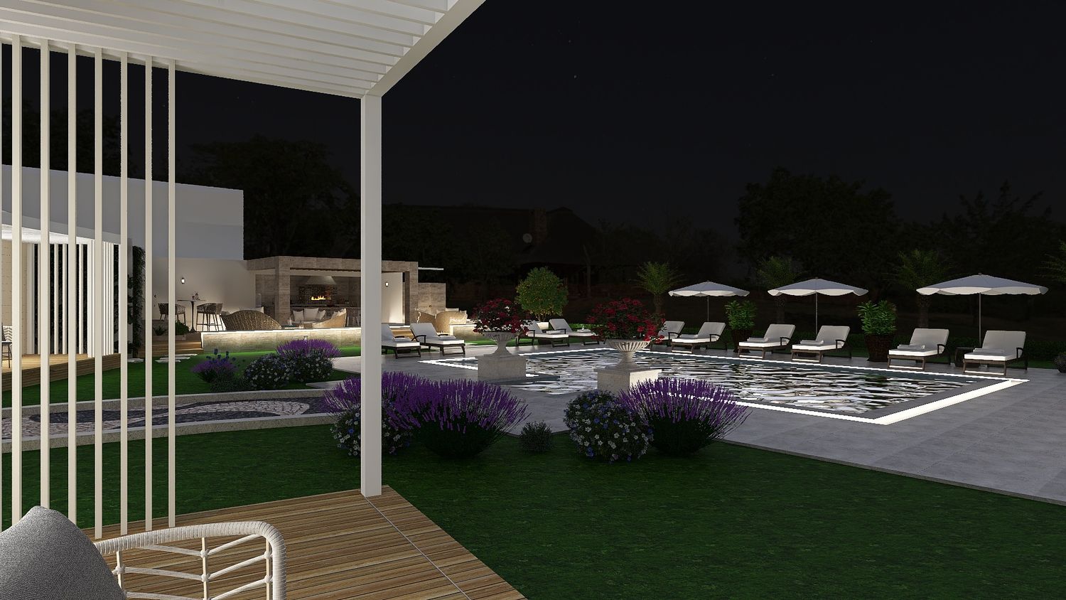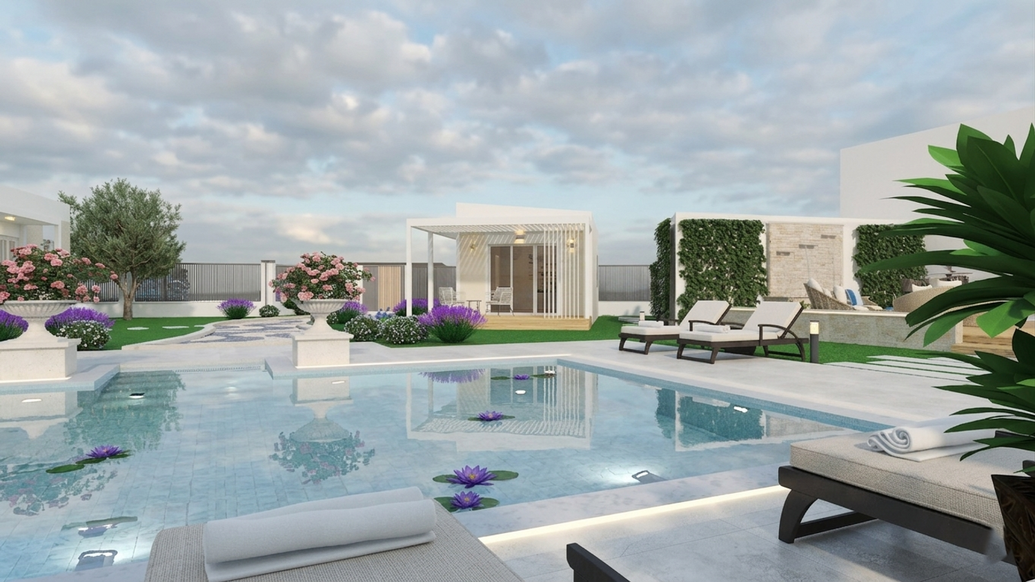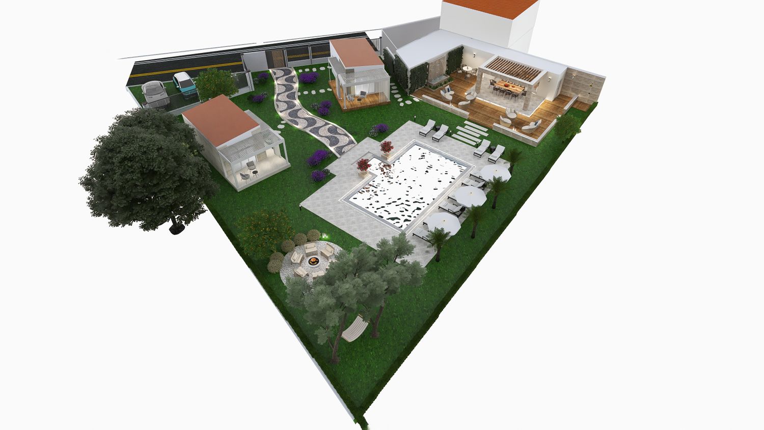 A sinuous, free-form pathway defines the primary circulation through the site. Composed of concrete cubes arranged in an accent pattern and edged with integrated recessed lighting, it guides movement in a fluid and intuitive manner. Along its length, clusters of Mediterranean planting enrich the sensory experience, reinforcing the connection between architecture and landscape as guests are gradually led towards the focal point of the project โ the pool area.