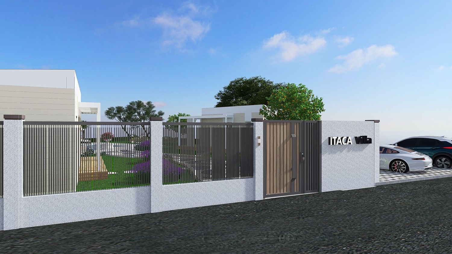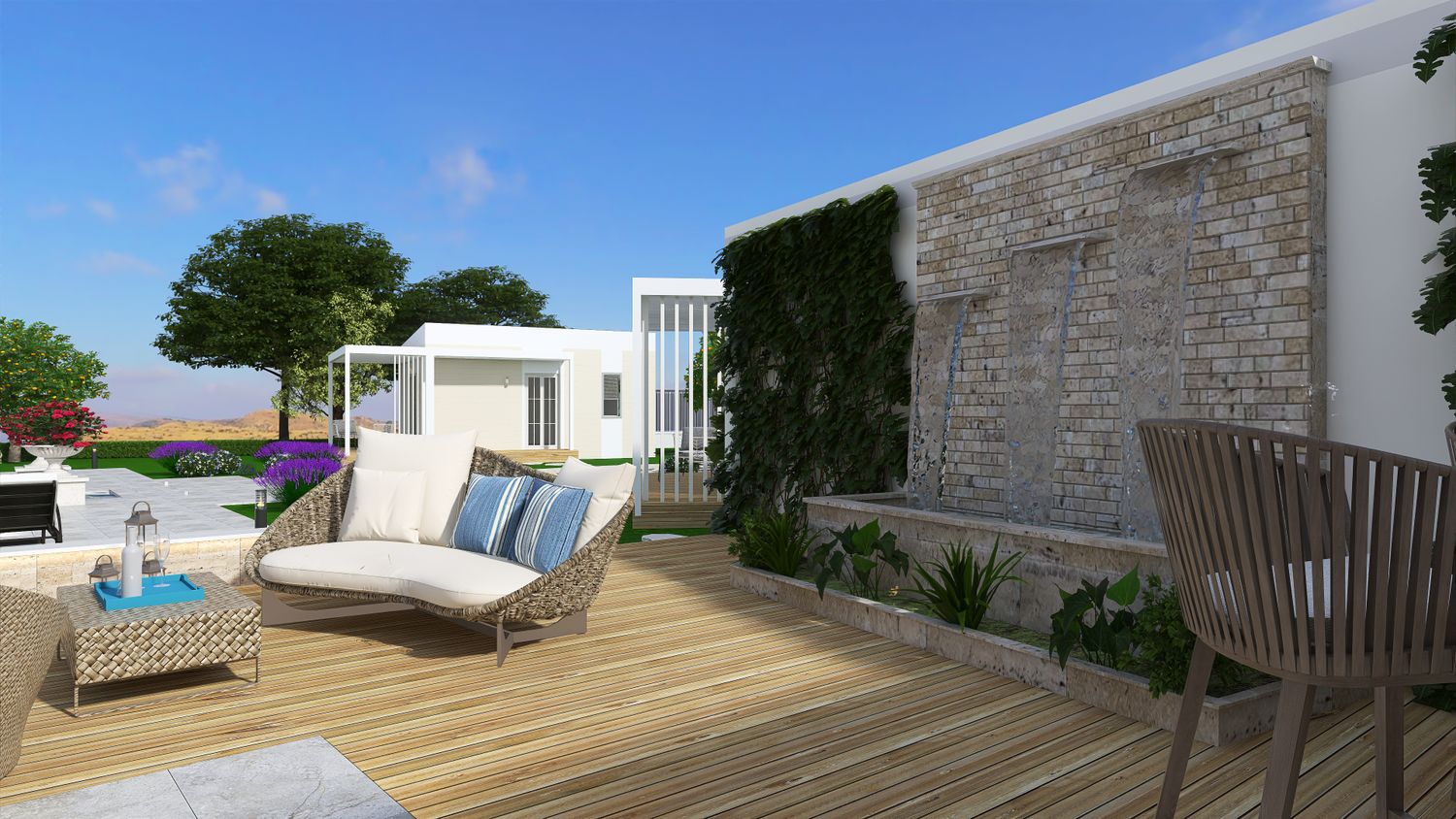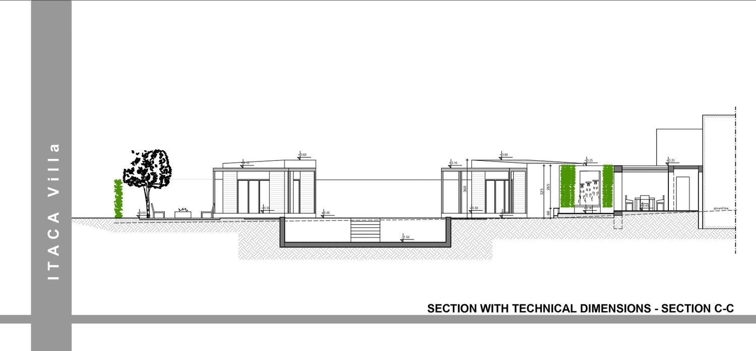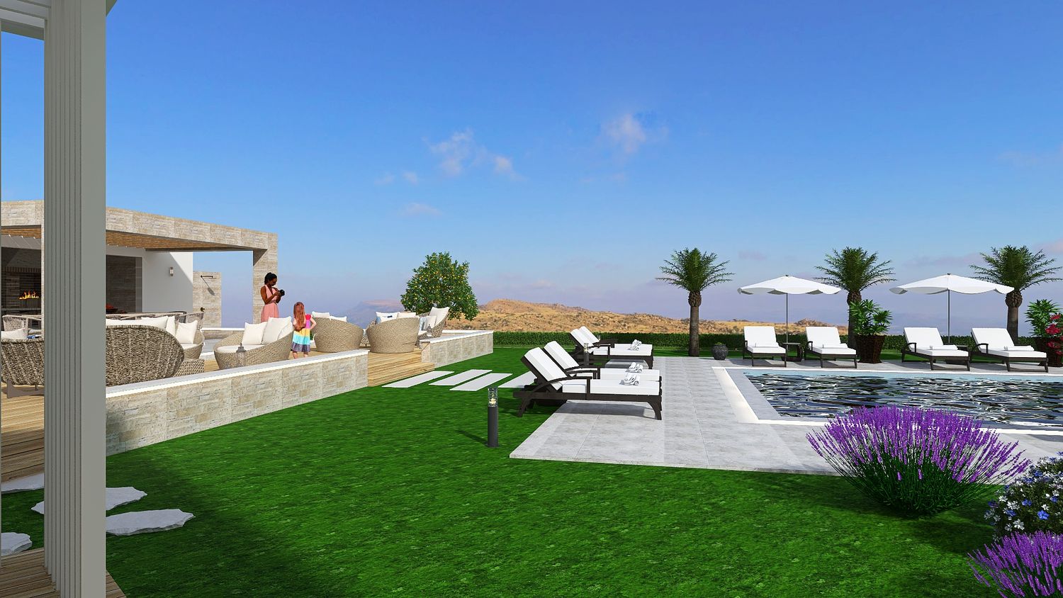 A sinuous, free-form pathway defines the primary circulation through the site. Composed of concrete cubes arranged in an accent pattern and edged with integrated recessed lighting, it guides movement in a fluid and intuitive manner. Along its length, clusters of Mediterranean planting enrich the sensory experience, reinforcing the connection between architecture and landscape as guests are gradually led towards the focal point of the project โ the pool area.