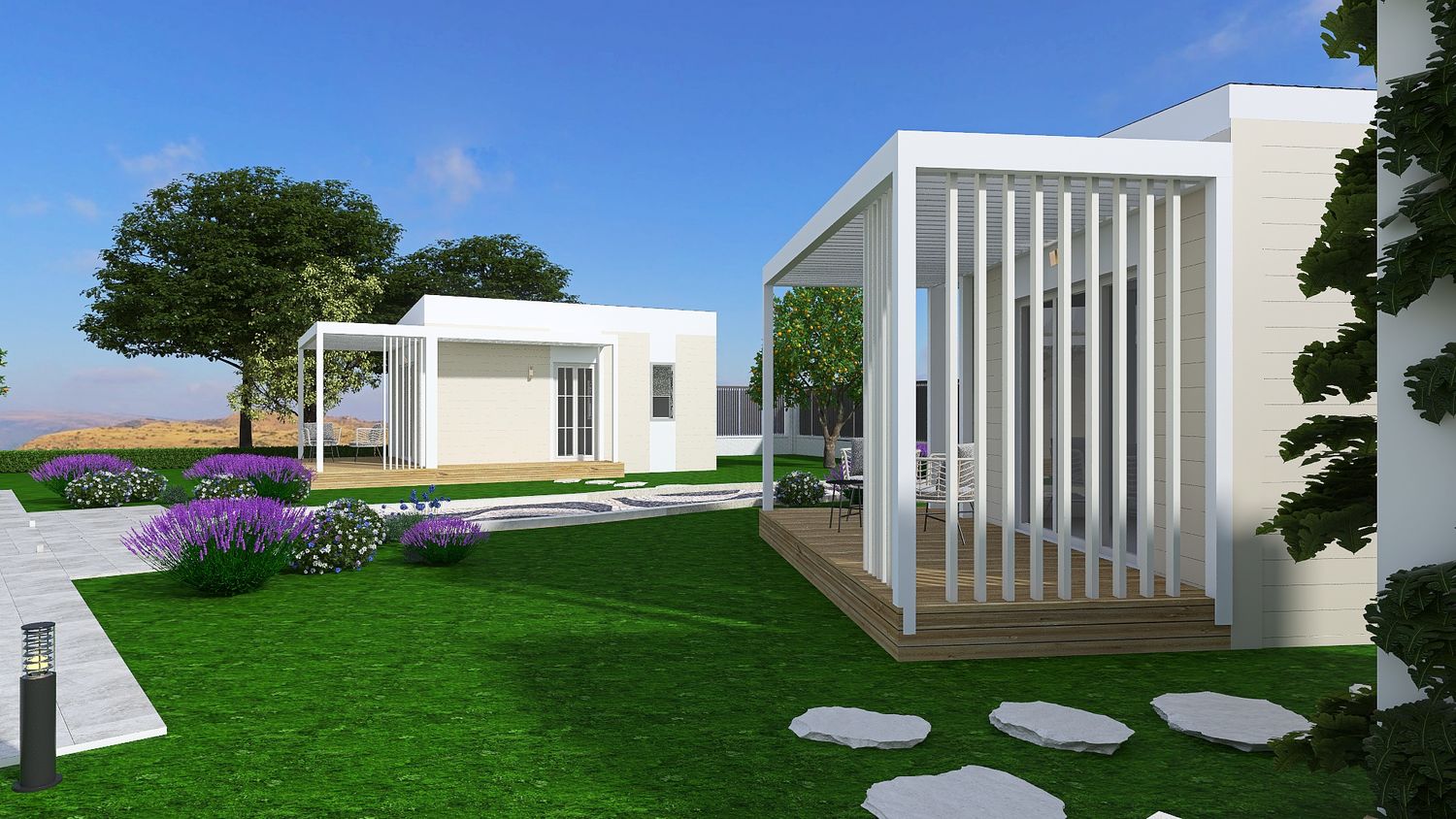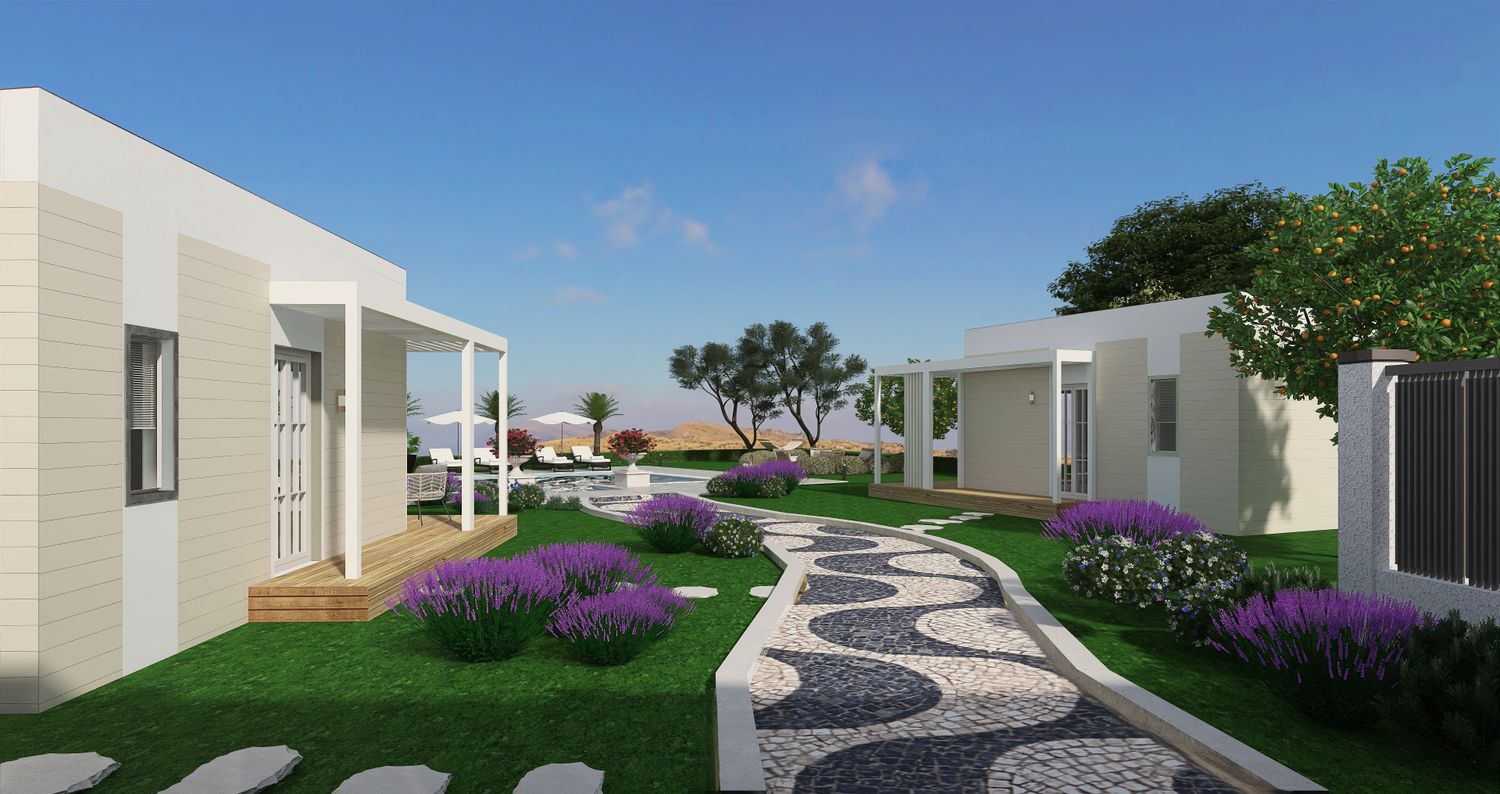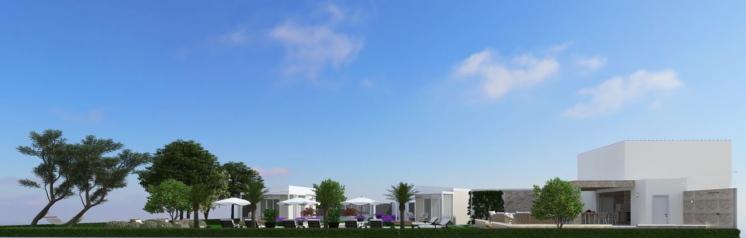 Upon arrival, guests are welcomed into a more intimate zone hosting two accommodation units. These units are conceived as refined adaptations of prefabricated modular structures available on the market, reconfigured to meet your spatial and functional requirements. Their architectural expression is intentionally restrained: finished in soft white and light yellow tones, they are designed to blend gently into the natural surroundings rather than stand out.