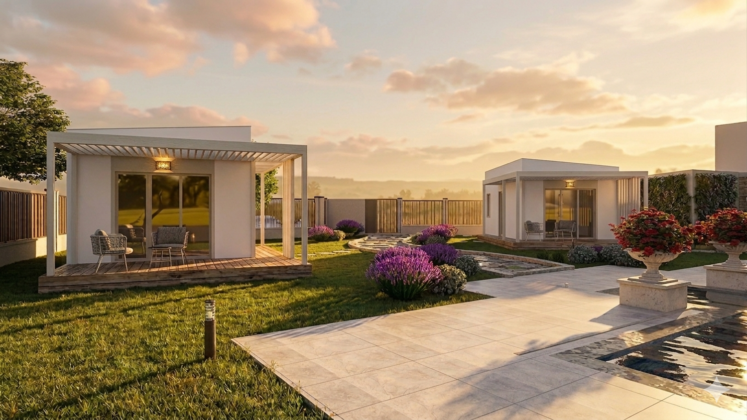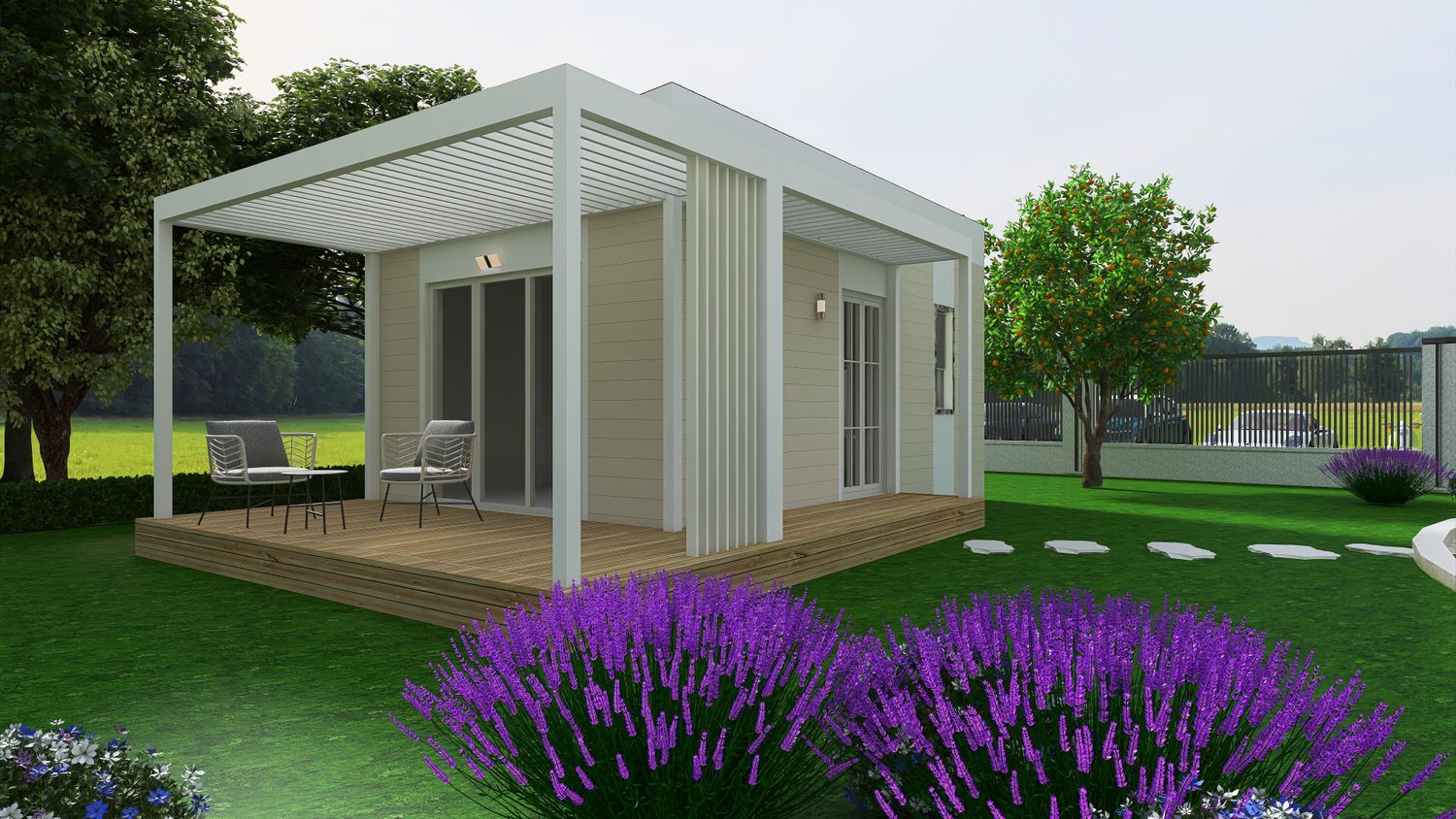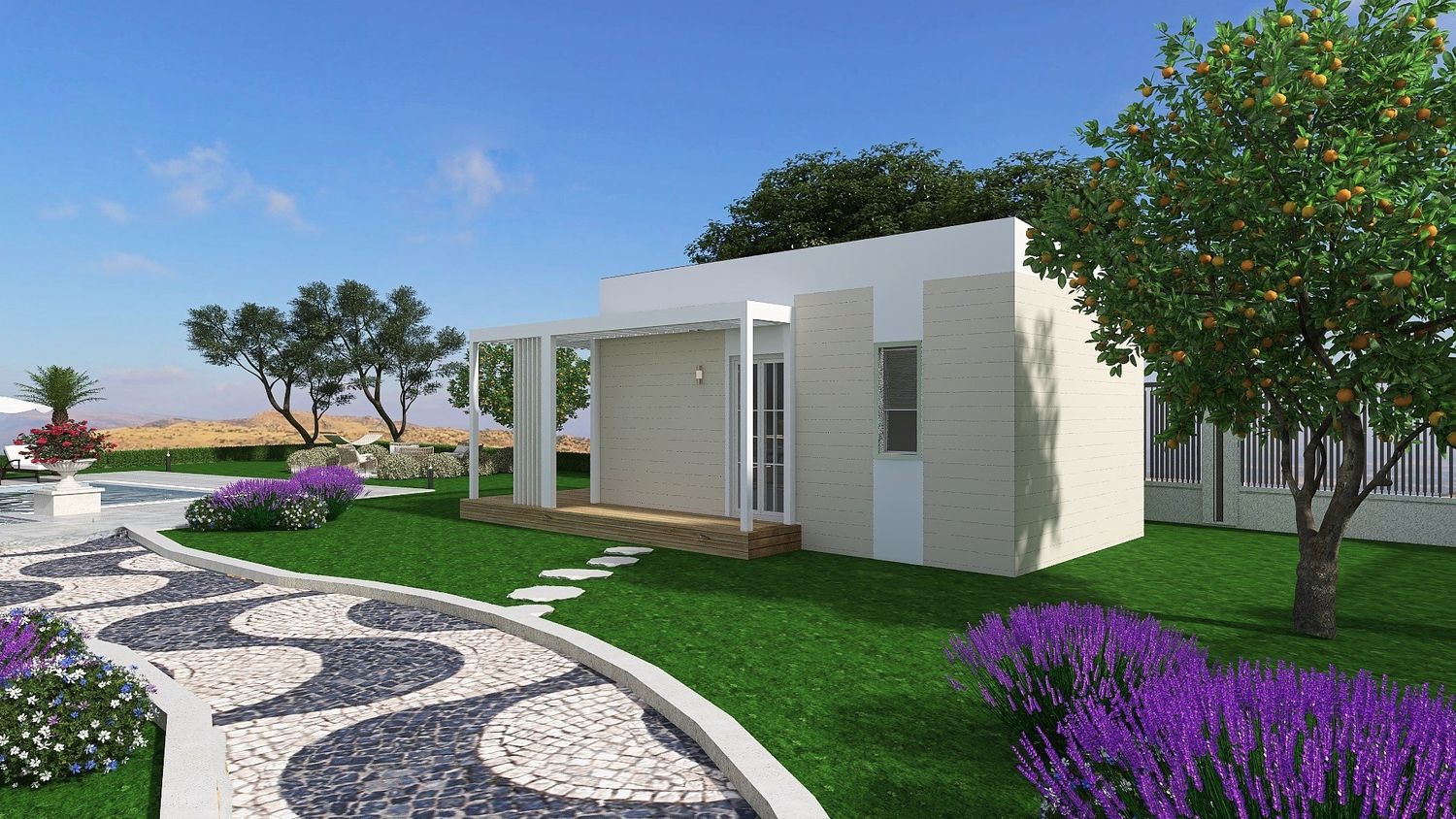 Upon arrival, guests are welcomed into a more intimate zone hosting two accommodation units. These units are conceived as refined adaptations of prefabricated modular structures available on the market, reconfigured to meet your spatial and functional requirements. Their architectural expression is intentionally restrained: finished in soft white and light yellow tones, they are designed to blend gently into the natural surroundings rather than stand out.
