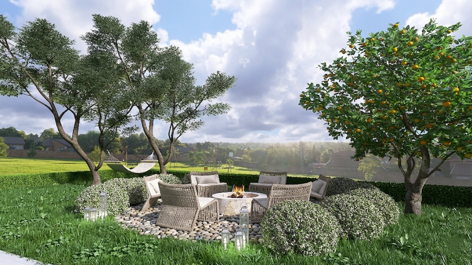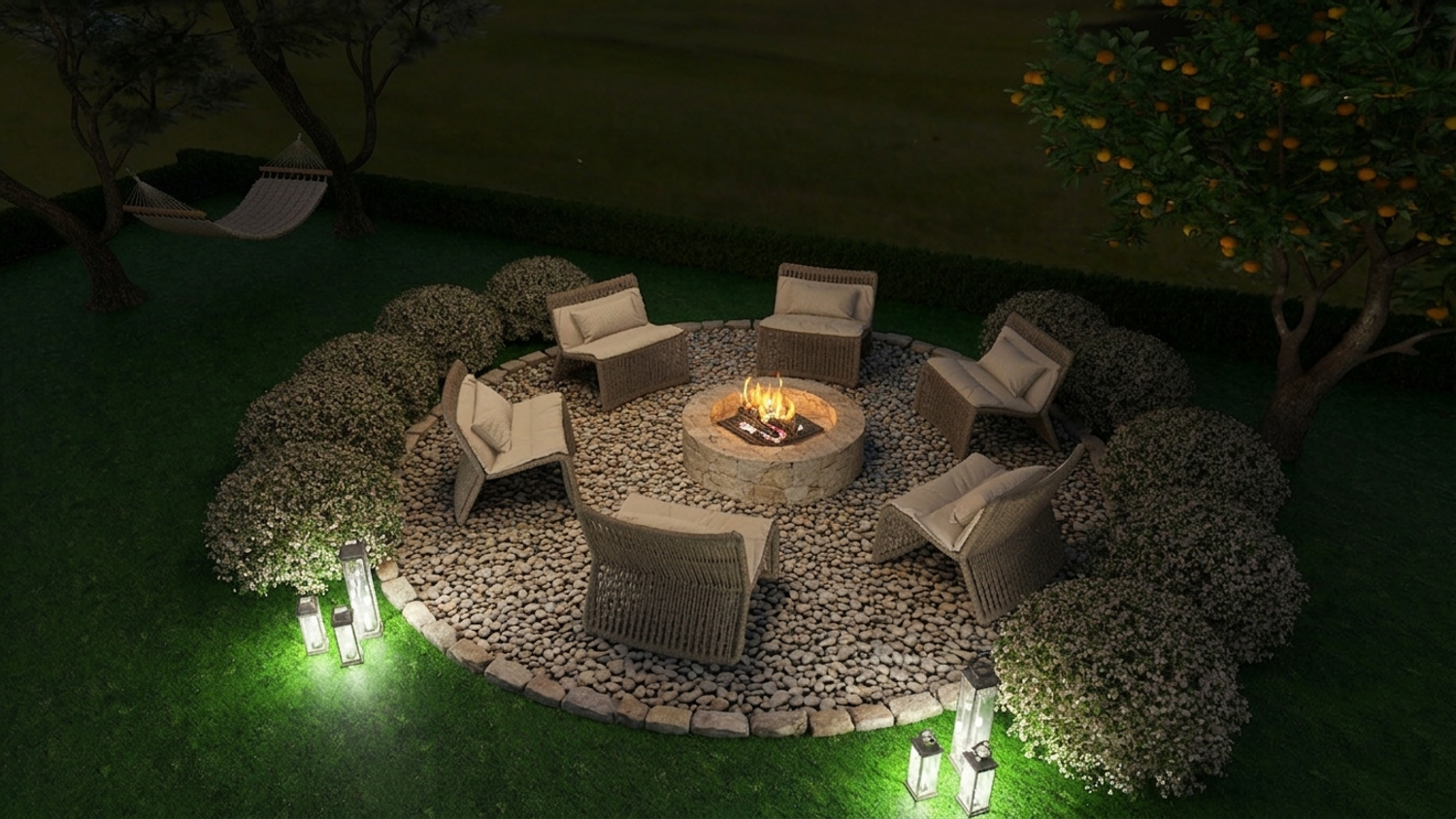 In contrast, the second lounge area offers a quieter, more contemplative setting. Organized around a stone fire pit with informal seating, and complemented by a swing suspended between trees, it provides a space for solitude, reflection, and intimate moments within the landscape.