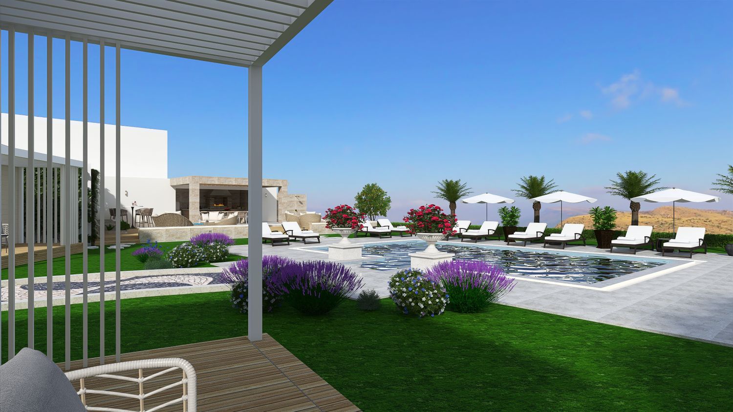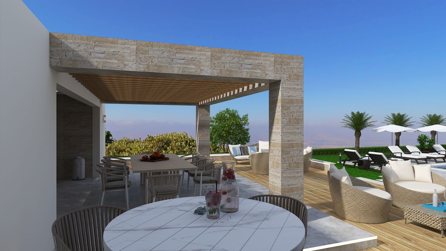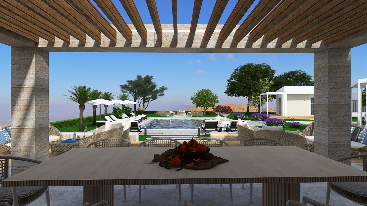 Flanking the pool are two distinct yet complementary zones. On one side, the outdoor living area forms the social heart of the project. Slightly elevated from the natural terrain to maximize views, it is designed as a layered platform accommodating multiple functions: a lounge area, a dining space under a pergola with adjustable shading, and a semi-enclosed outdoor kitchen with barbecue. Supporting amenities, including storage and a guest toilet, are discreetly integrated, alongside an outdoor shower.