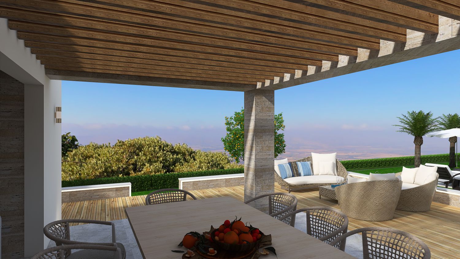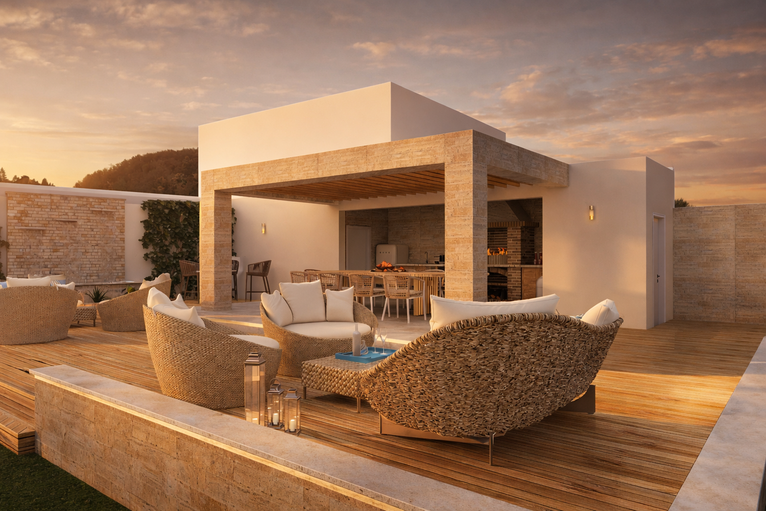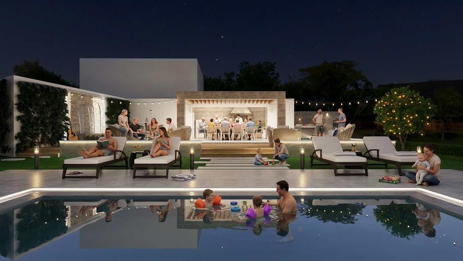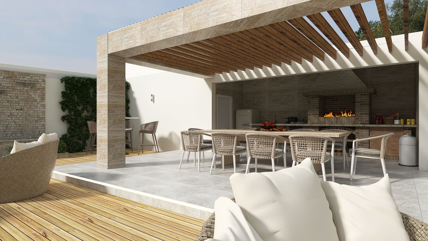 Flanking the pool are two distinct yet complementary zones. On one side, the outdoor living area forms the social heart of the project. Slightly elevated from the natural terrain to maximize views, it is designed as a layered platform accommodating multiple functions: a lounge area, a dining space under a pergola with adjustable shading, and a semi-enclosed outdoor kitchen with barbecue. Supporting amenities, including storage and a guest toilet, are discreetly integrated, alongside an outdoor shower.