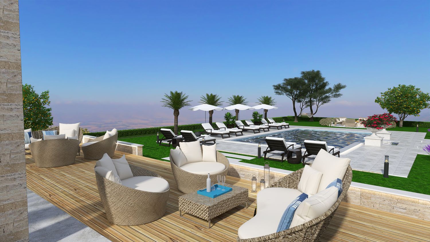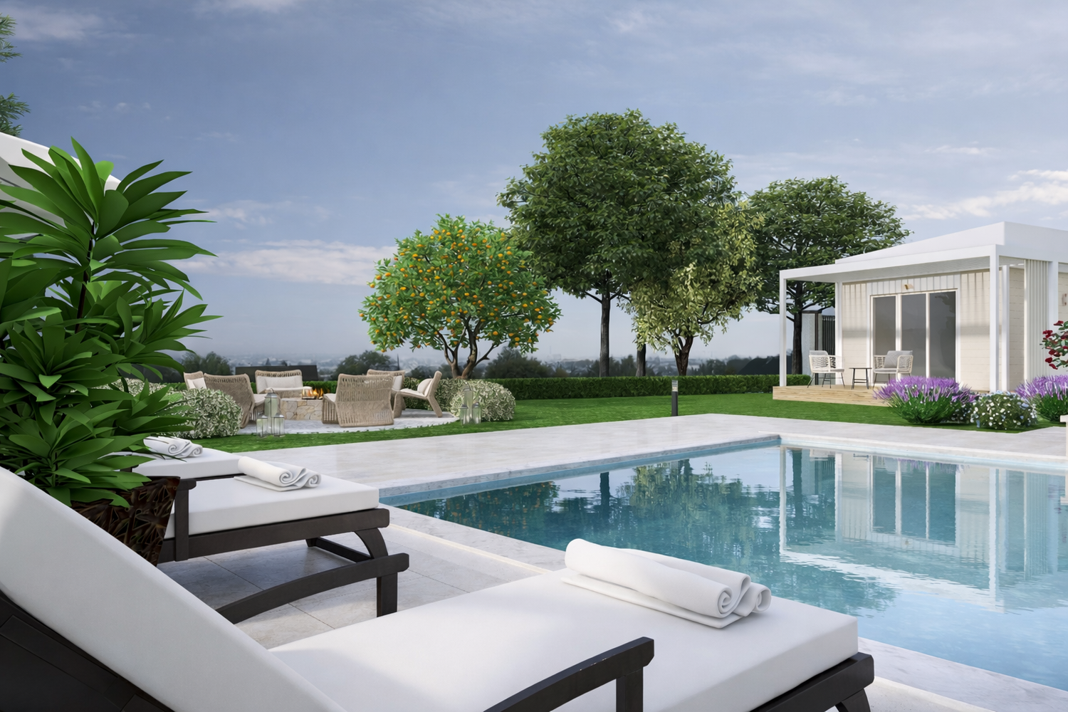 The swimming pool is envisioned as a place of quiet relaxation and visual immersion, oriented to capture the expansive views towards Mount Etna. It is equipped with carefully selected furnishings that support comfort without overwhelming the simplicity of the setting.