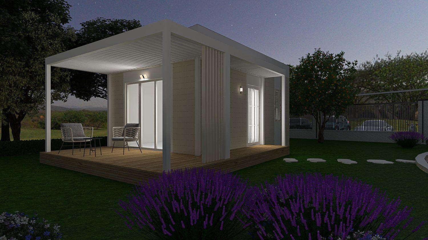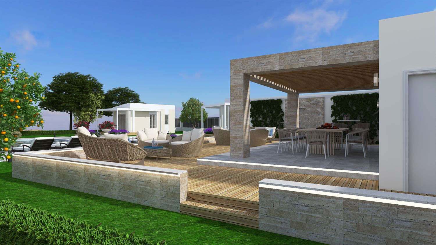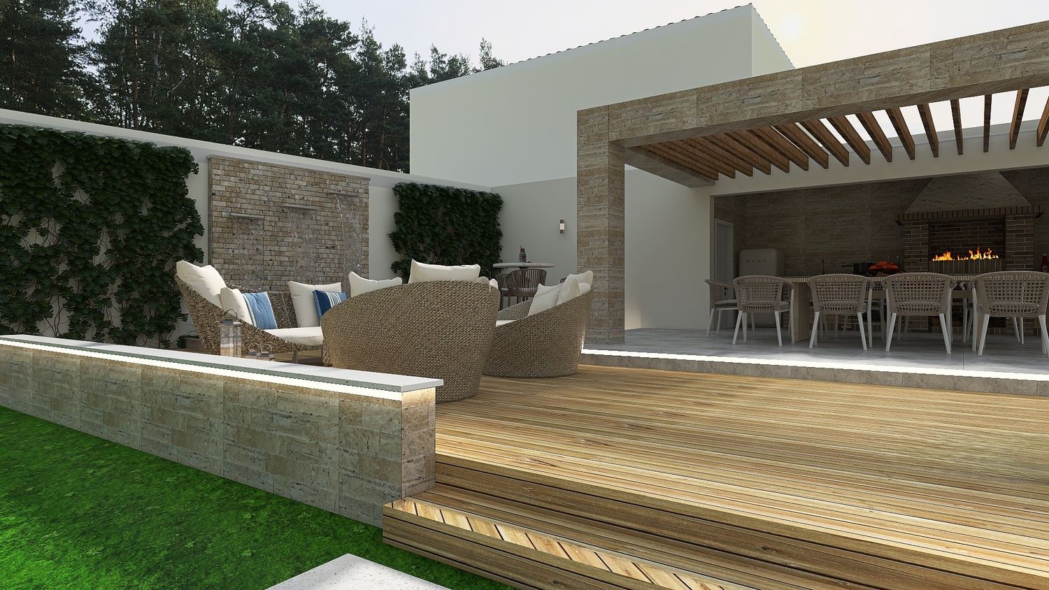 The outdoor living area has also been positioned to allow for a potential future direct connection to the main B&B building, further enhancing spatial continuity; currently, this relationship is established through the pathway extending to the left from the entrance.