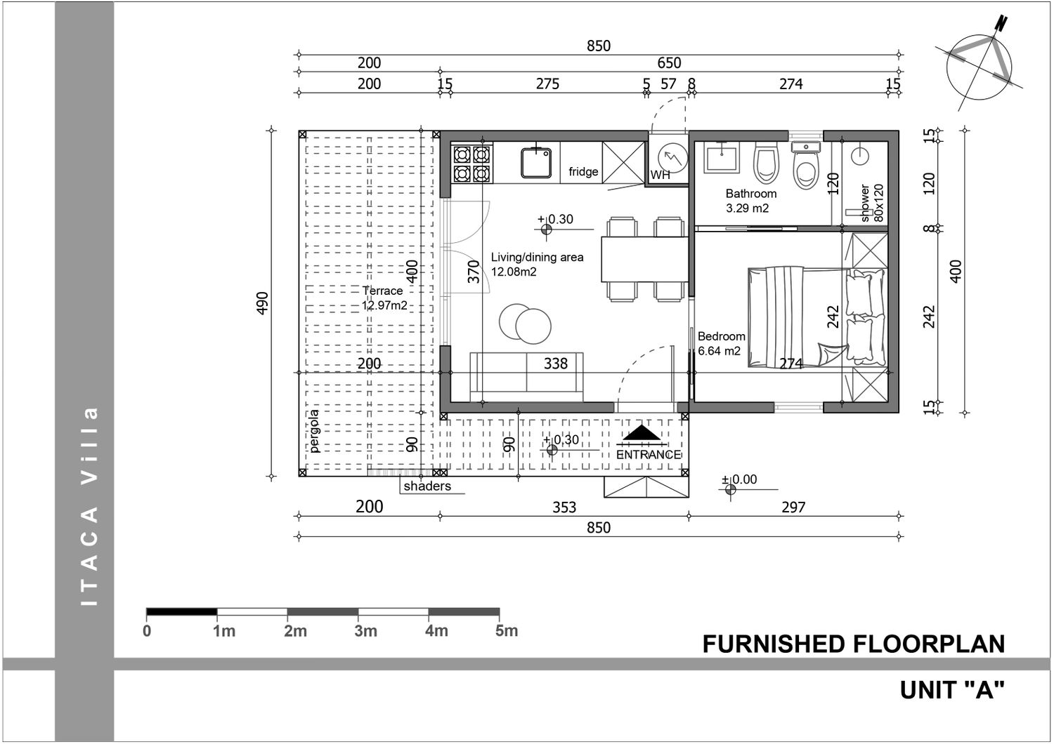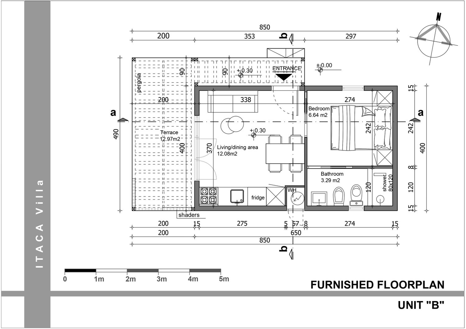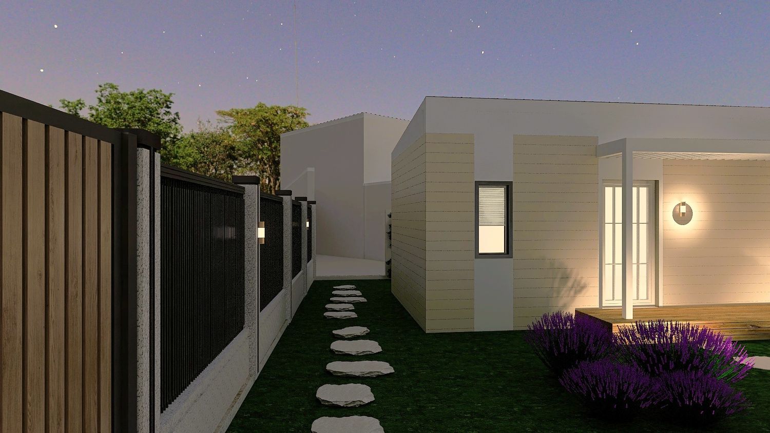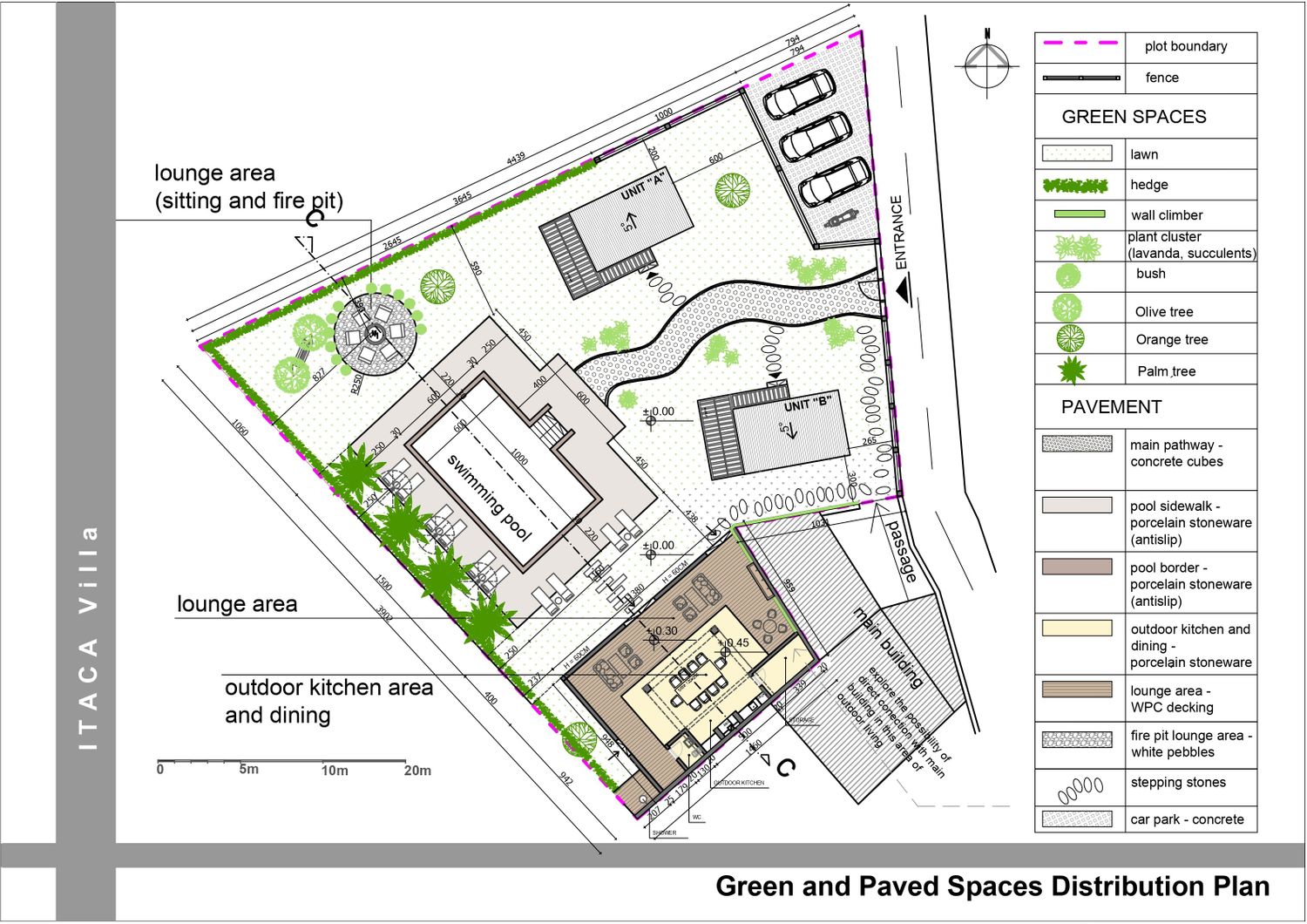 The outdoor living area has also been positioned to allow for a potential future direct connection to the main B&B building, further enhancing spatial continuity; currently, this relationship is established through the pathway extending to the left from the entrance.