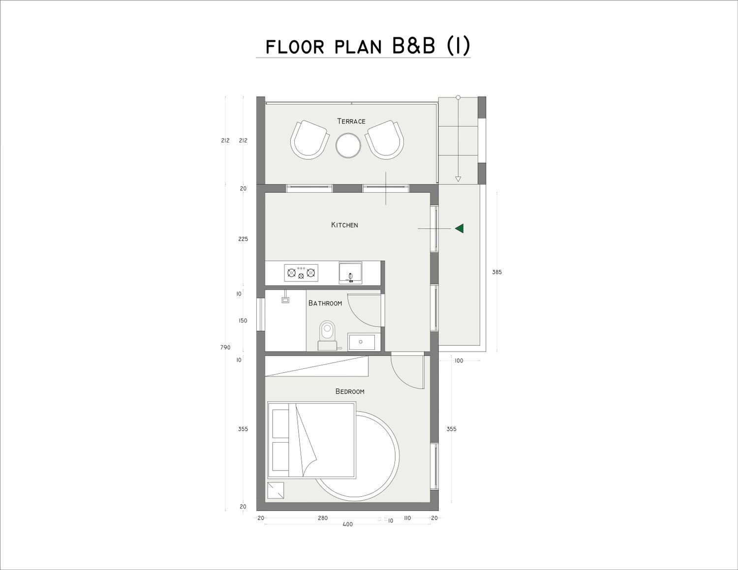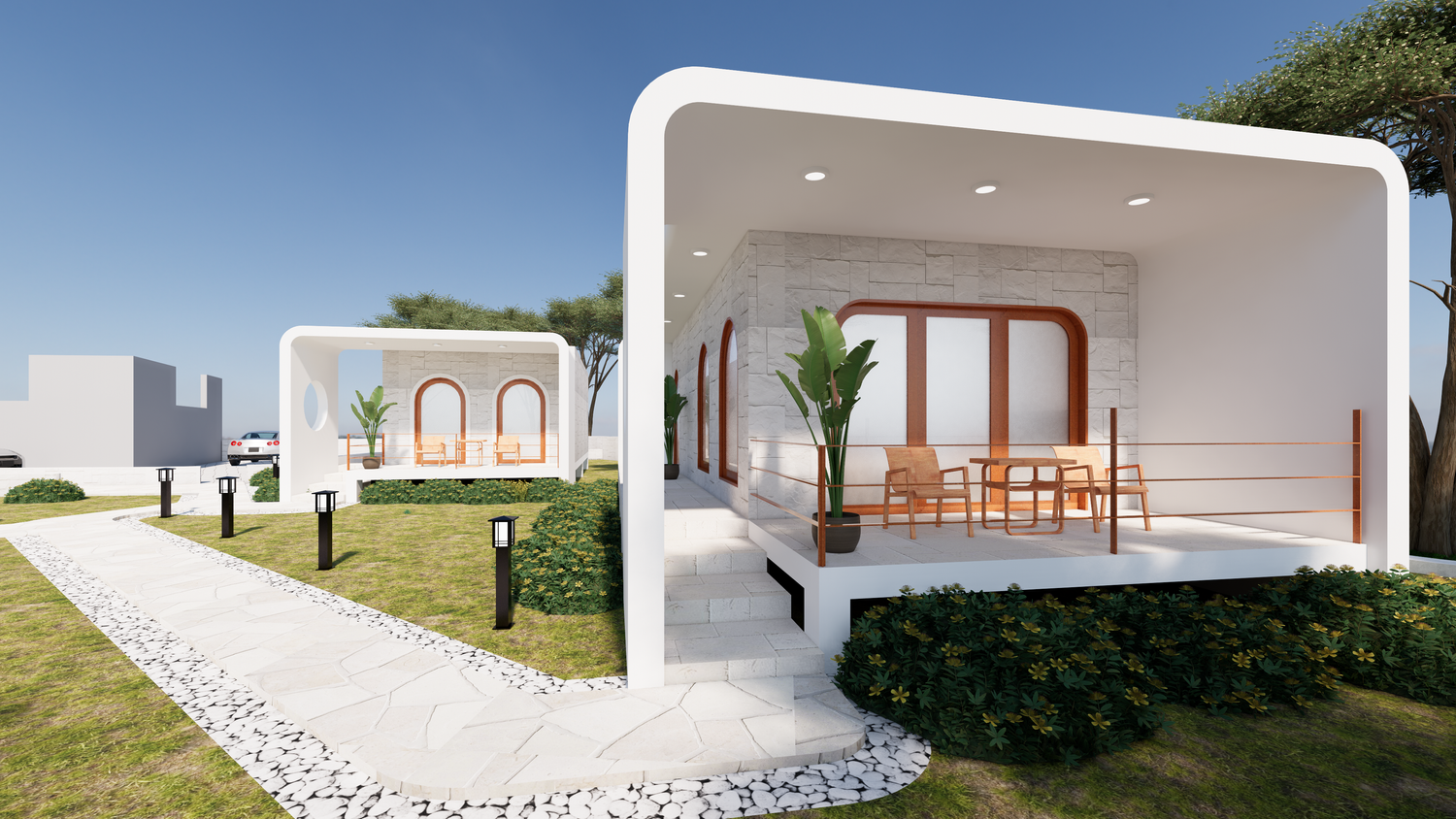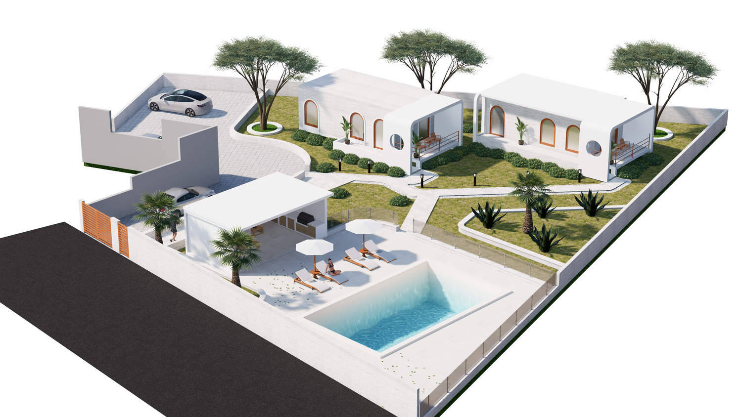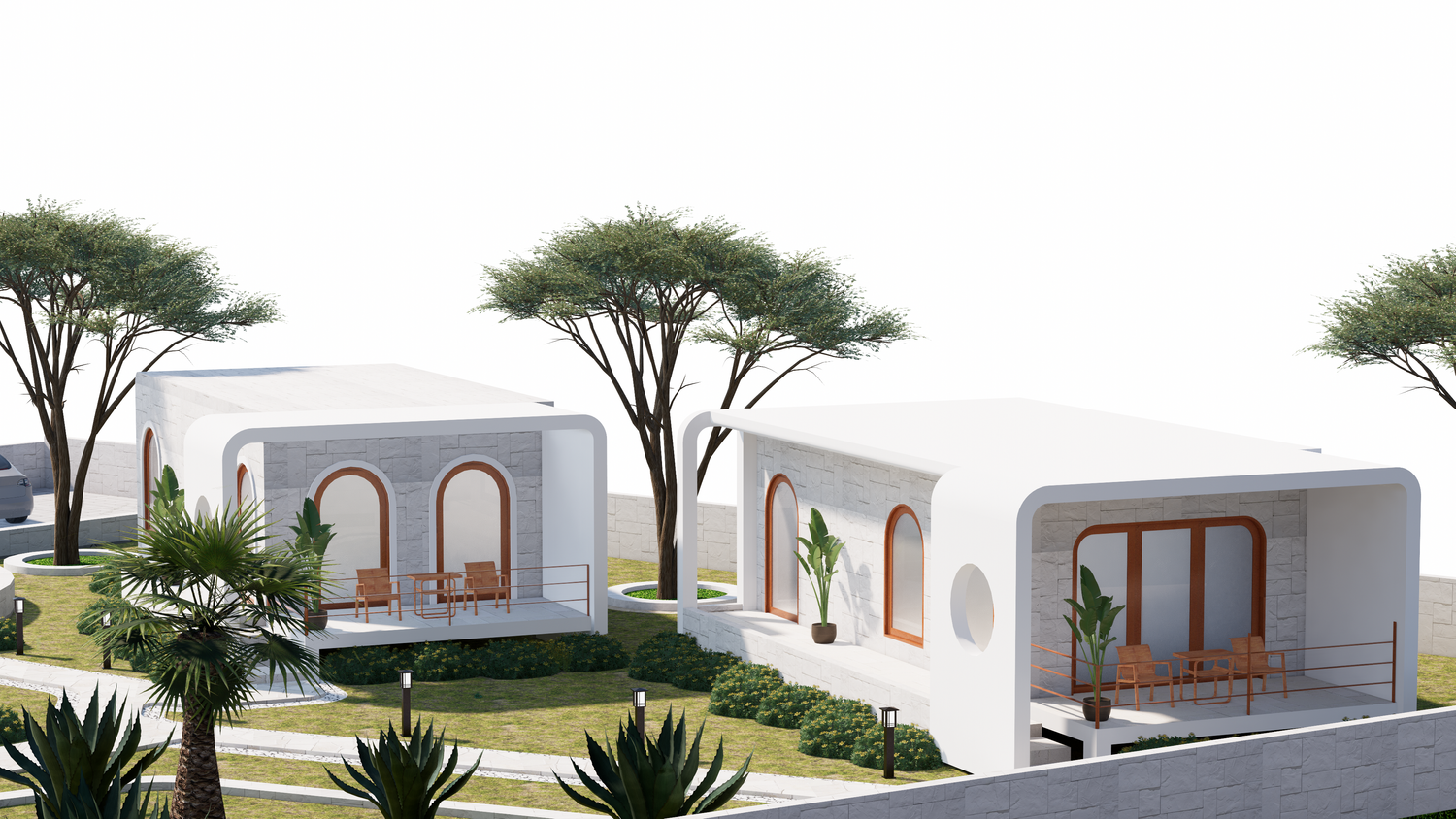 Thank you for this great project. I created two 30m2 B&Bs. Both feature the same space, but with different layouts: a bedroom, bathroom, kitchen, and terrace facing the mountain. However, the door and bedroom are positioned differently, as are the exterior designs. This was done to provide two attractive options.