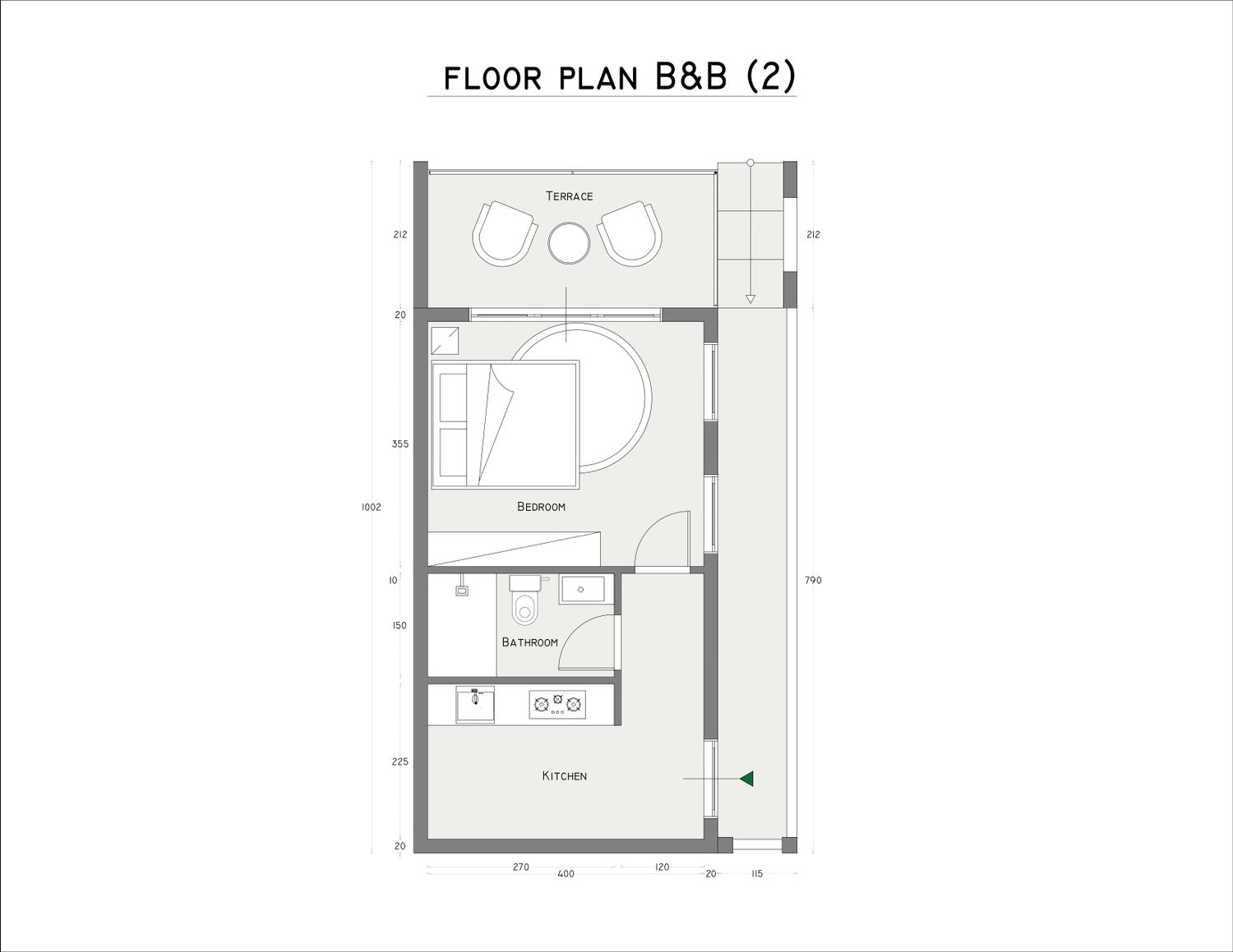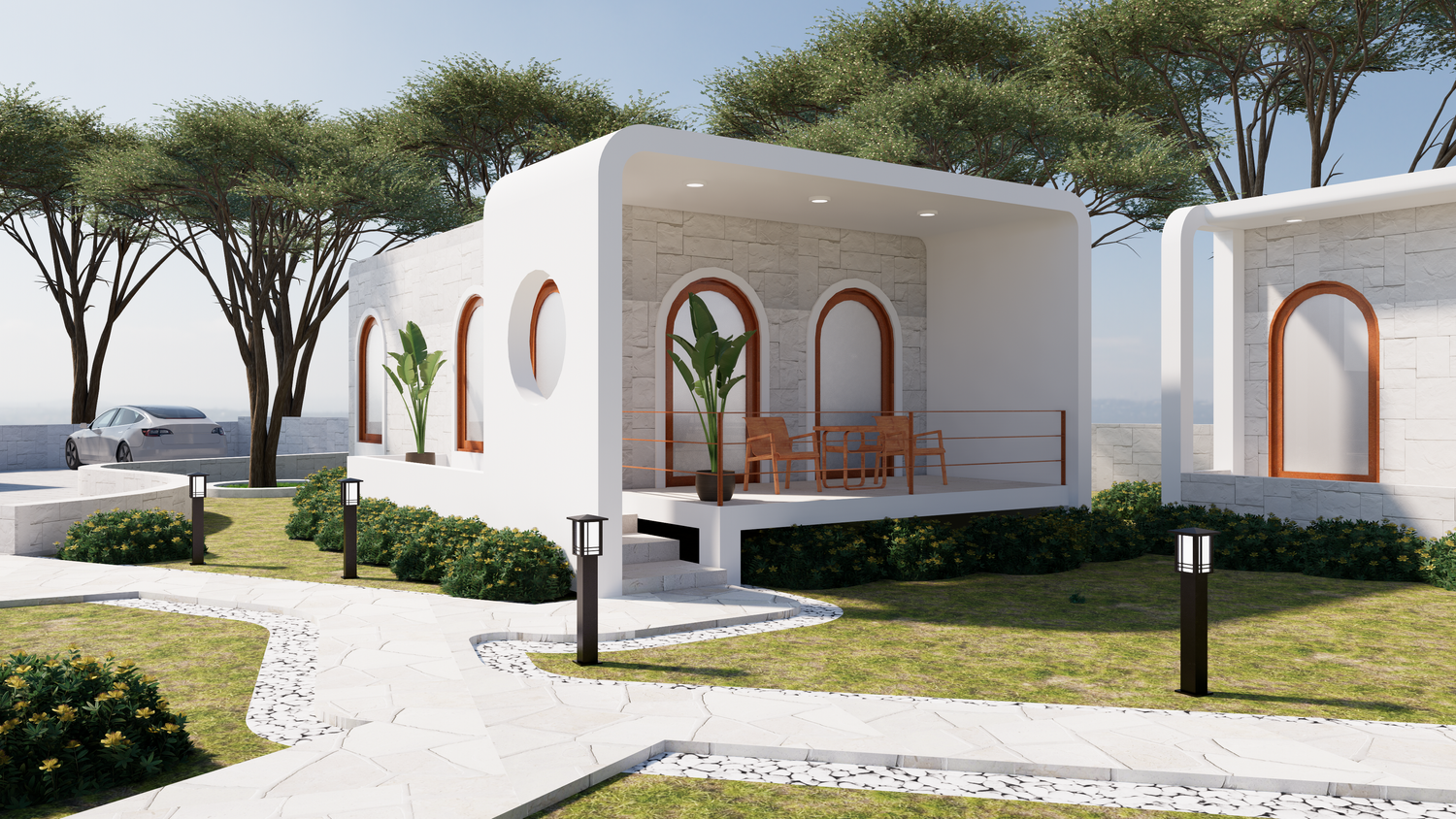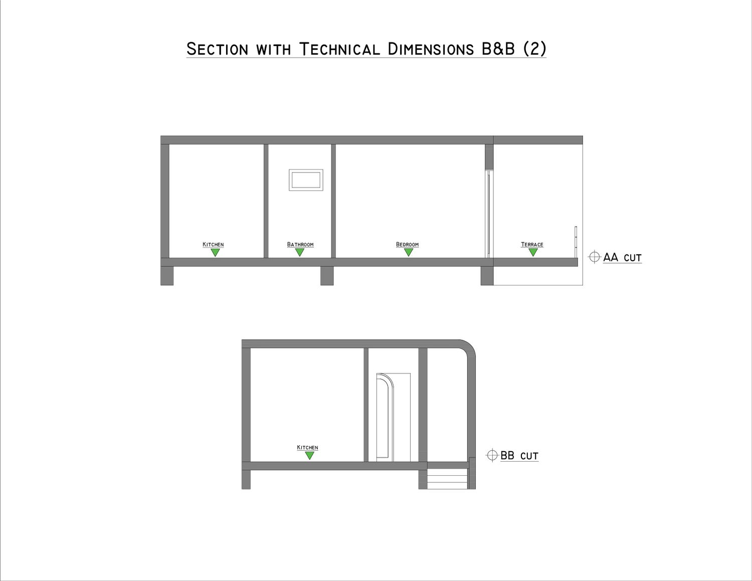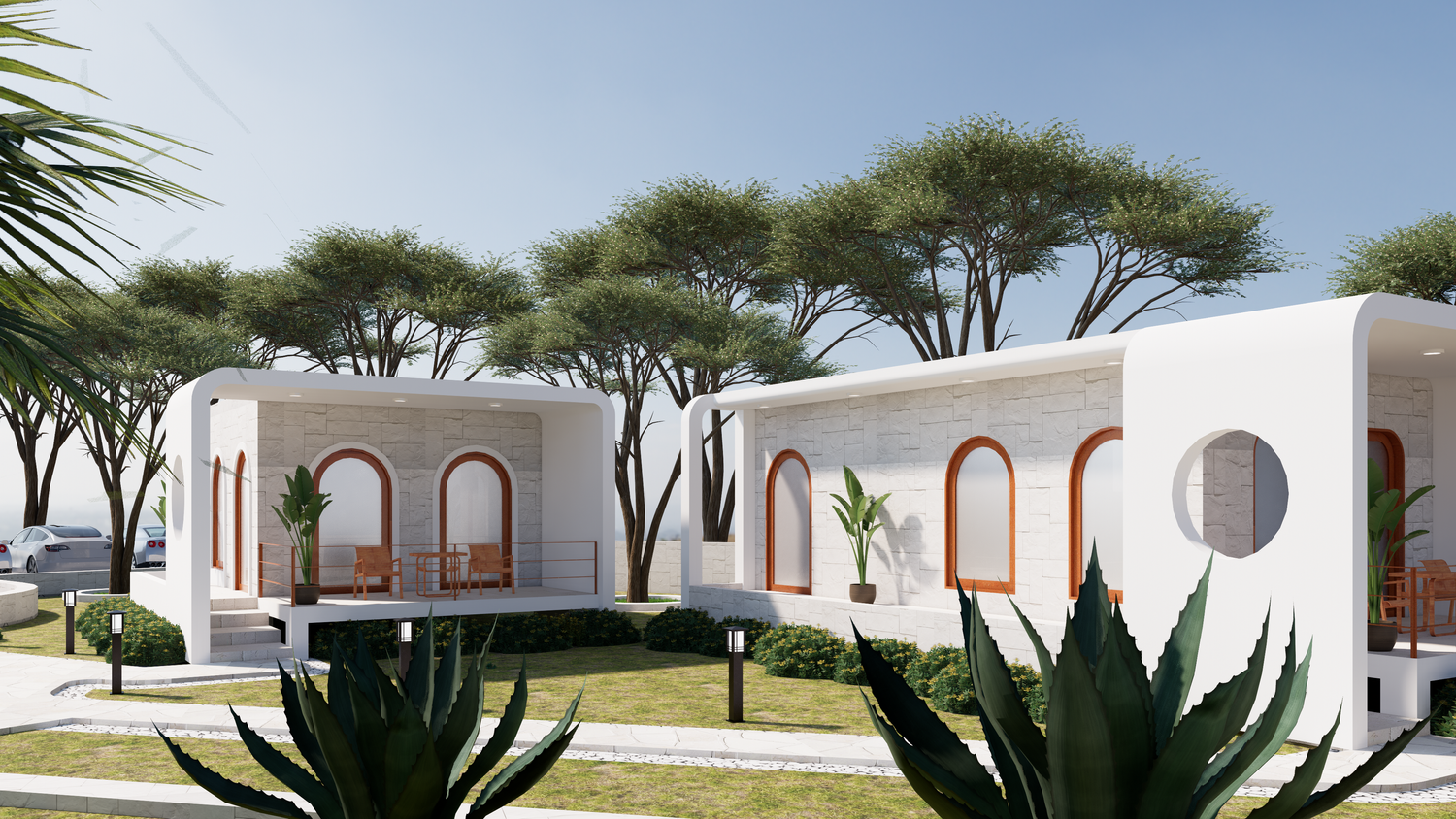 Thank you for this great project. I created two 30m2 B&Bs. Both feature the same space, but with different layouts: a bedroom, bathroom, kitchen, and terrace facing the mountain. However, the door and bedroom are positioned differently, as are the exterior designs. This was done to provide two attractive options.
