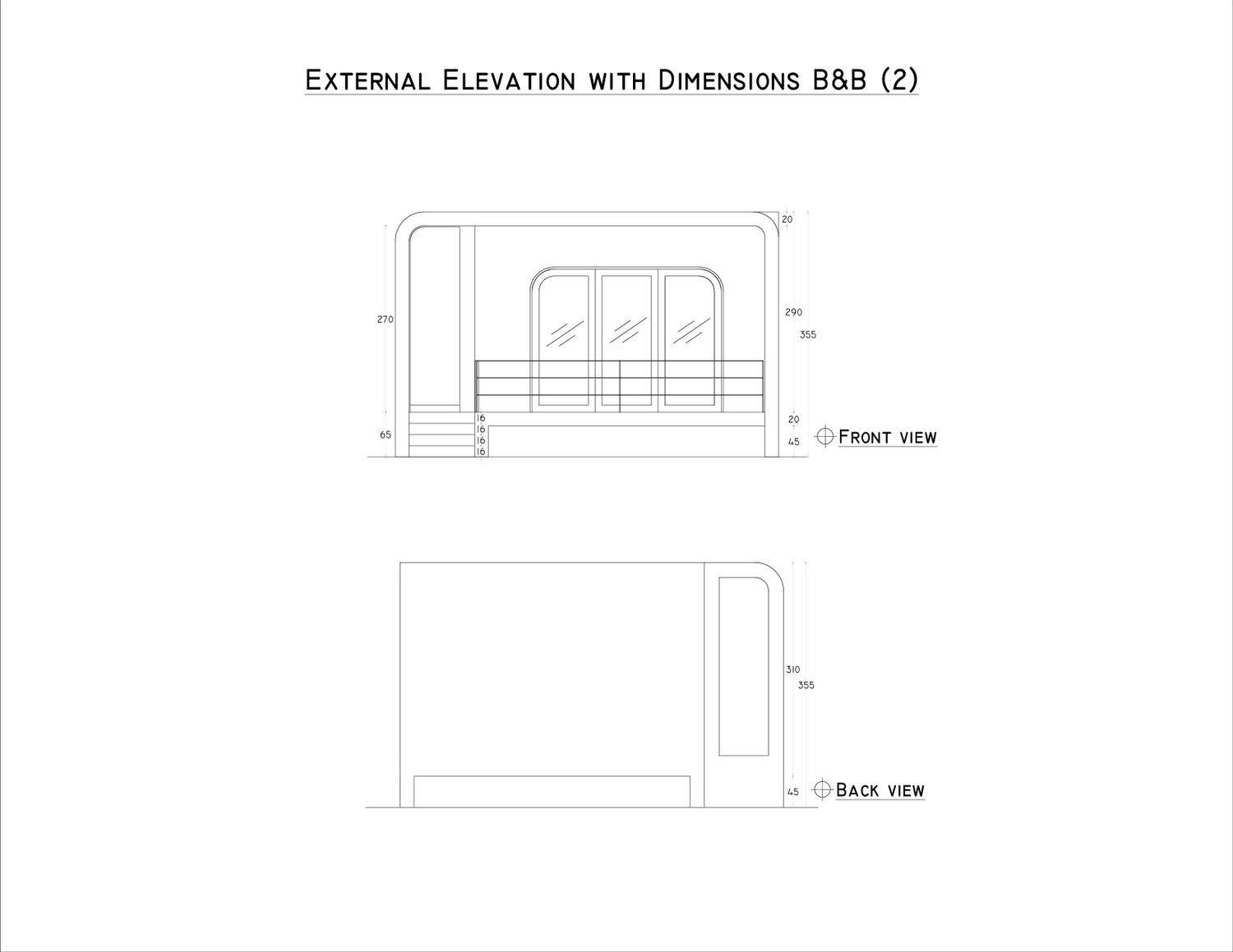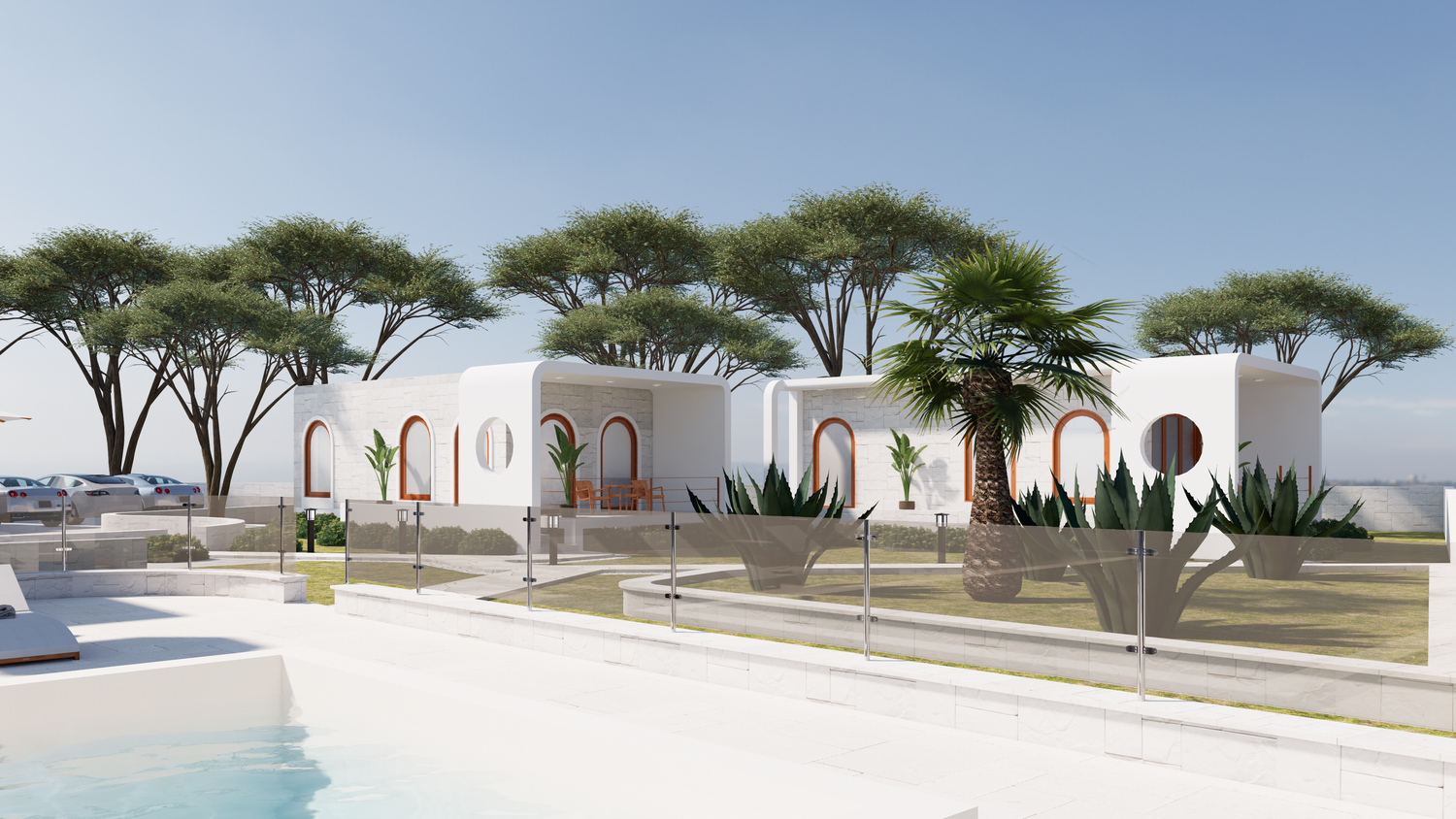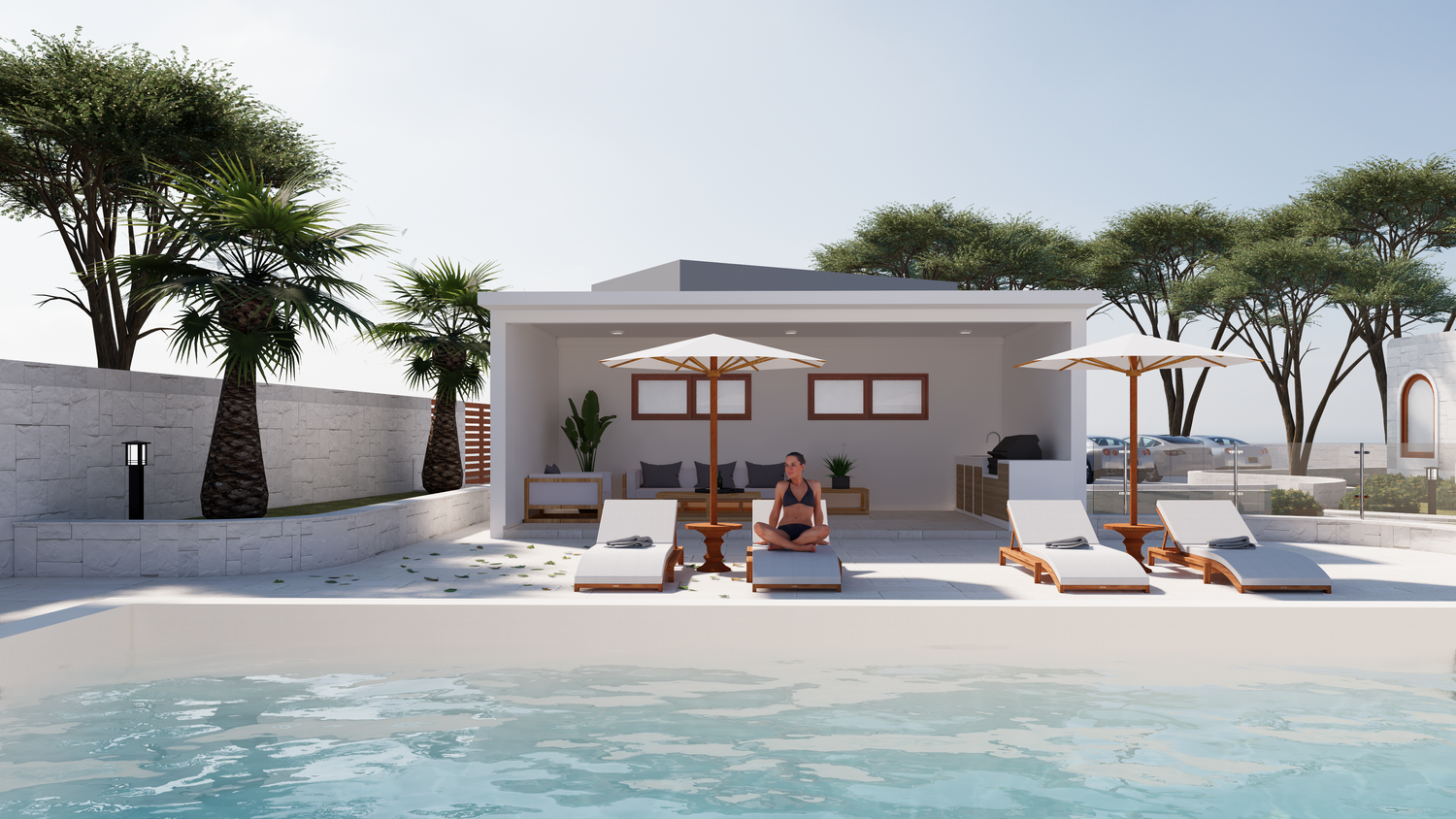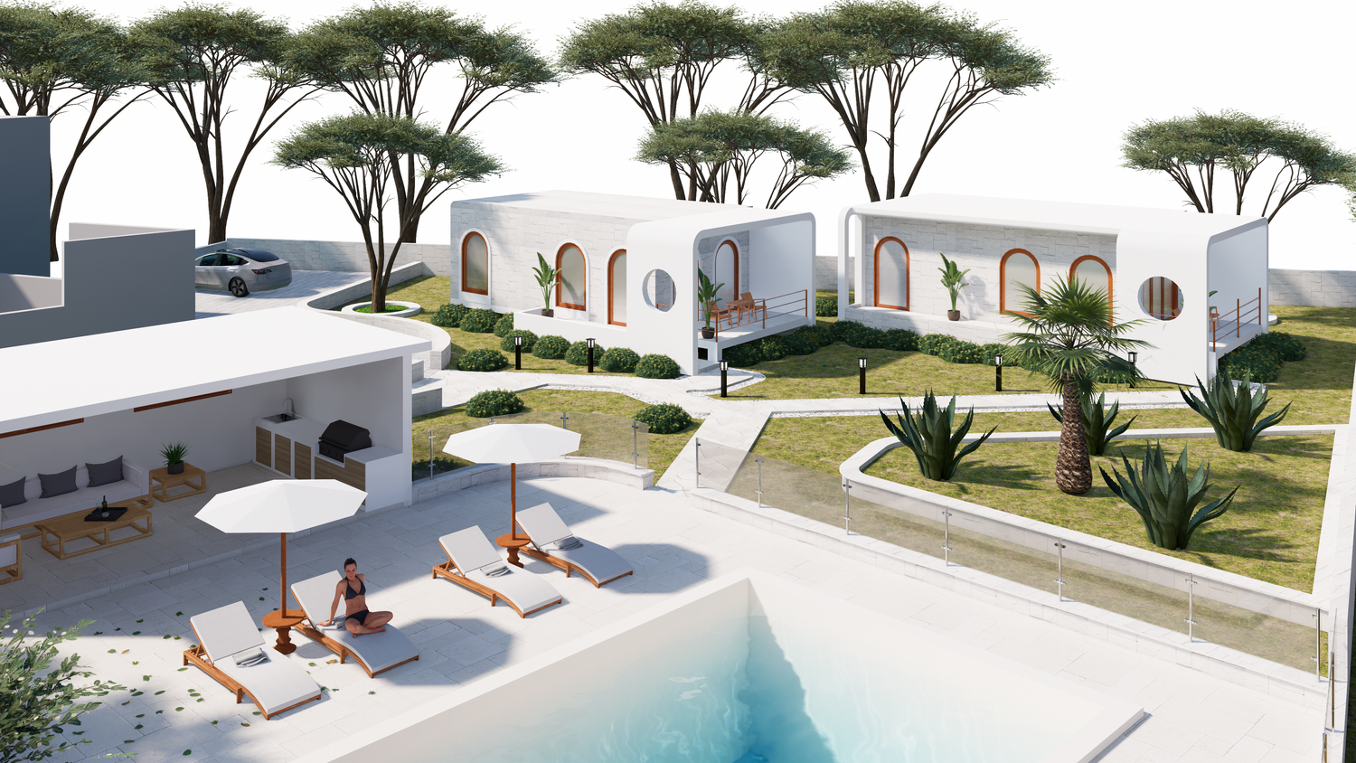 Thank you for this great project. I created two 30m2 B&Bs. Both feature the same space, but with different layouts: a bedroom, bathroom, kitchen, and terrace facing the mountain. However, the door and bedroom are positioned differently, as are the exterior designs. This was done to provide two attractive options.