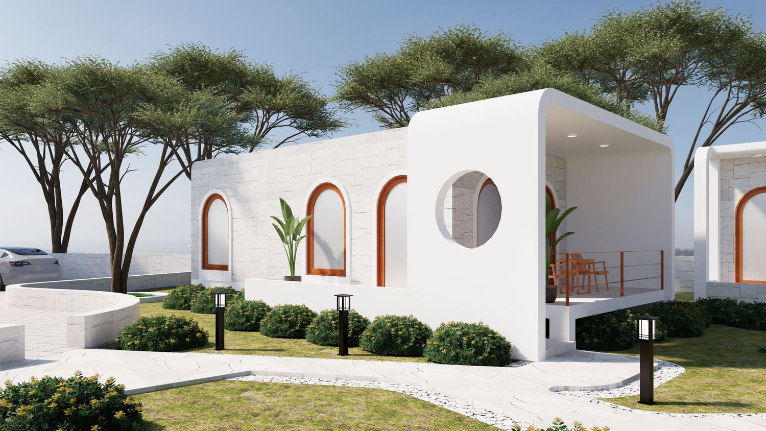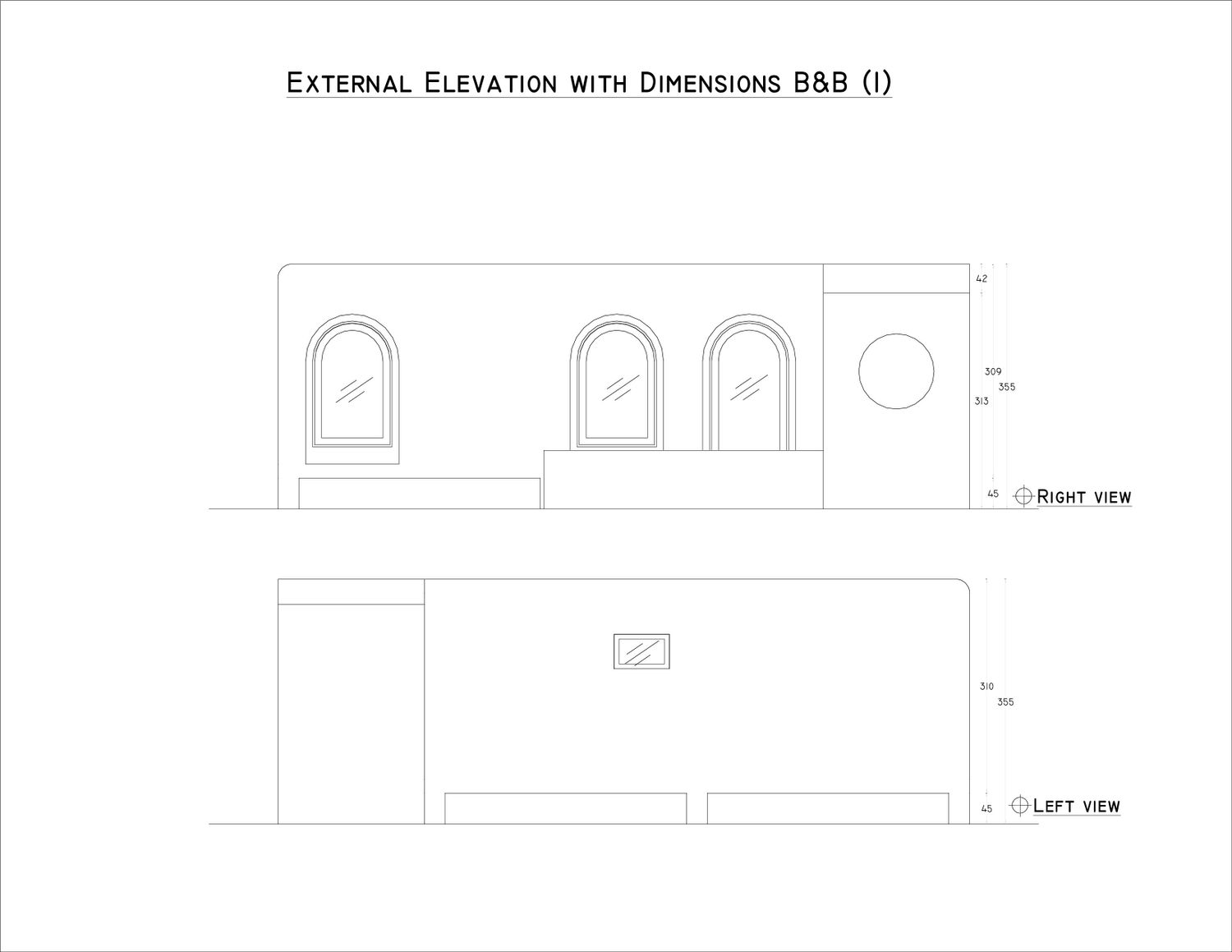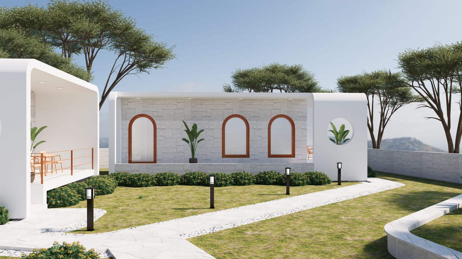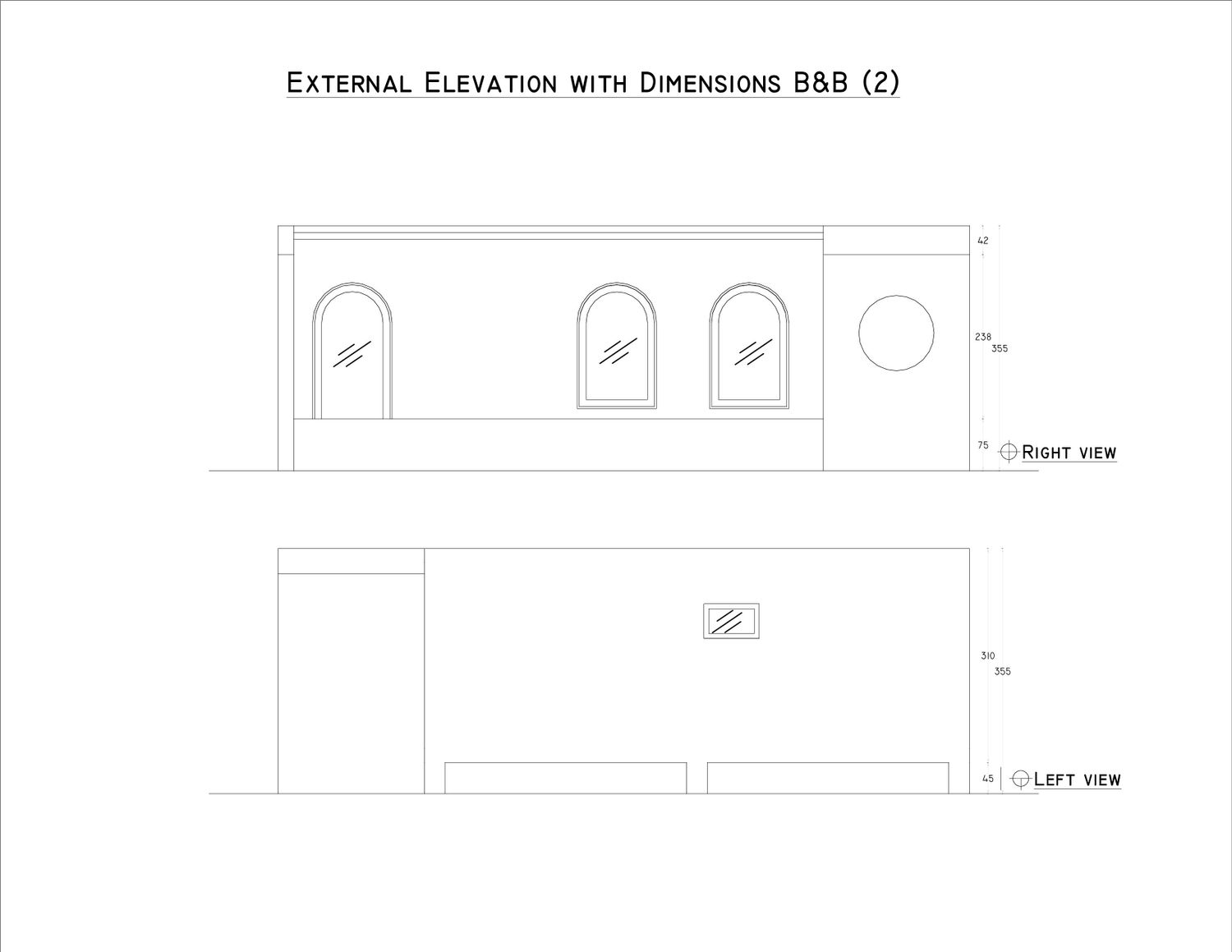 The design combines modern and traditional, with a clean design combined with curved doors and windows. Natural stone finishes are used on the exterior to add a traditional feel to the B&B.