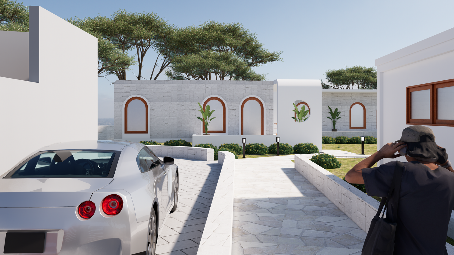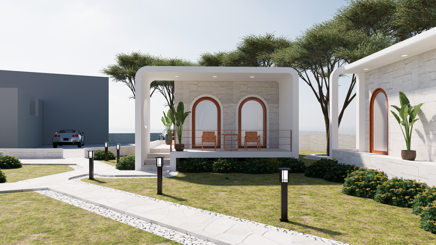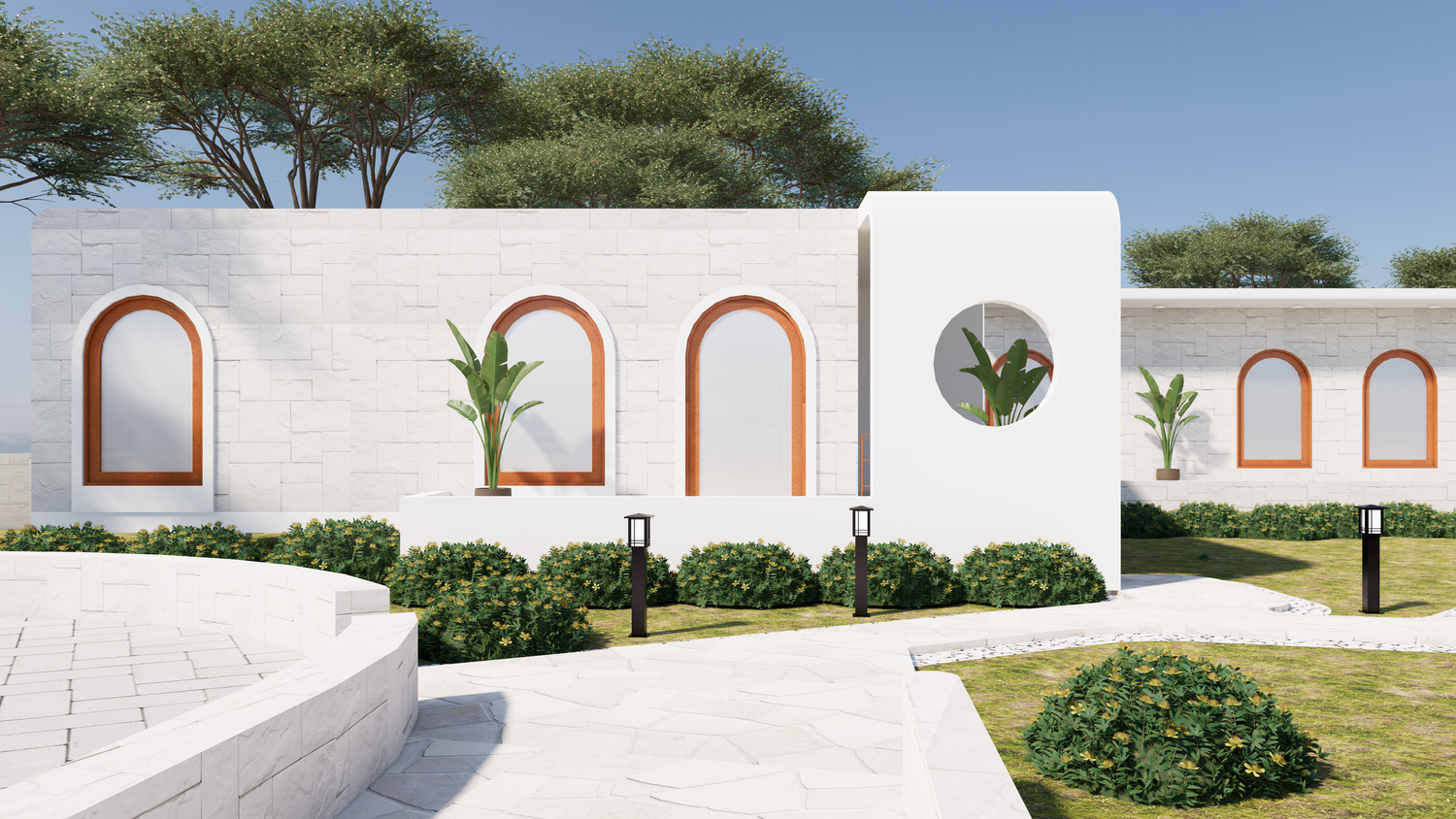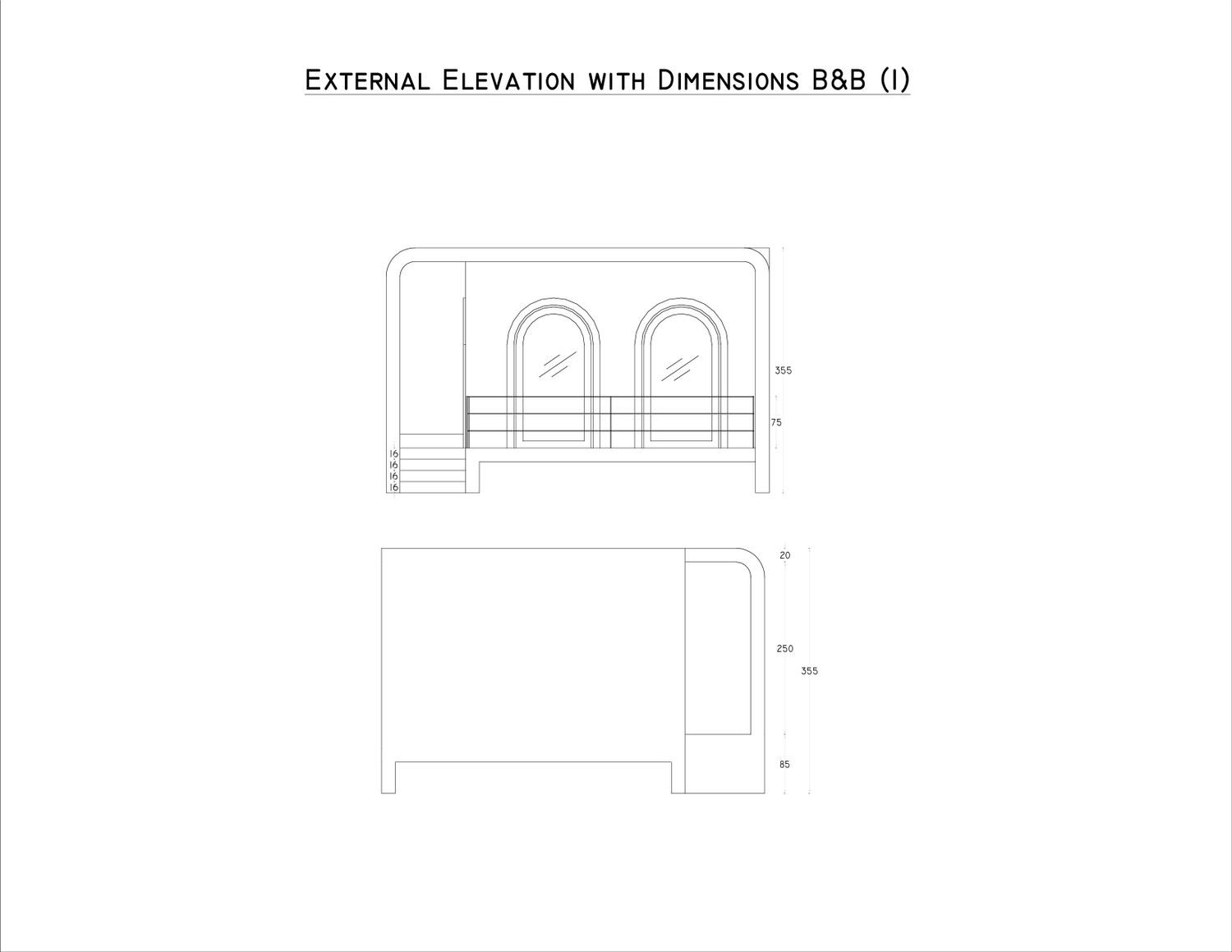 The design combines modern and traditional, with a clean design combined with curved doors and windows. Natural stone finishes are used on the exterior to add a traditional feel to the B&B.