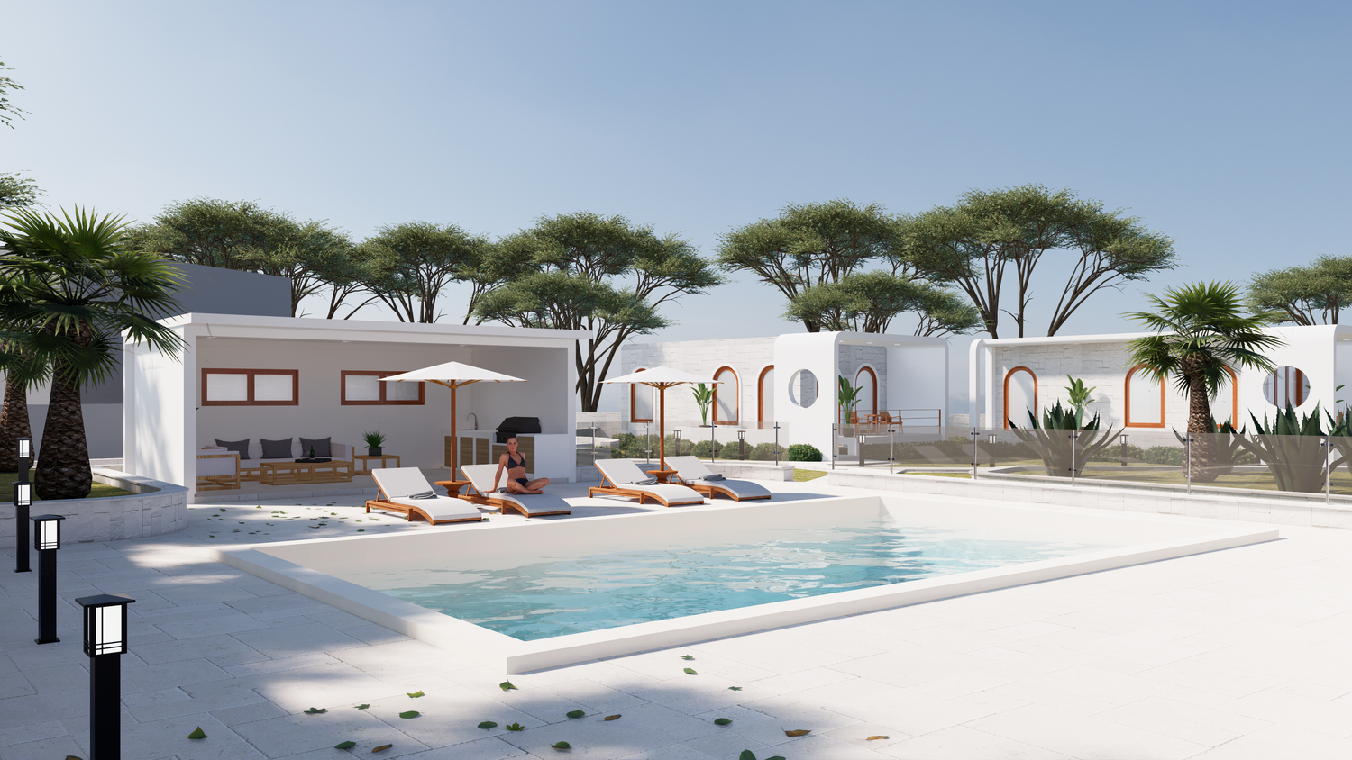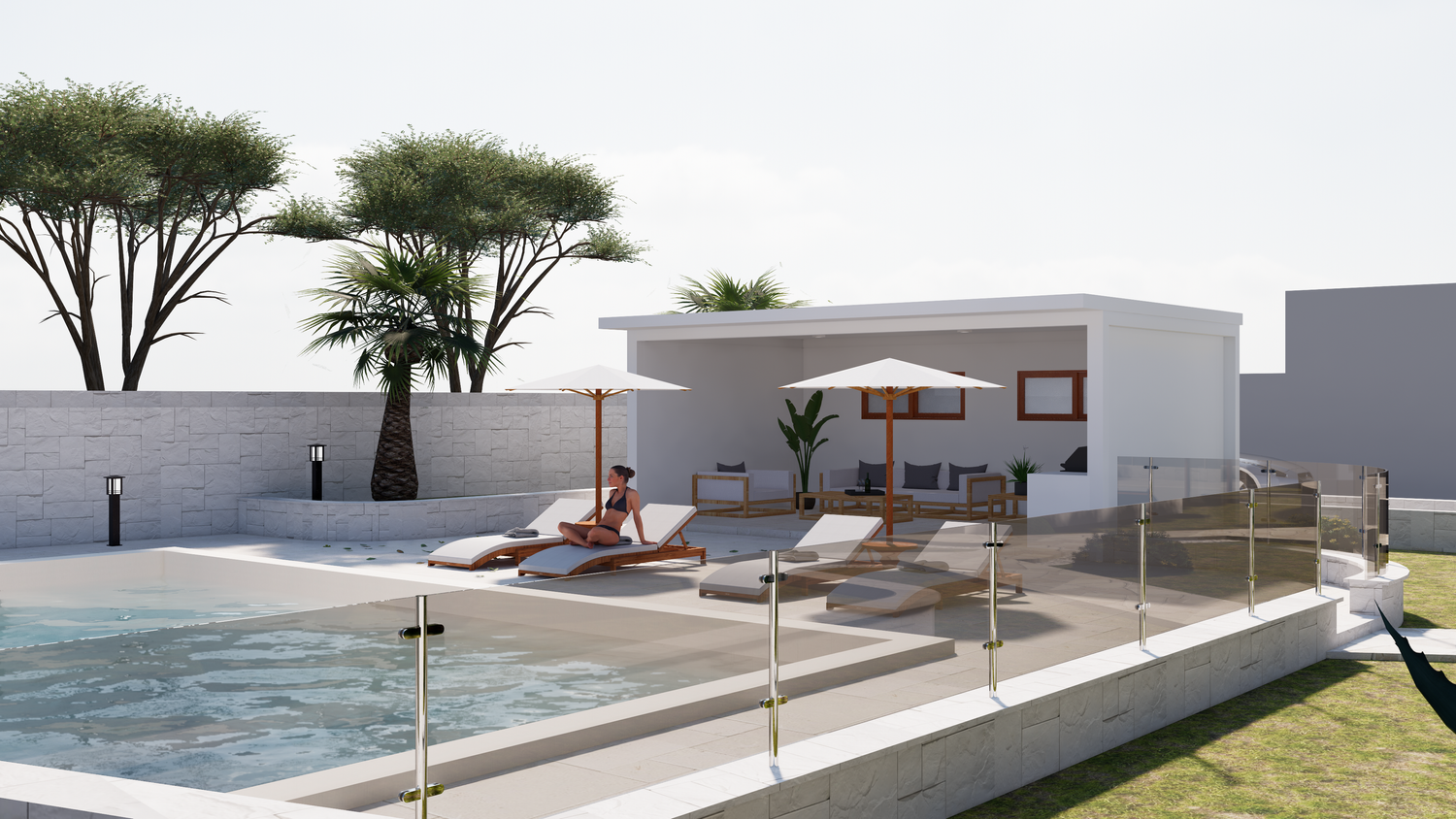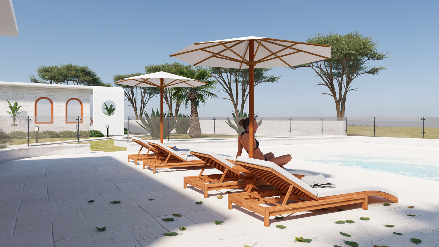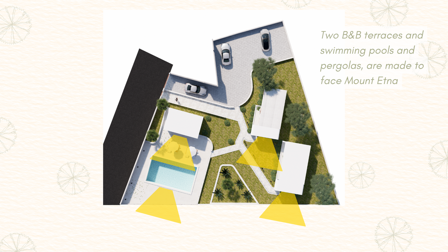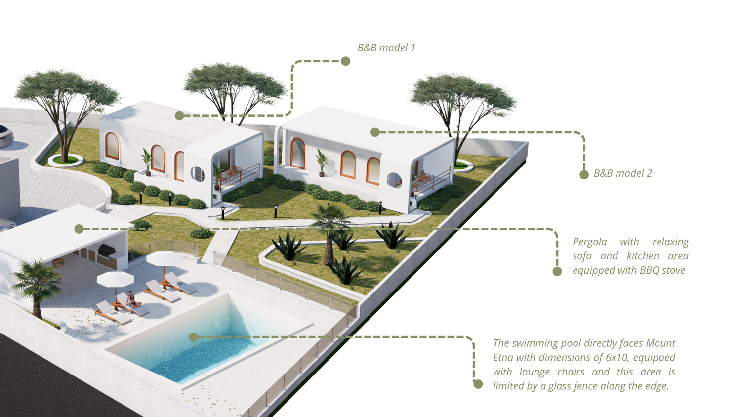The 6x10 meter swimming pool is surrounded by a glass fence. It directly faces Mount Etna. There is also a pergola equipped with a BBQ grill and a relaxing area.