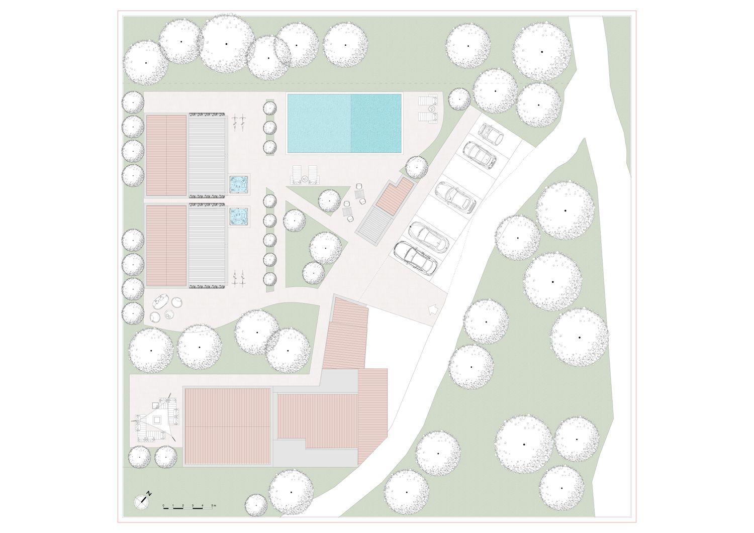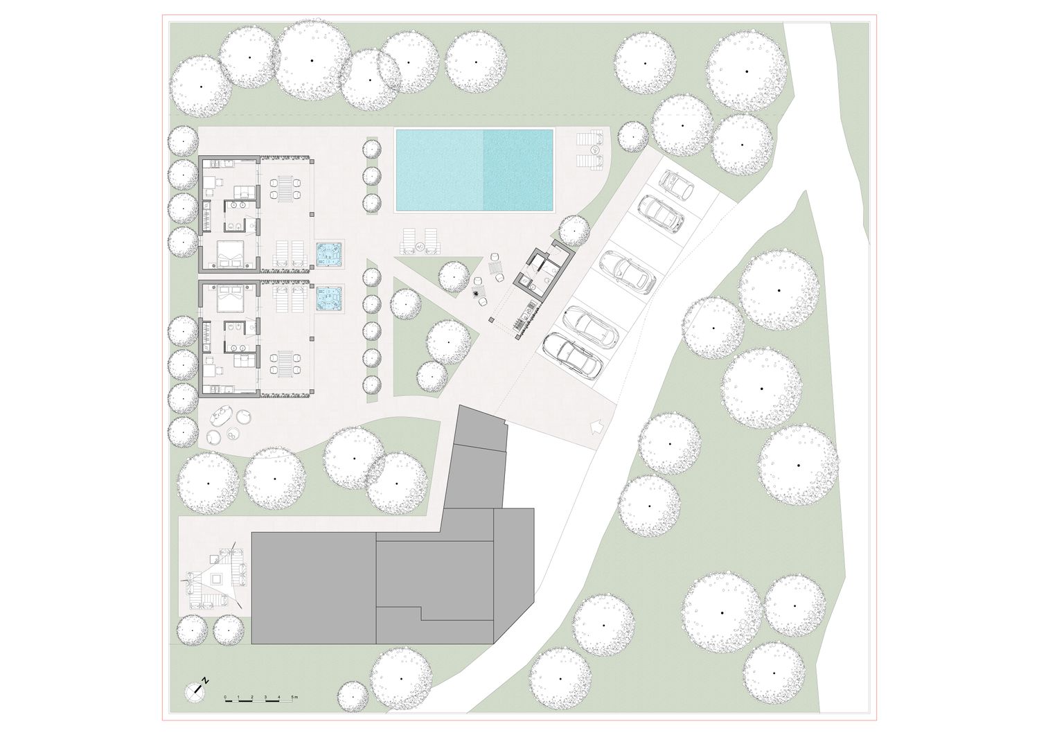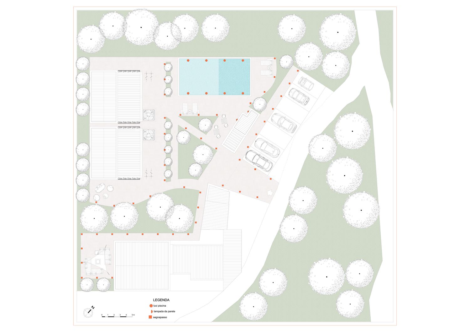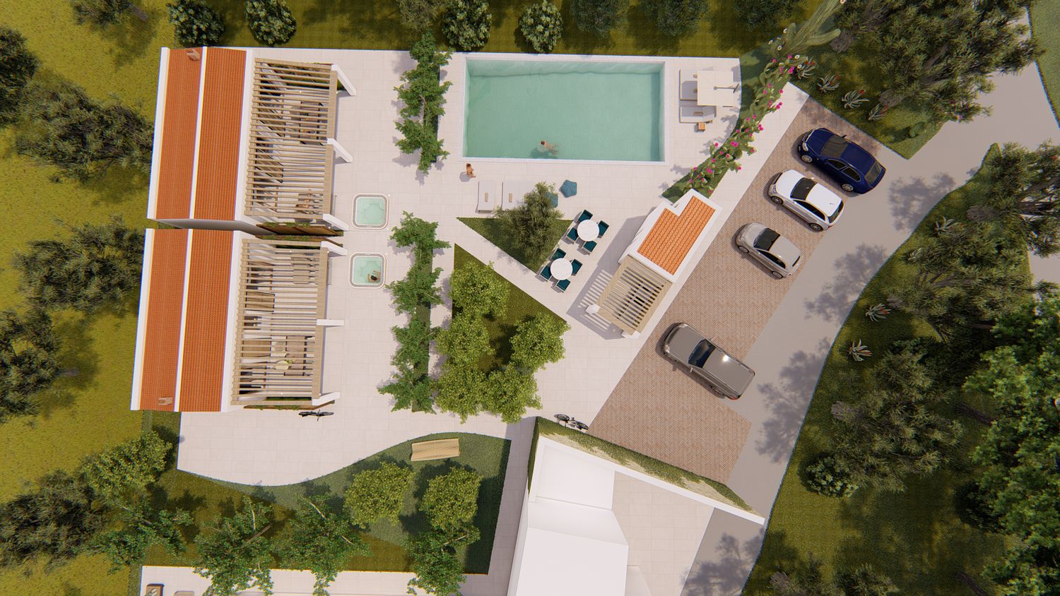 Le aree verdi avranno linee sinuose e morbide, con il solo inserimento geometrico e squadrato dei due volumi delle suite, del vuoto della piscina, e di un piccolo spazio multifunzione contenente un pergolato con cucina/barbecue outdoor, locale bagno a servizio dell'area outdoor e del solarium, piccolo vano ripostiglio e locale tecnico di utilità per la struttura.