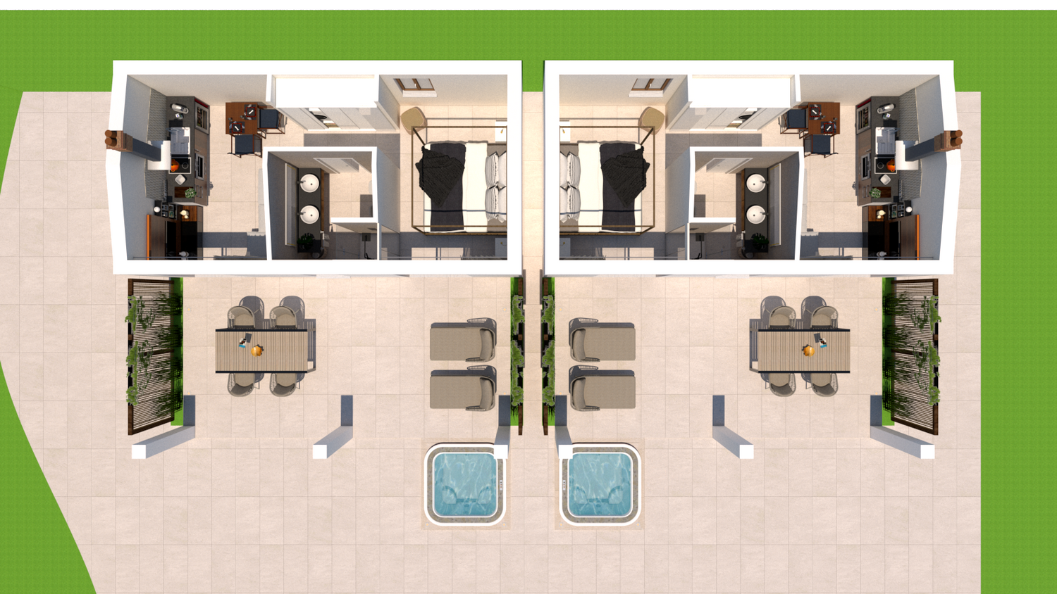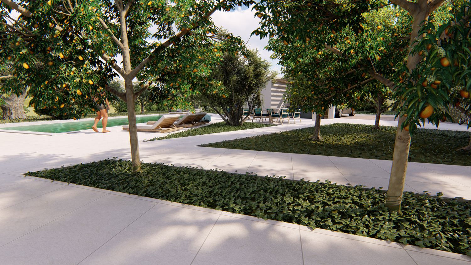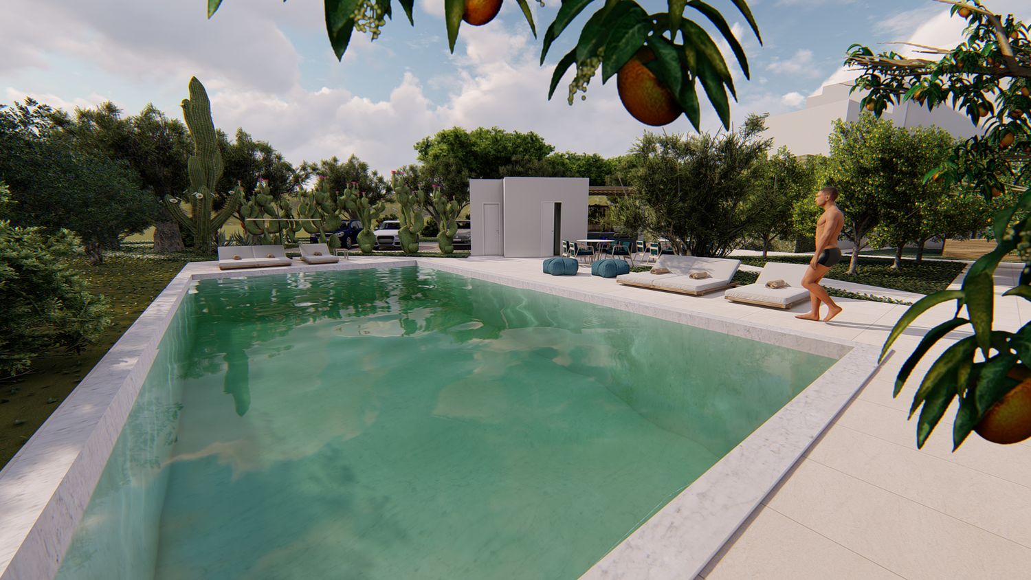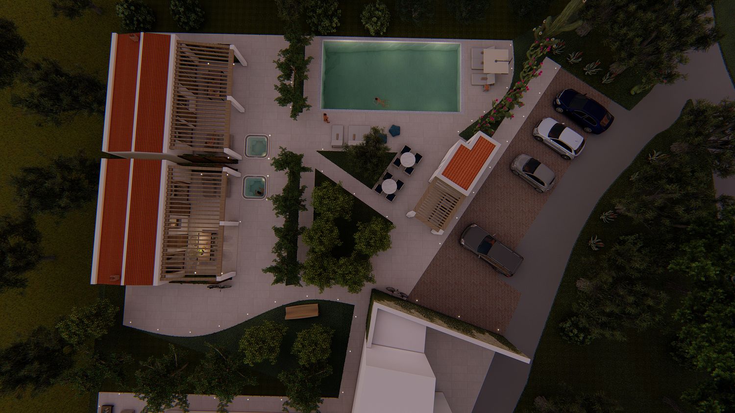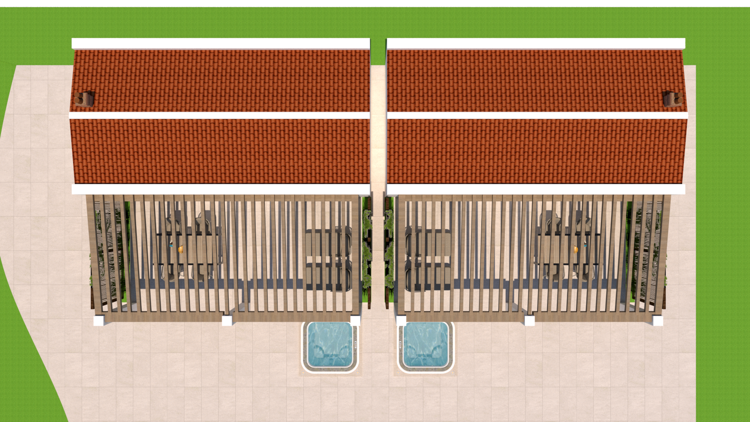 Le aree verdi avranno linee sinuose e morbide, con il solo inserimento geometrico e squadrato dei due volumi delle suite, del vuoto della piscina, e di un piccolo spazio multifunzione contenente un pergolato con cucina/barbecue outdoor, locale bagno a servizio dell'area outdoor e del solarium, piccolo vano ripostiglio e locale tecnico di utilità per la struttura.