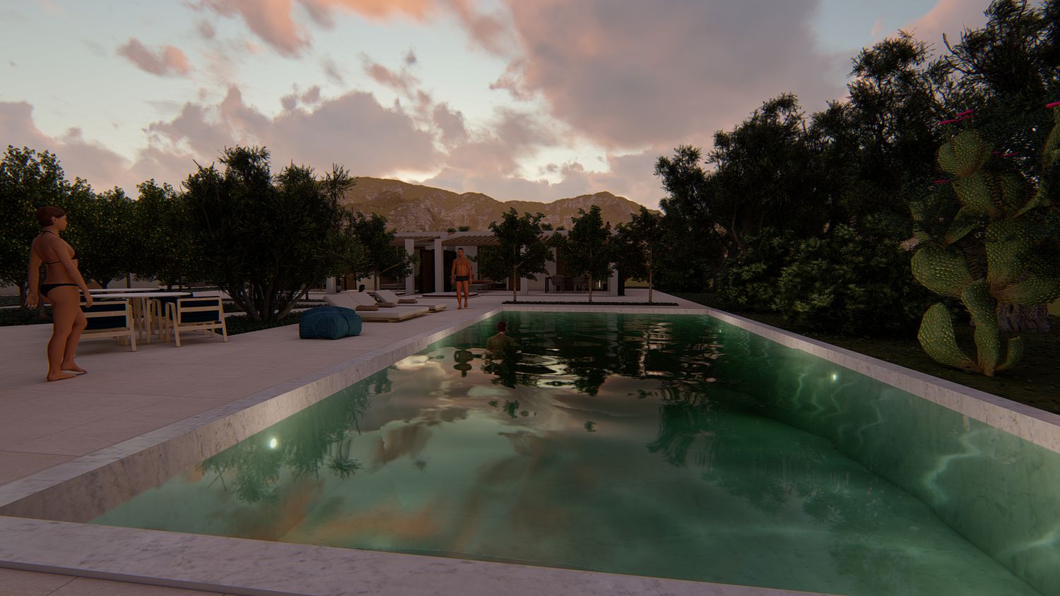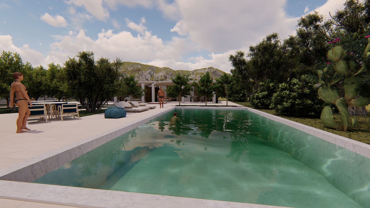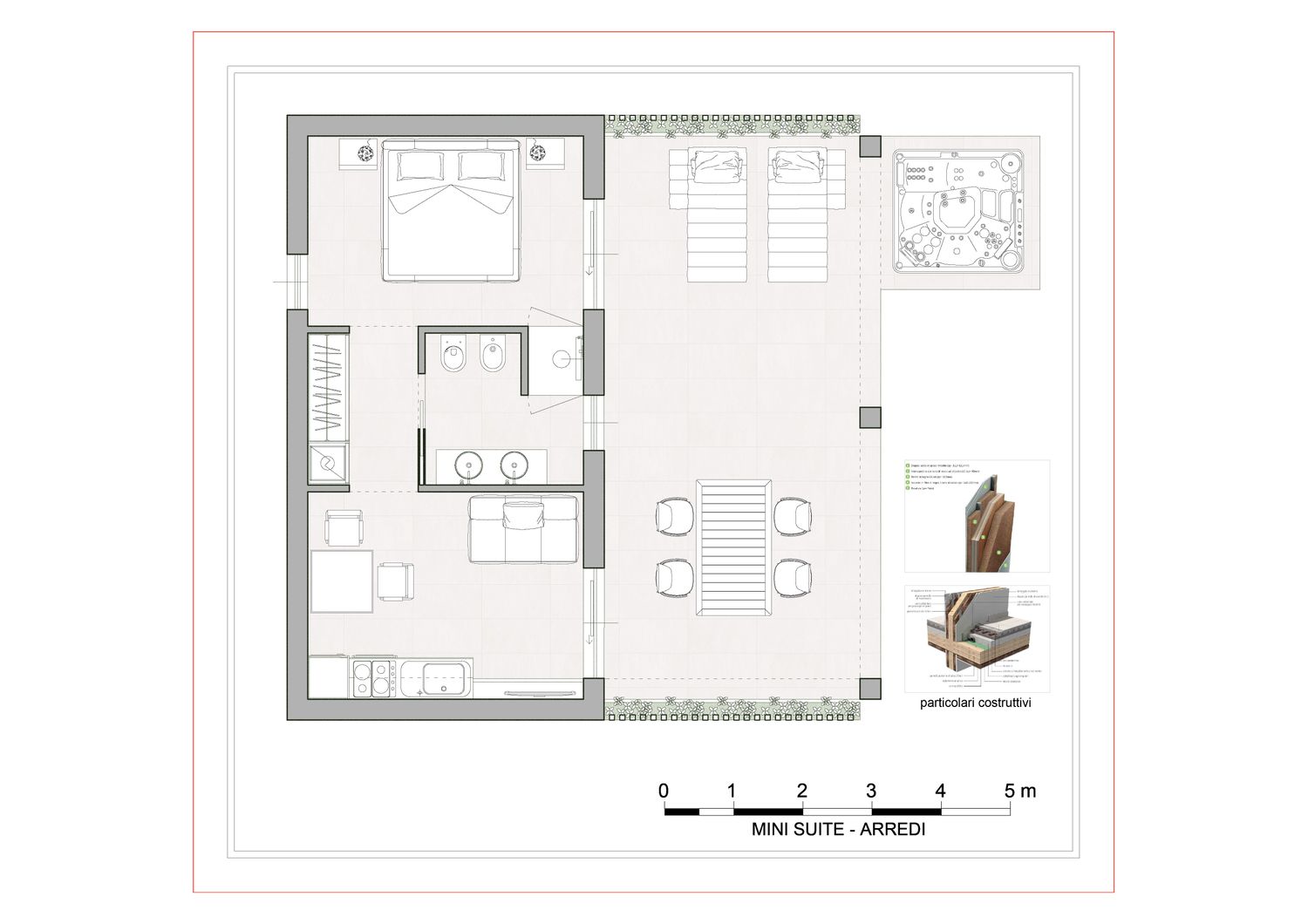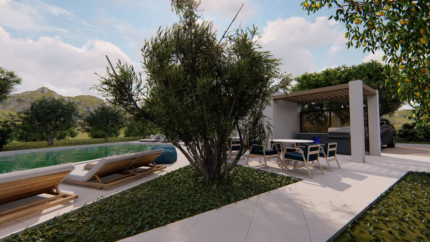 Le aree verdi avranno linee sinuose e morbide, con il solo inserimento geometrico e squadrato dei due volumi delle suite, del vuoto della piscina, e di un piccolo spazio multifunzione contenente un pergolato con cucina/barbecue outdoor, locale bagno a servizio dell'area outdoor e del solarium, piccolo vano ripostiglio e locale tecnico di utilità per la struttura.