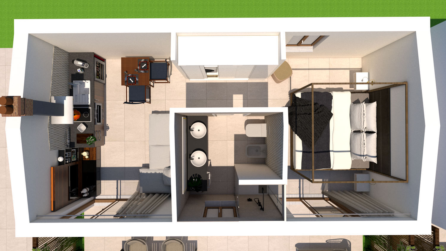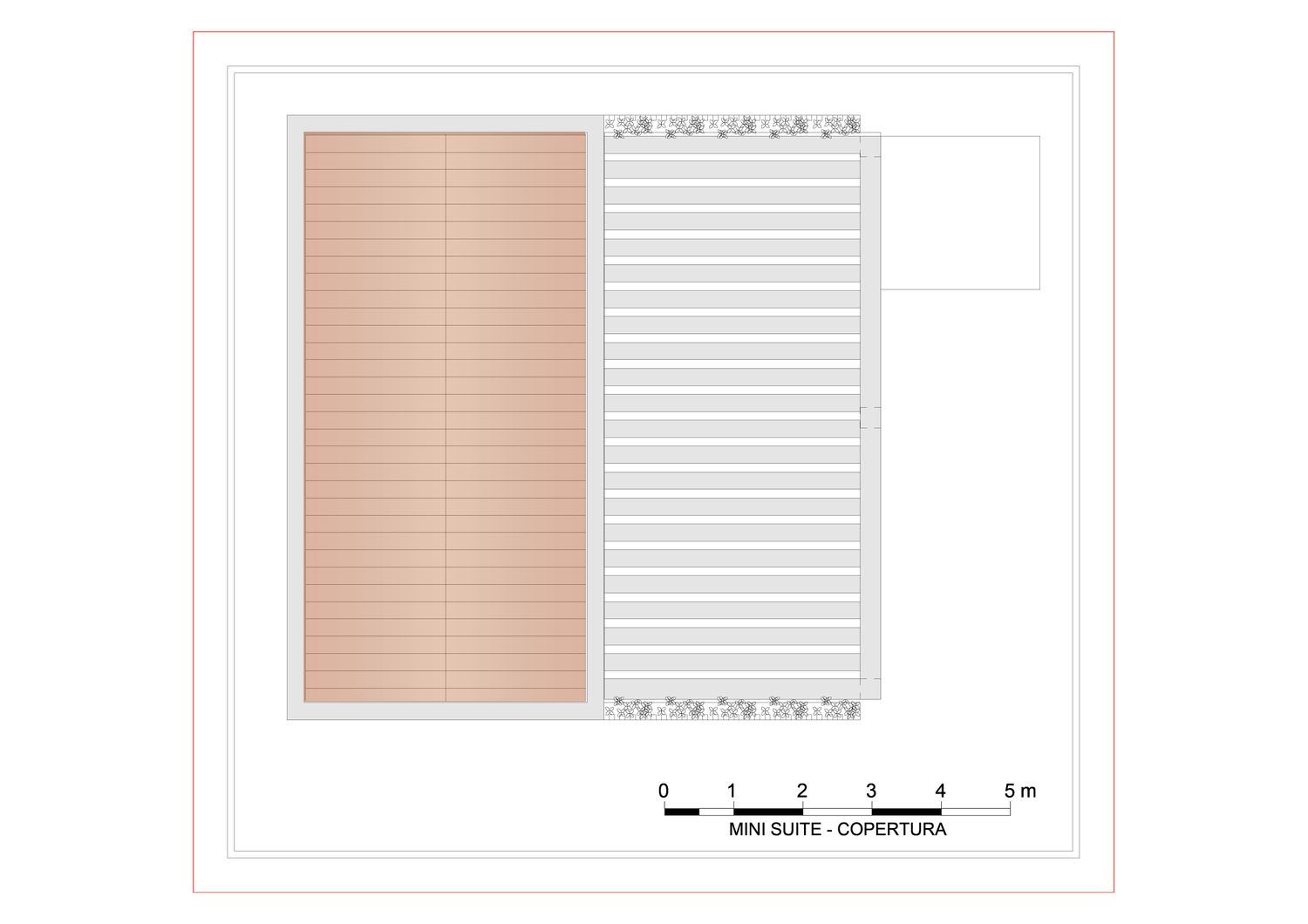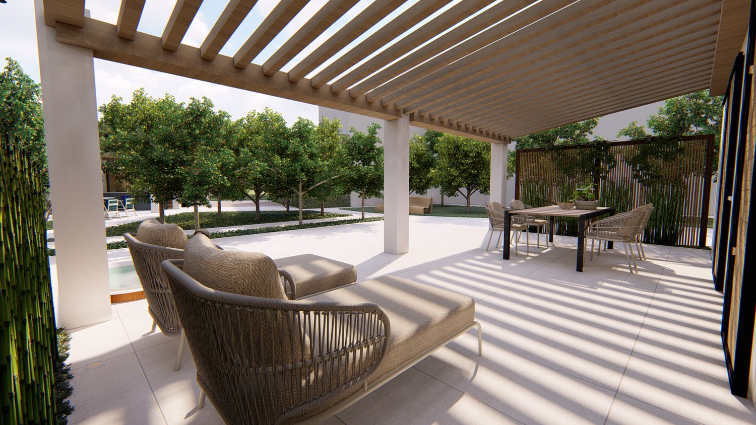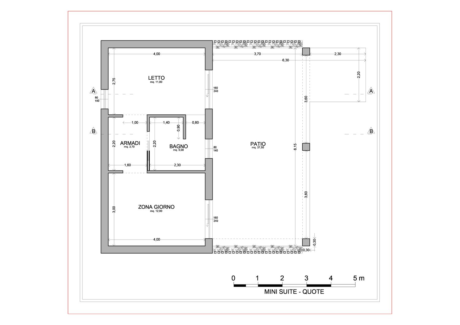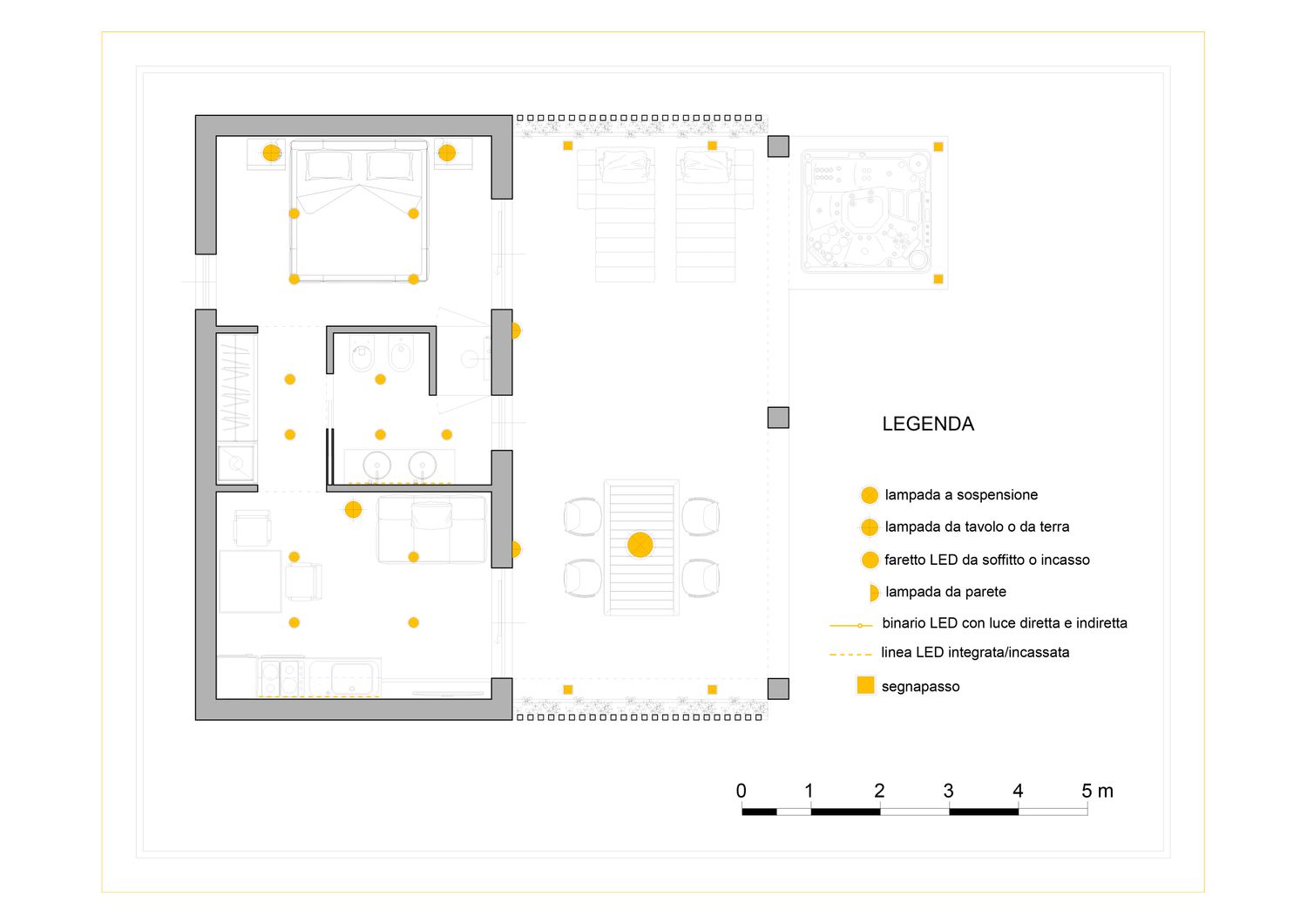 Le aree verdi avranno linee sinuose e morbide, con il solo inserimento geometrico e squadrato dei due volumi delle suite, del vuoto della piscina, e di un piccolo spazio multifunzione contenente un pergolato con cucina/barbecue outdoor, locale bagno a servizio dell'area outdoor e del solarium, piccolo vano ripostiglio e locale tecnico di utilità per la struttura.