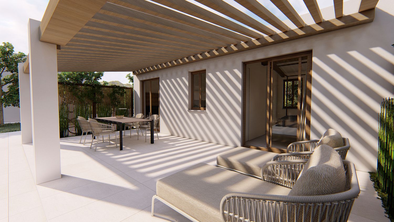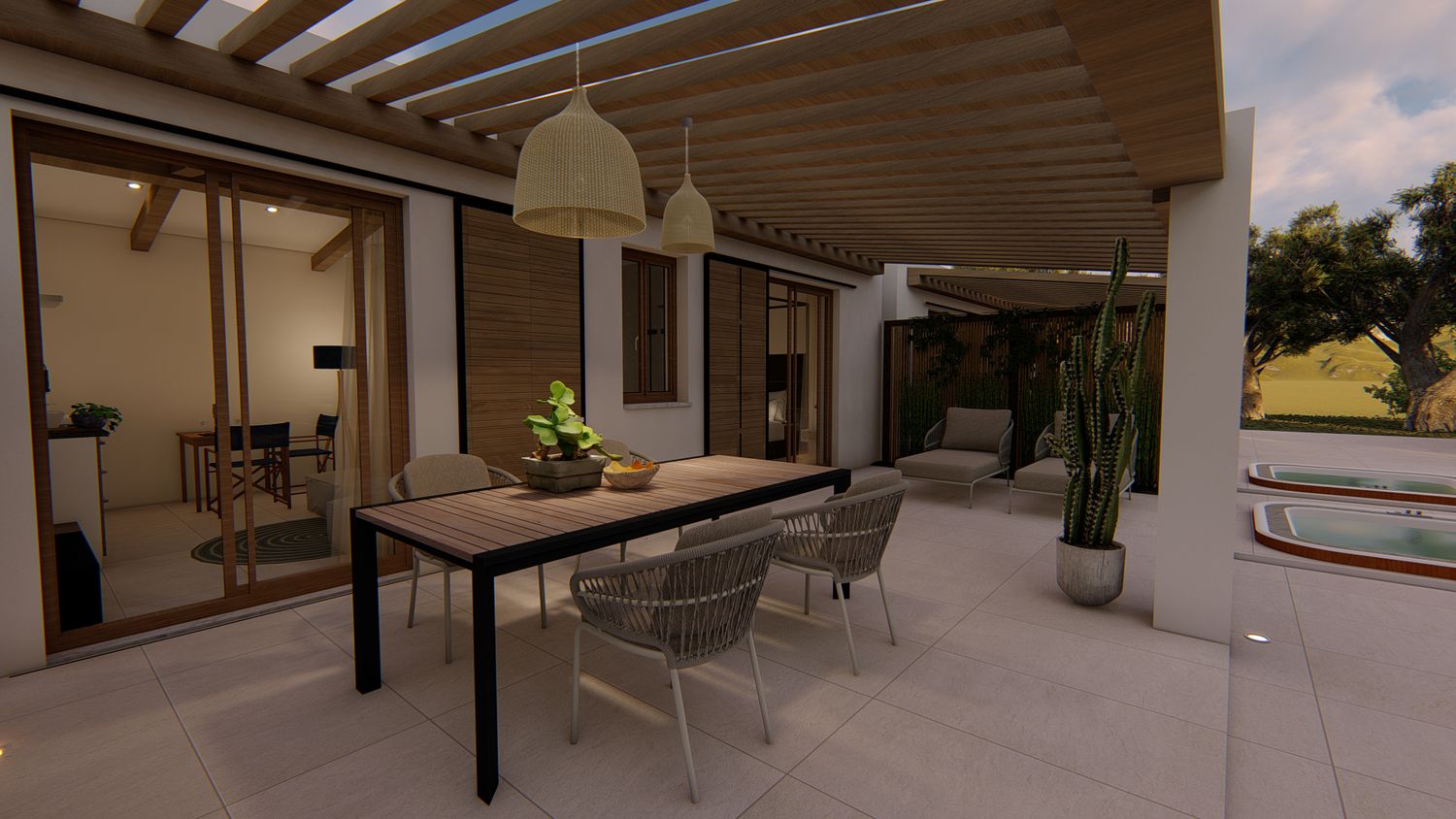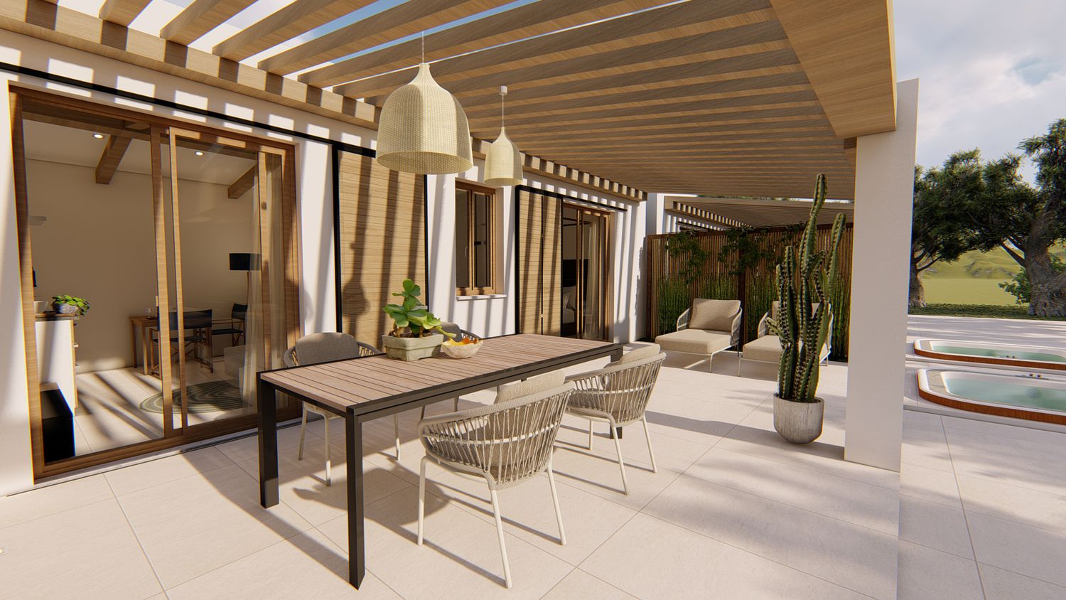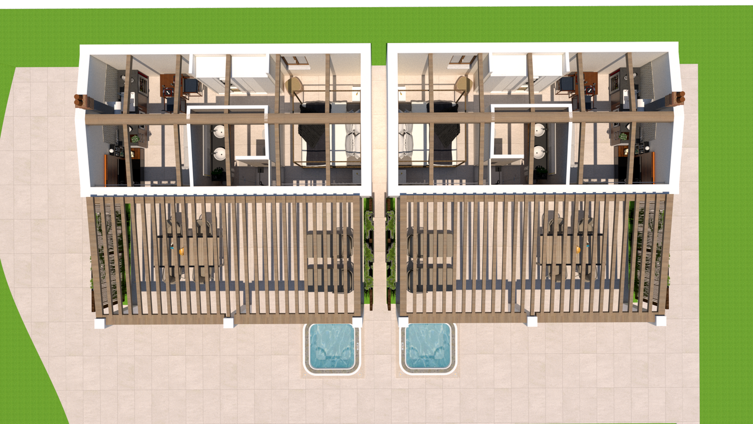 Ognuna di esse sarà dotata di uno spazio giorno, con cucina, zona pranzo, piccolo spazio lounge con divano e TV, disimpegno con guardaroba ed eventuale spazio lavasciuga integrato, zona notte con comodo letto king size, bagno con lavabo doppio e doccia passante. All'esterno, un pergolo in legno incornicia l'intera facciata principale, a protezione dell'area lounge outdoor, arredata con lettini e zona pranzo, e dotata di piscina idromassaggio privata.