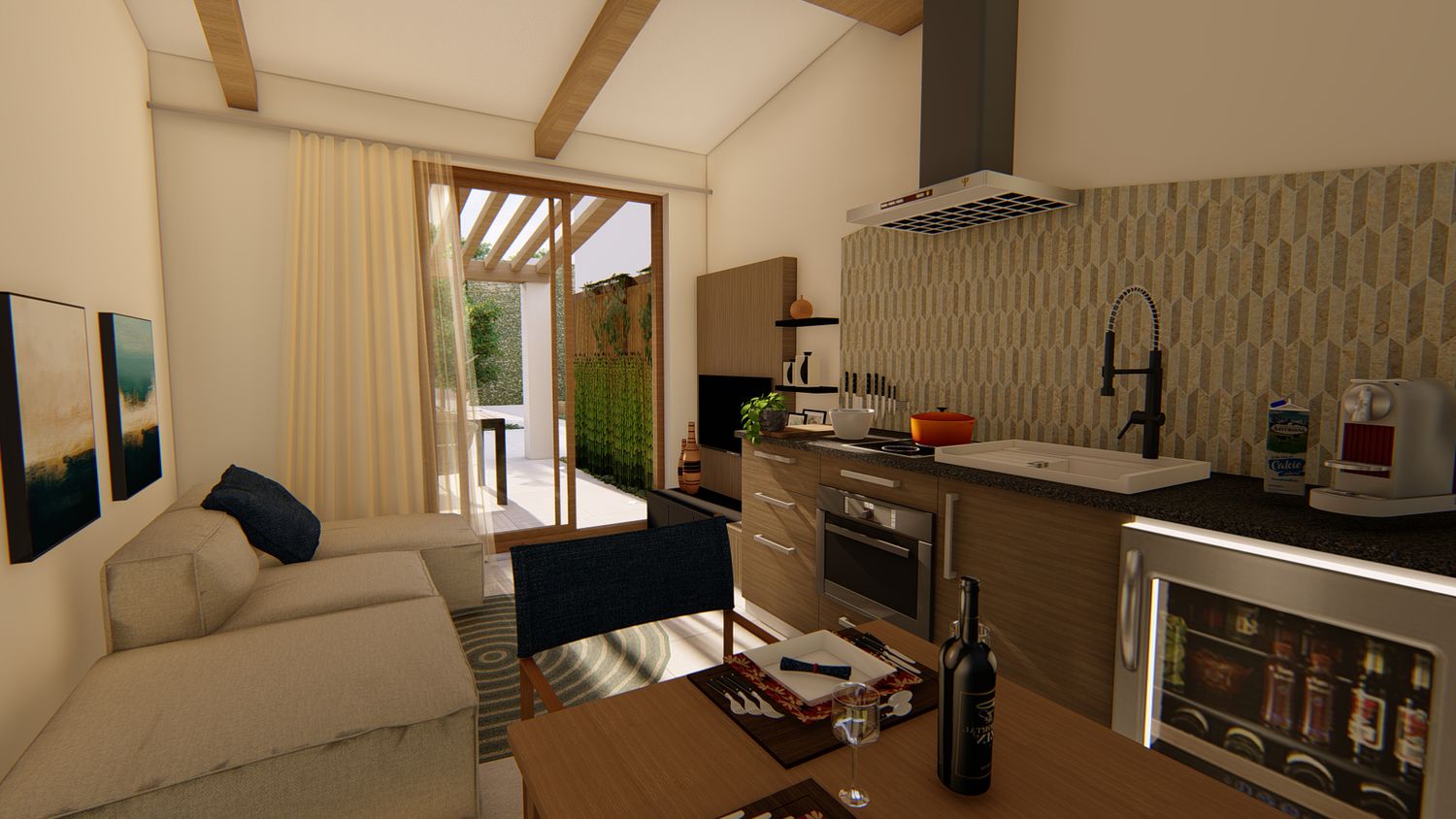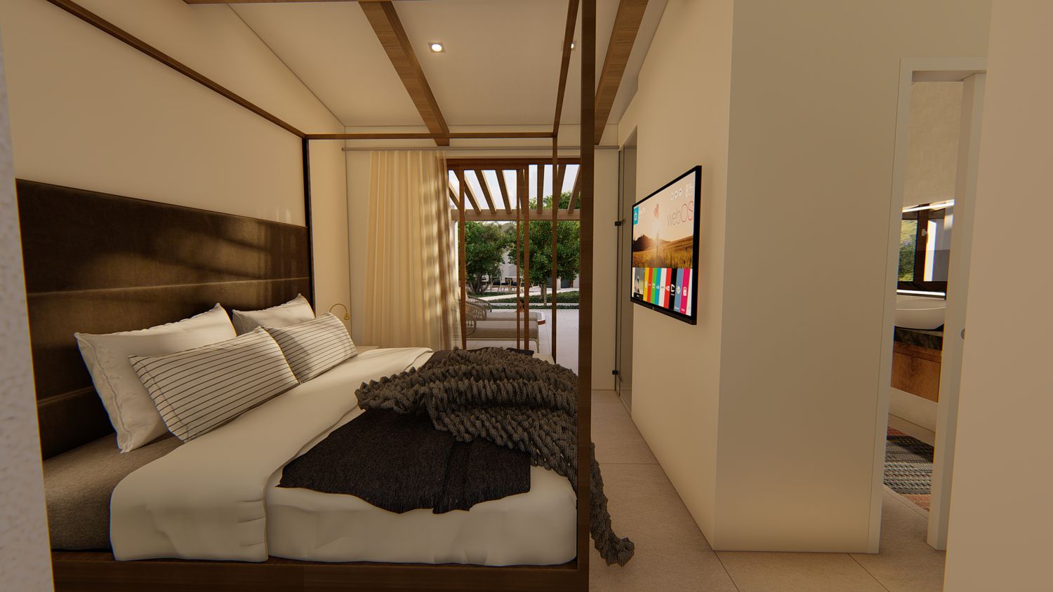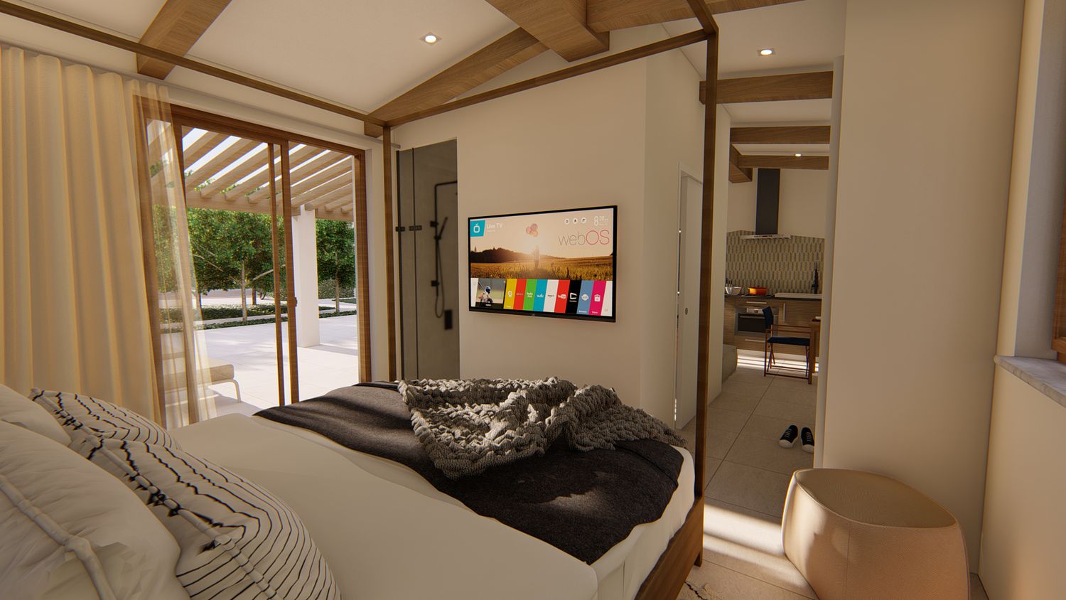 Ognuna di esse sarà dotata di uno spazio giorno, con cucina, zona pranzo, piccolo spazio lounge con divano e TV, disimpegno con guardaroba ed eventuale spazio lavasciuga integrato, zona notte con comodo letto king size, bagno con lavabo doppio e doccia passante. All'esterno, un pergolo in legno incornicia l'intera facciata principale, a protezione dell'area lounge outdoor, arredata con lettini e zona pranzo, e dotata di piscina idromassaggio privata.