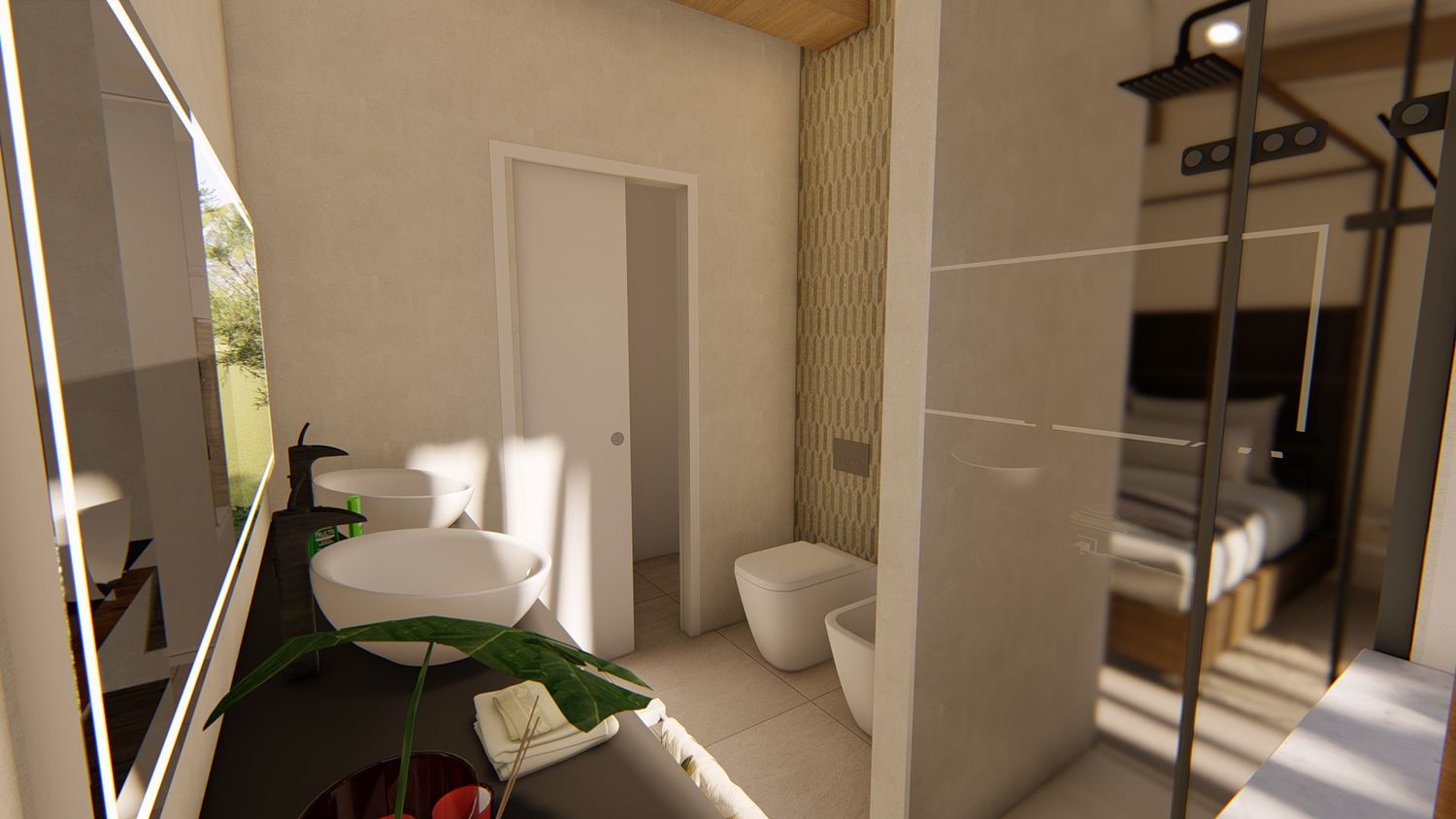 Infine, abbiamo tratteggiato, soltanto a livello di mood compositivo, quella che è la nostra visione per la texture dell'edificio centrale, dedicato a reception ed eventuali spazi foresteria o bar/ristorante. Anche qui, emerge la continuità stilistica e materica con quanto progettato per le suites e gli spazi esterni e di servizio.