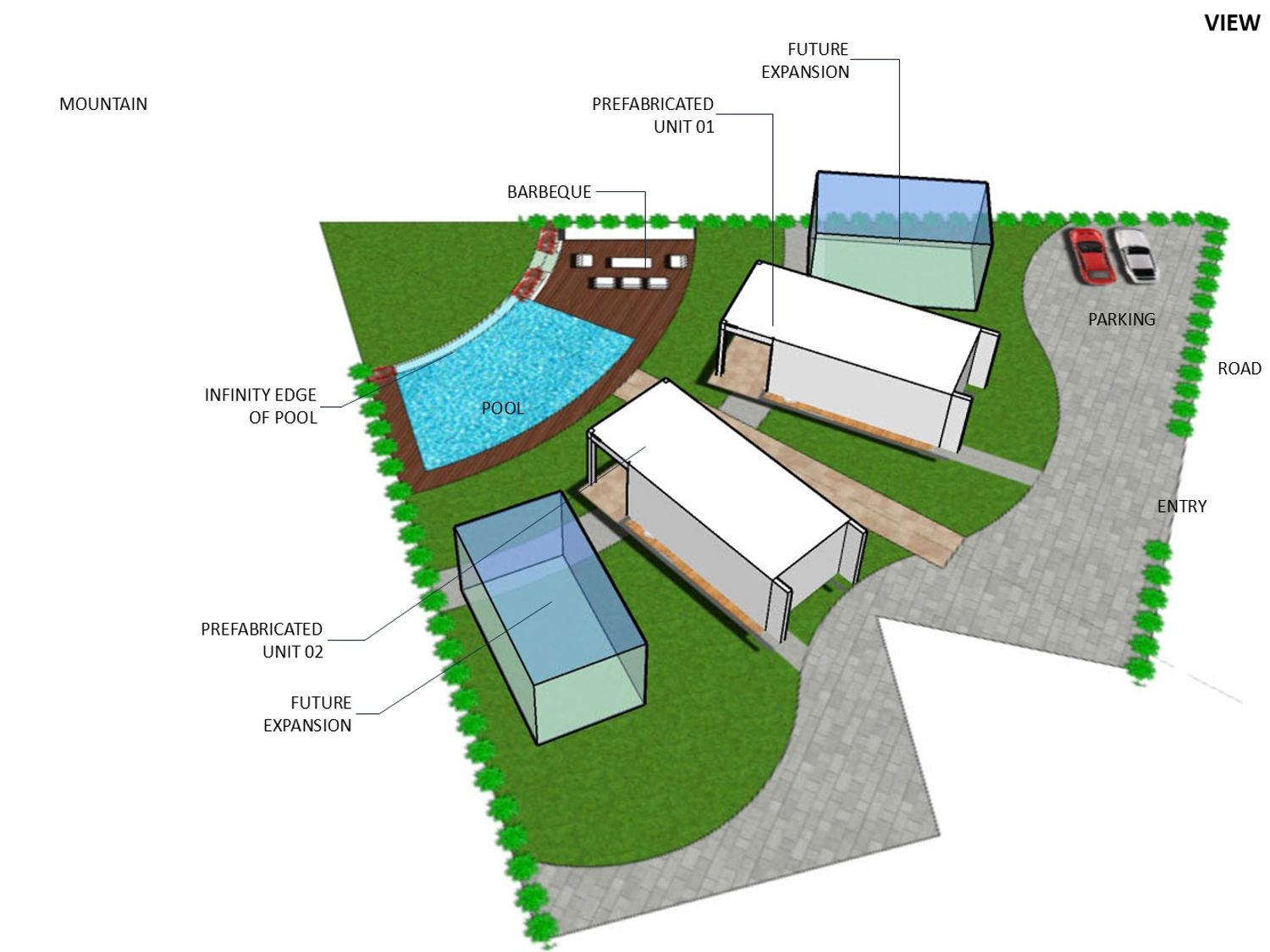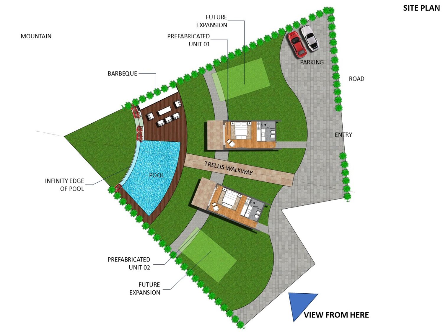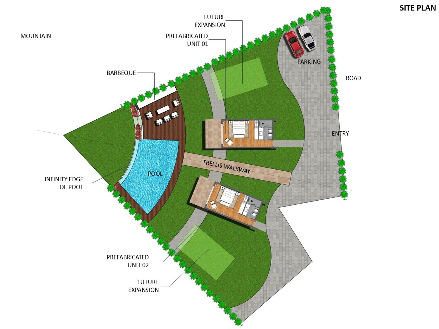 Two prefabricated accommodation units are strategically placed to ensure privacy while maintaining visual connectivity with the central amenities. A trellis-covered walkway connects the units, guiding movement through the site and enhancing the guest experience.