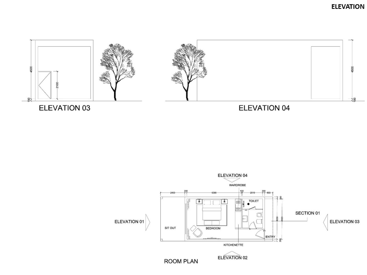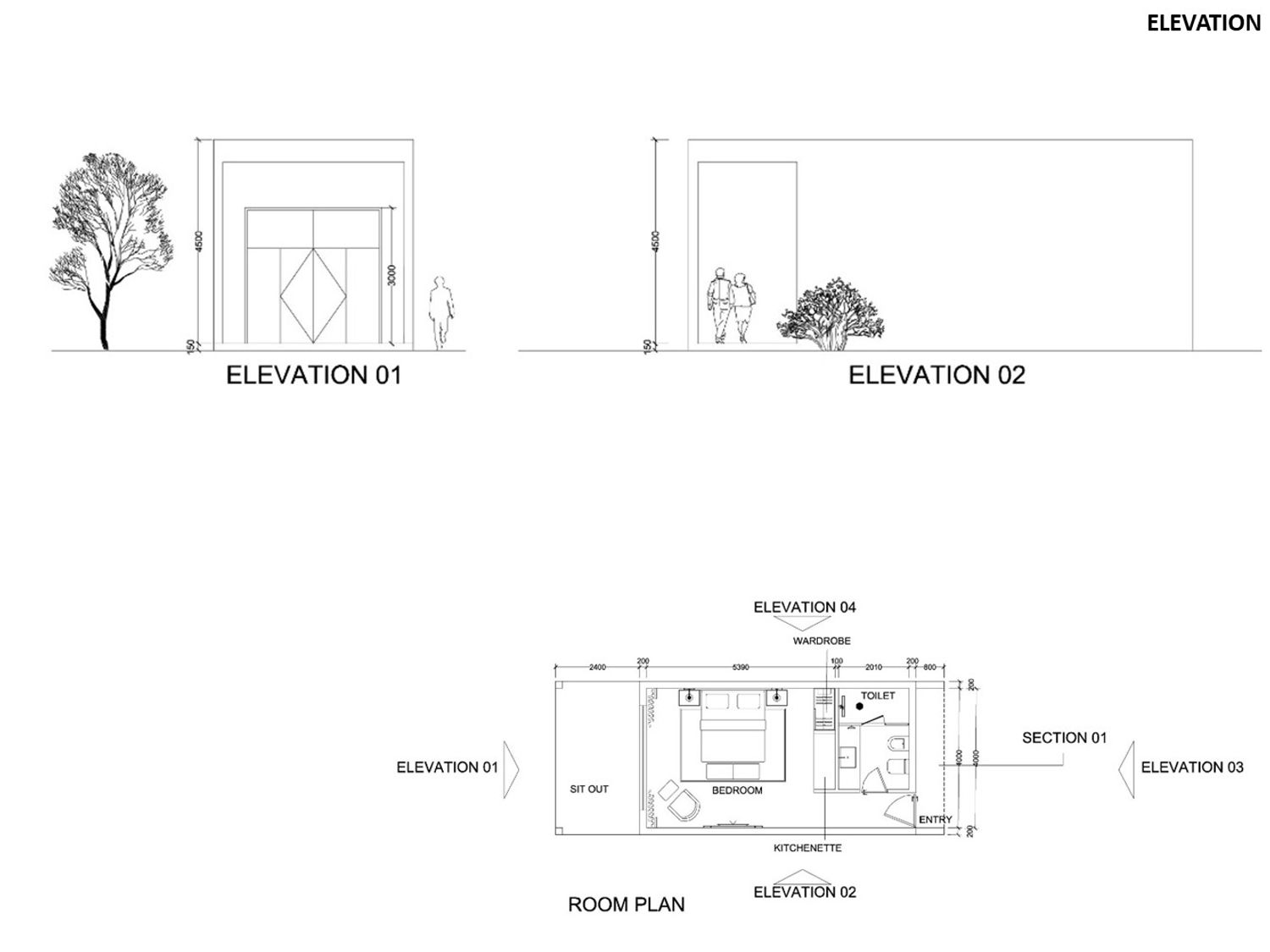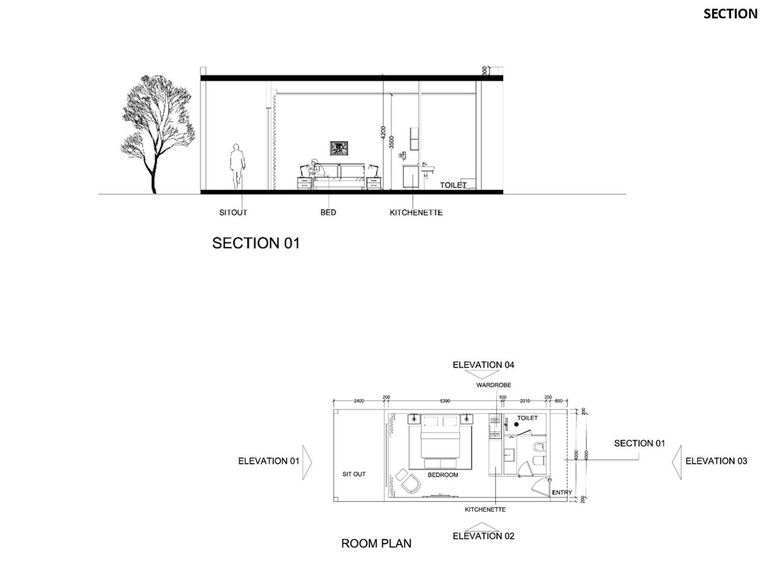 Two prefabricated accommodation units are strategically placed to ensure privacy while maintaining visual connectivity with the central amenities. A trellis-covered walkway connects the units, guiding movement through the site and enhancing the guest experience.