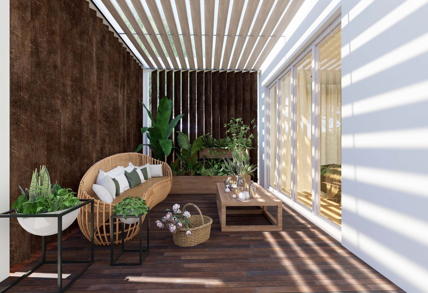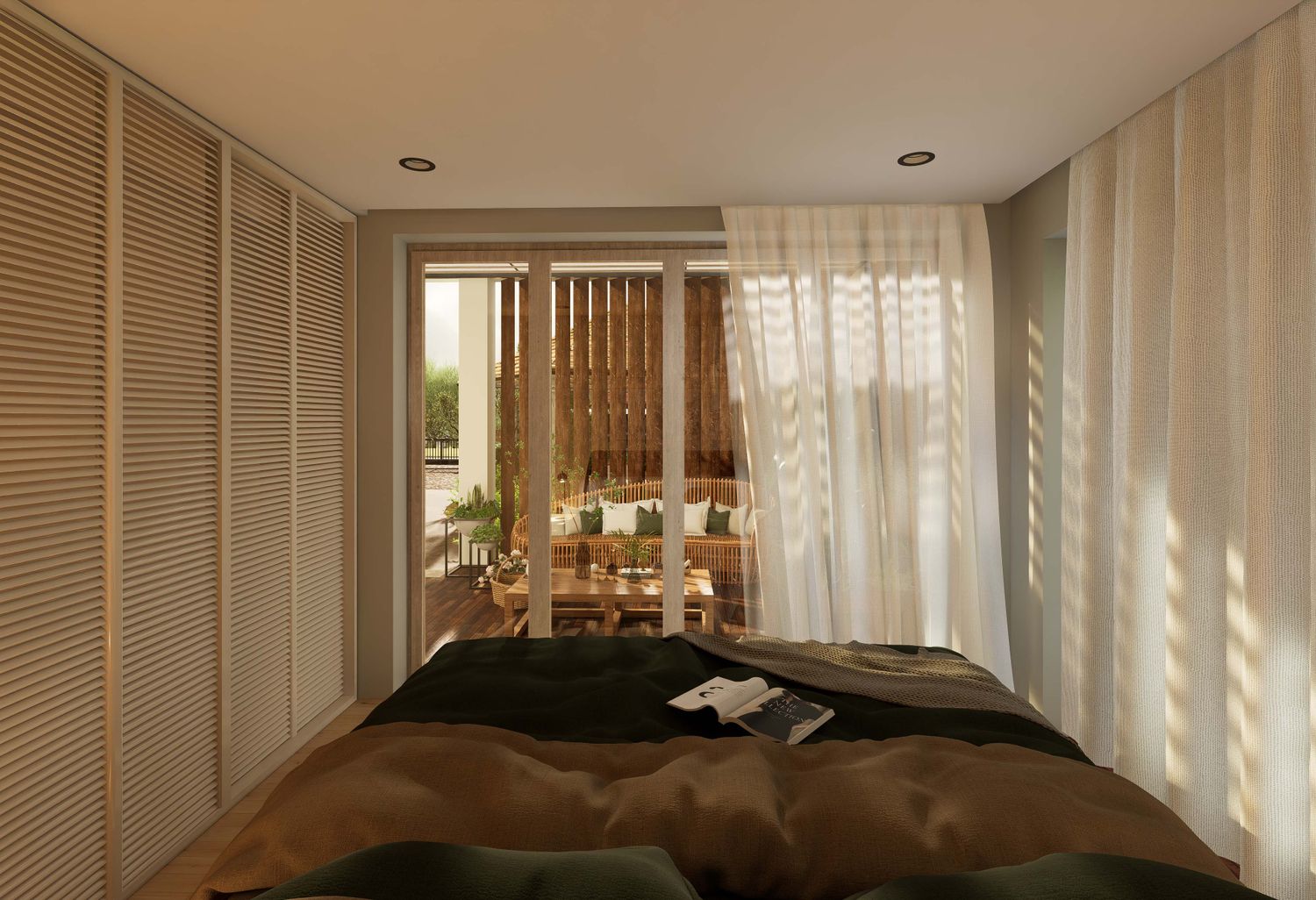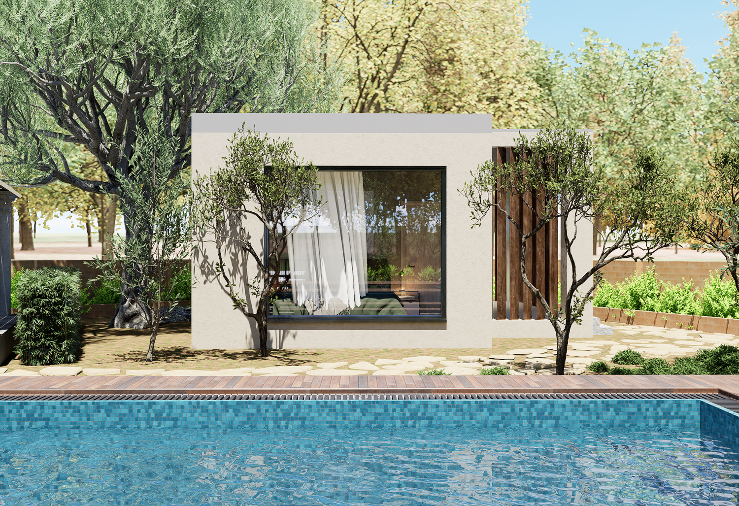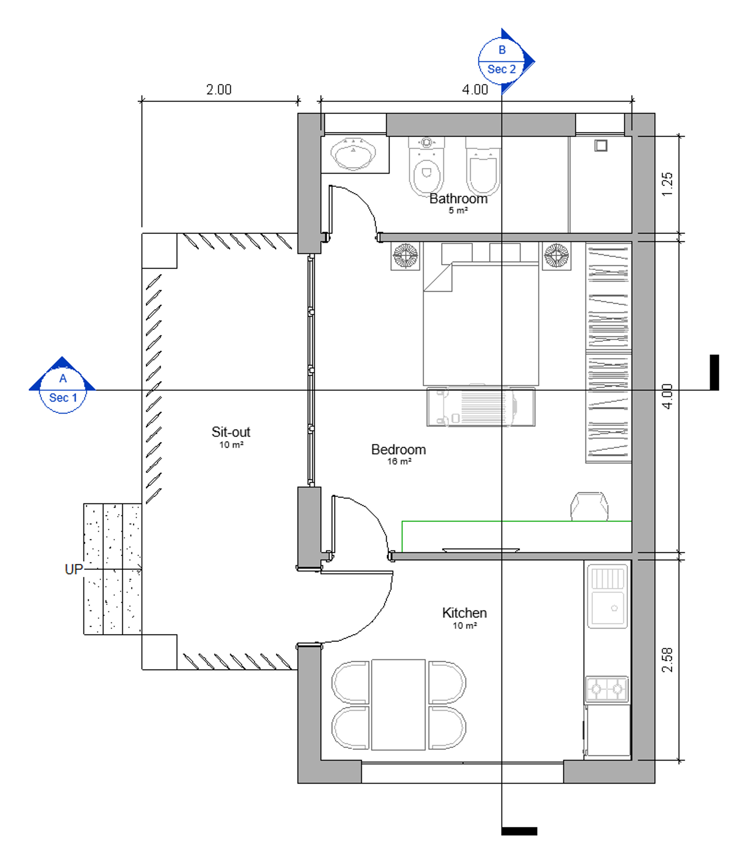 The modular structure is of 32 sqm and consists of an open to sky sit-out area, a bedroom with a wardrobe and an integrated study desk , a bathroom with shower and floor to ceiling windows overlooking the greenery, a kitchenette with a dining table.