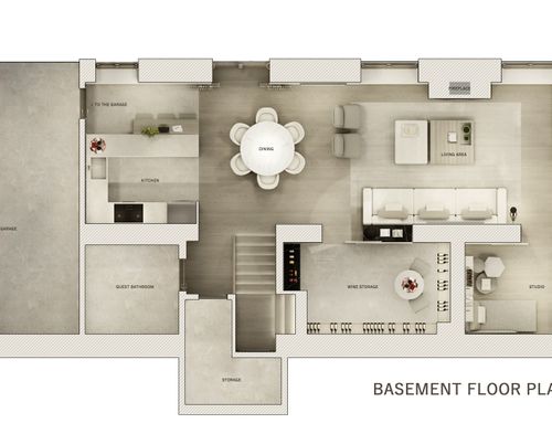 I would like to start from the basement where I would like to get the kitchen with the path and a bathroom. I would like a small wine cellar and I would like to have a lounge and a large open space or perhaps with a glass partition to divide and personalize the environment.