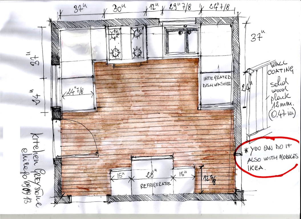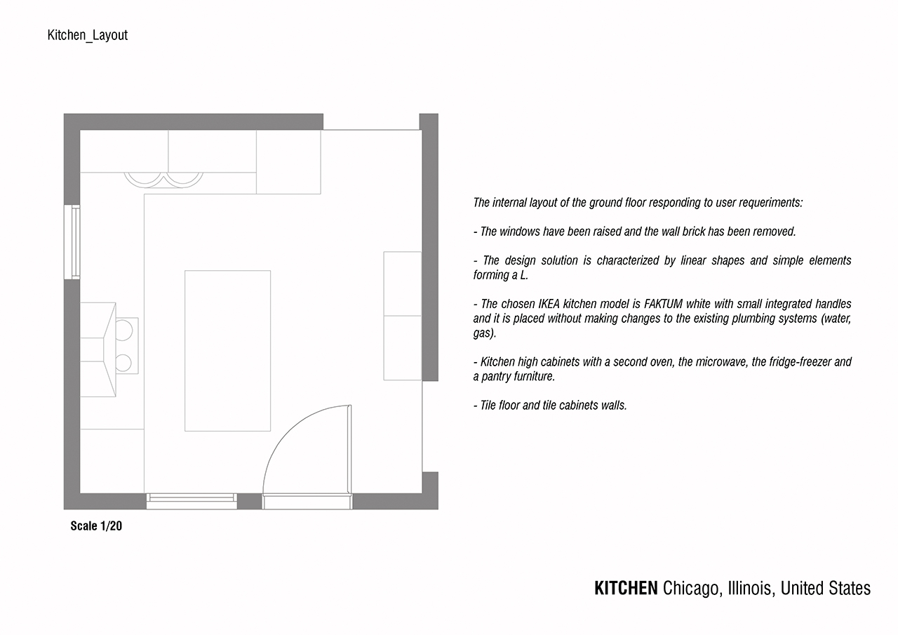 We are going to remodel a kitchen in a 1905 Chicago Greystone. As you can see by the pictures the kitchen is small an poorly laid out. In addition the refrigerator is being kept in the butlers pantry, which we do not want in our remodel. We currently have white appliances in standard sizes (30" range, 30" micro/hood, 24" dishwasher and 28" refrigerator). As you can also see the low windows and exposed brick make it a challenge to install cabinets. We are considering raising the windows so that we can have a continuous row of cabinetry. We are also considering padding out the wall with the exposed brick to make installing a long row of cabinetry easier. We are looking for a updated and functional design that would not look out of place in a building of this age or style. We are also trying to keep costs down so we are looking at stock cabinetry sizes, Ikea for example. We are also considering quartz counter tops. We would consider purchasing new appliances in stainless steel for it fits the design. It is important that the kitchen be functional as the owner likes to cook. The kitchen is on the first floor so if necessary things like the water and gas lines could be moved but we are trying to avoid those costs. Finally, the exterior is brick so moving things like doors and windows is very expensive and we are trying to avoid that also. I have attached a picture of the owners current kitchen which they like very much. Finally, I have also attached a picture of the exterior so you can understand the type of building the kitchen will be in.