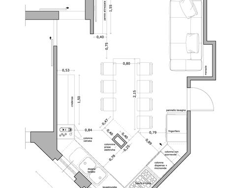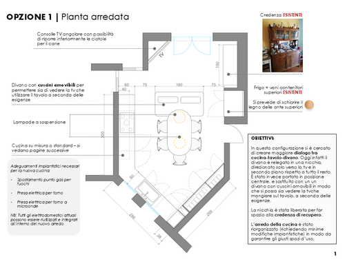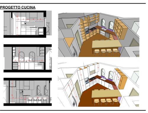Vorremmo una cucina dove si possa avere abbastanza spazio per cucinare liberamente, e allo stesso tempo avere tutto in ordine, gli elettrodomestici a portata di mano ma in uno spazio ben definito, spazi ad hoc per pentole, piatti, bicchieri e la credenza. Il frigorifero è vincolato a quella posizione. Non mi piacciono i fronzoli... e il nero... mi piacciono i fornelli o i fuochi in stile industriale, e il fornello con sufficiente spazio... 5 fuochi ma da 90 almeno altrimenti le pentole non ci stanno.
