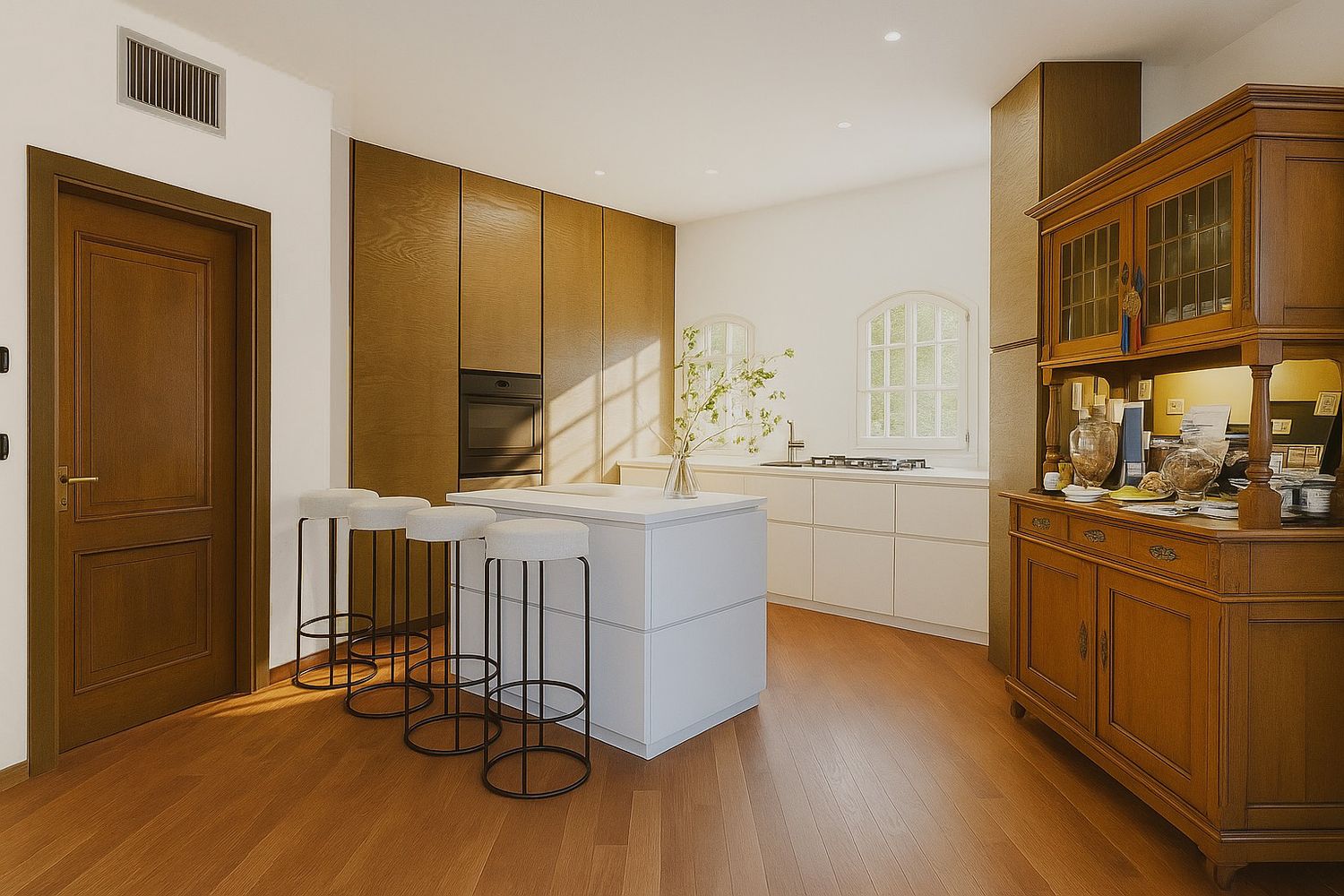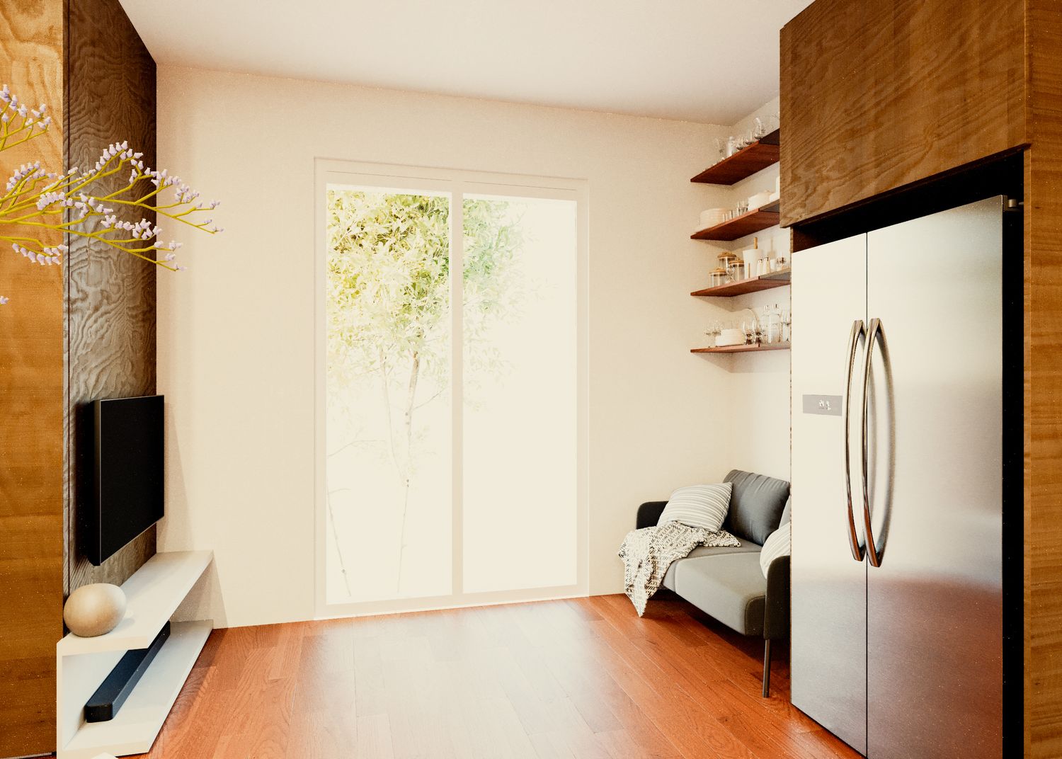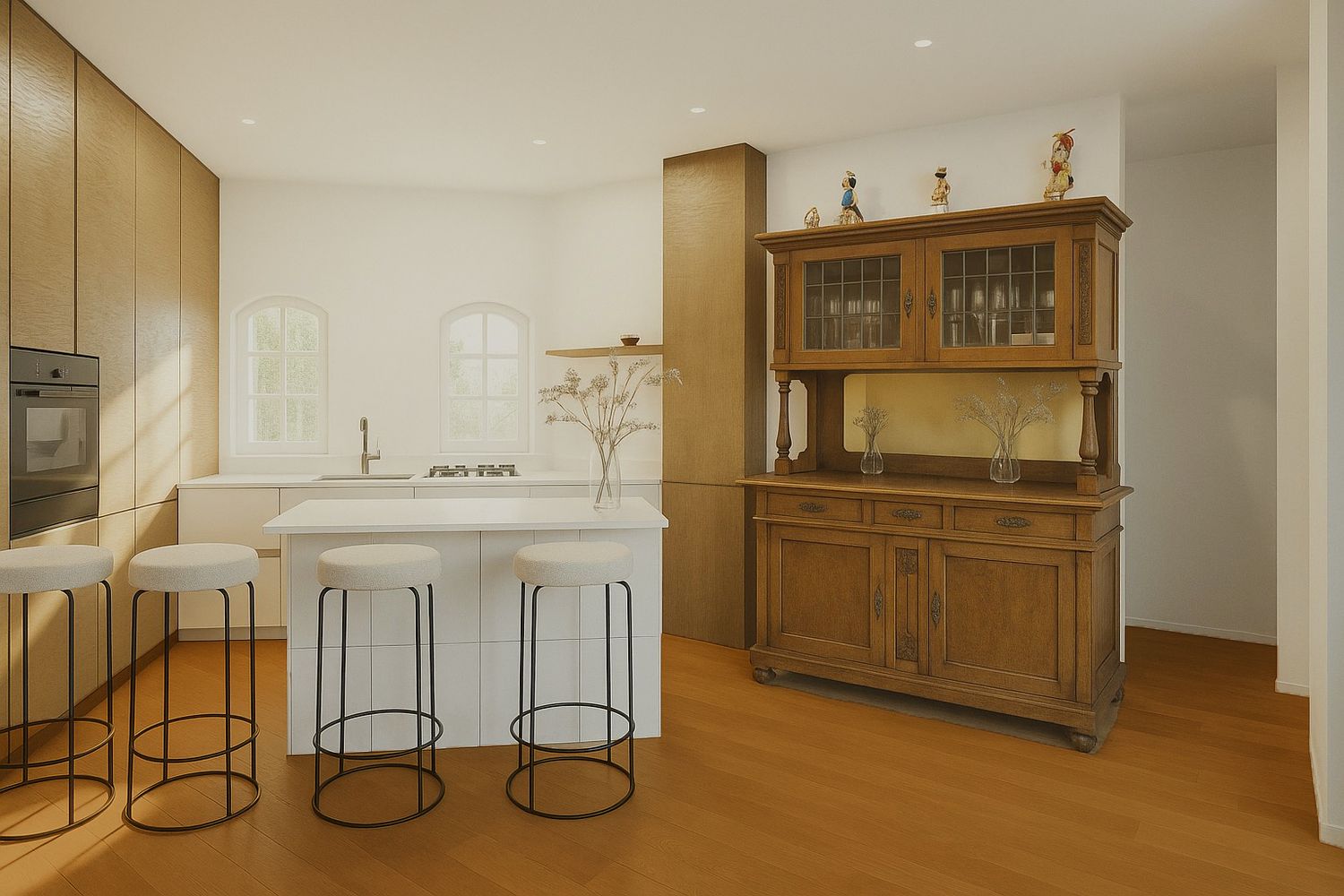 Dear client, I tried to consider all your needs for the design such as keeping the old antique cabinet of yours as it is, and keep flooring as same, changing the sofa b ut still consider gathering place for tv and sofa together. I also did not changed the placement of your fridge.