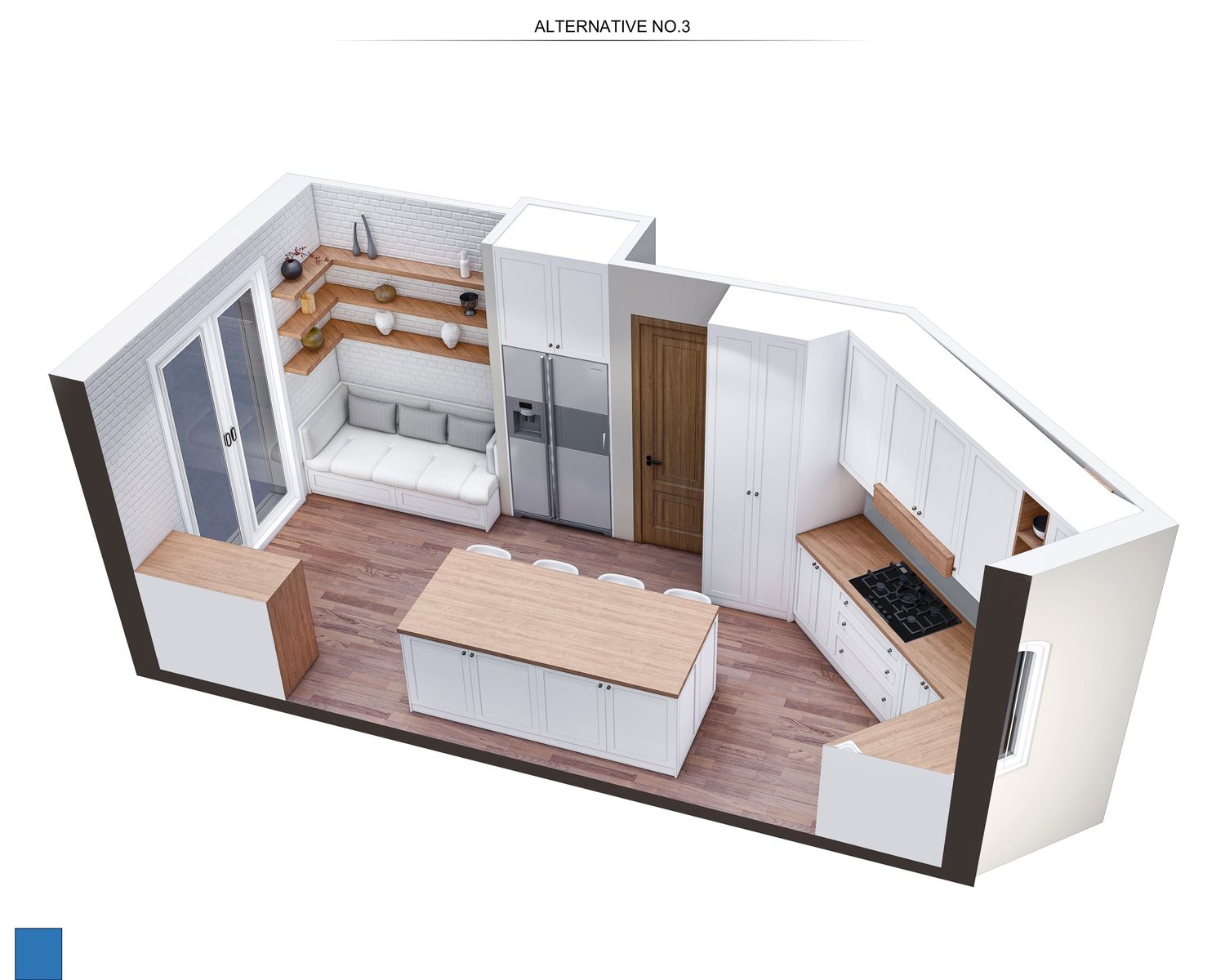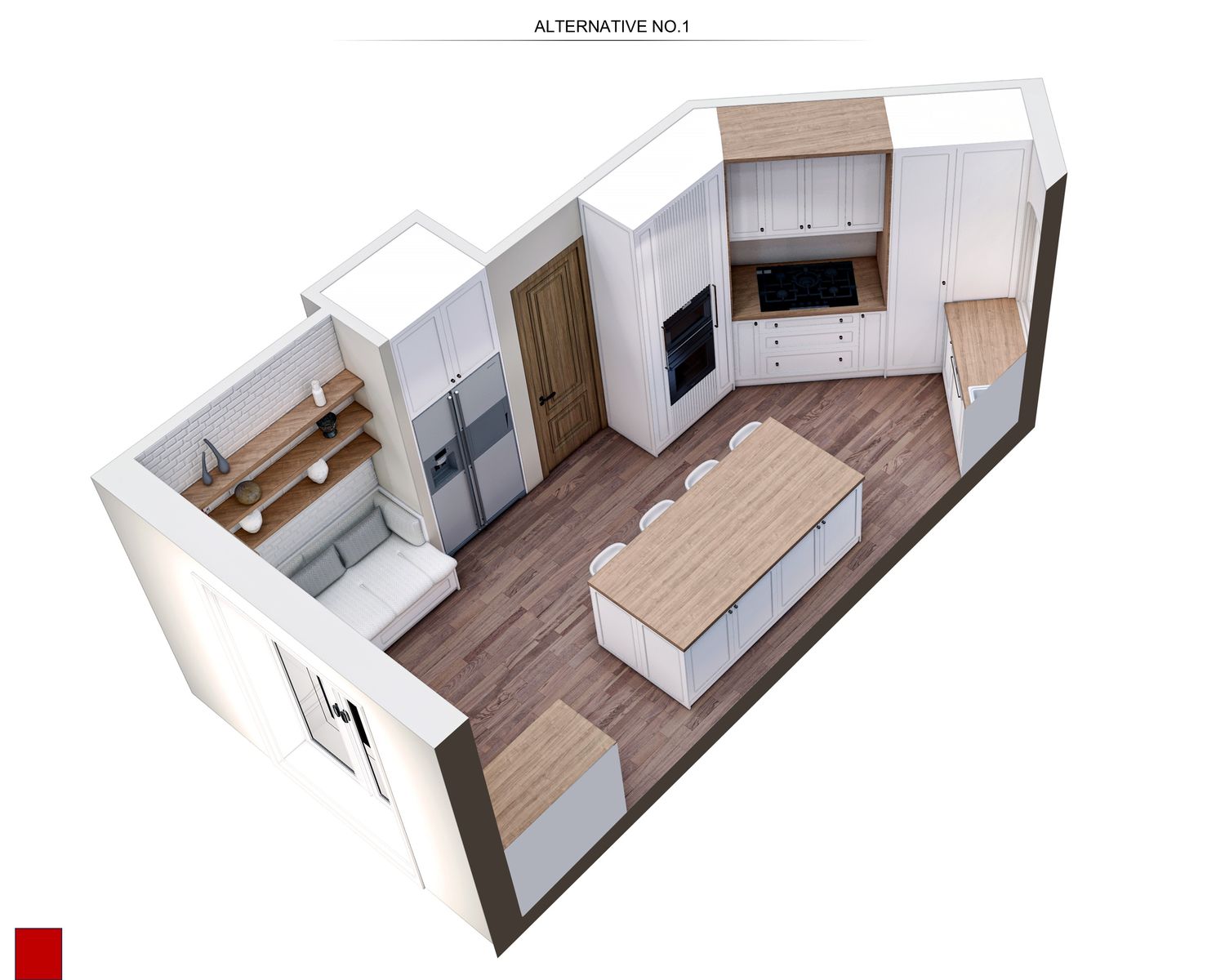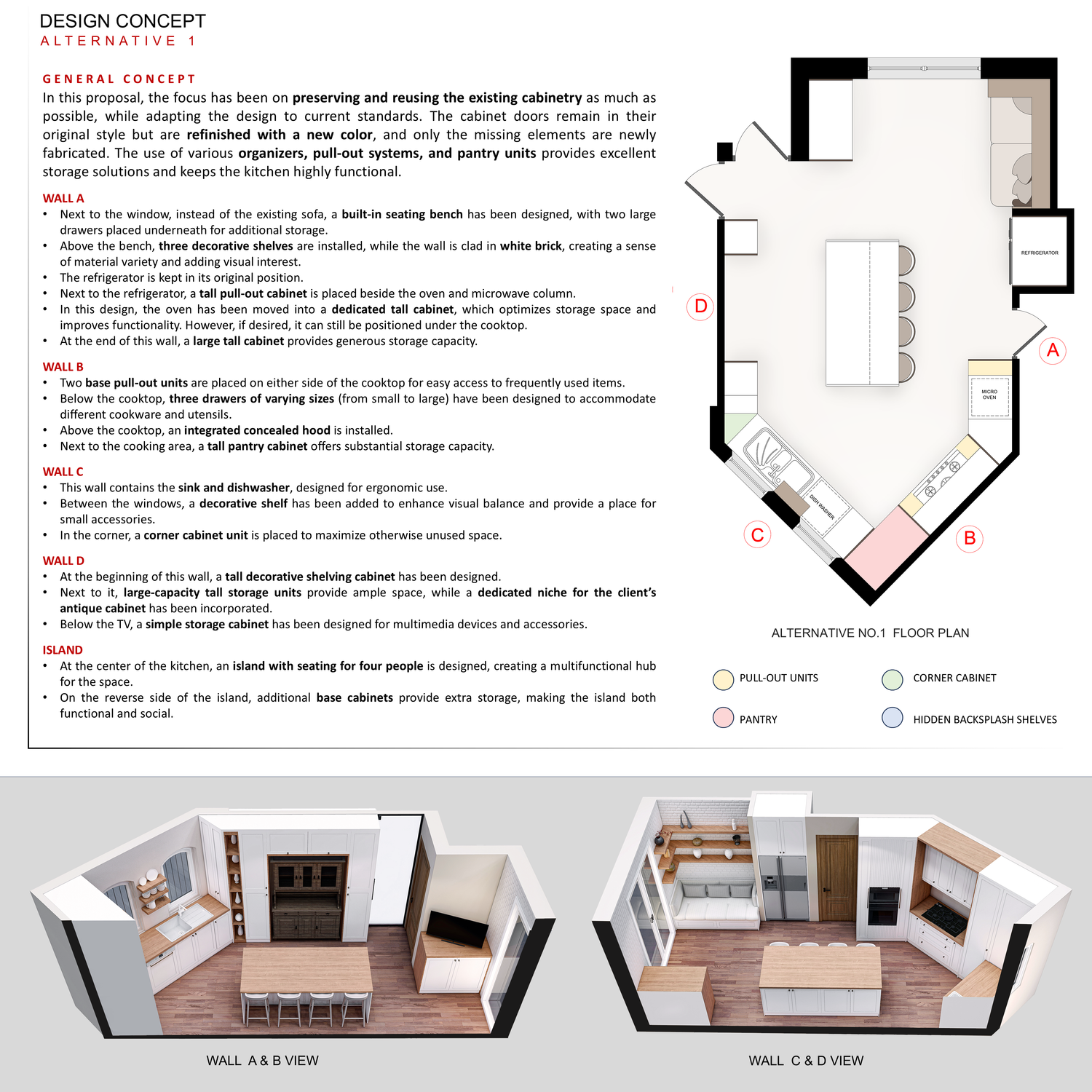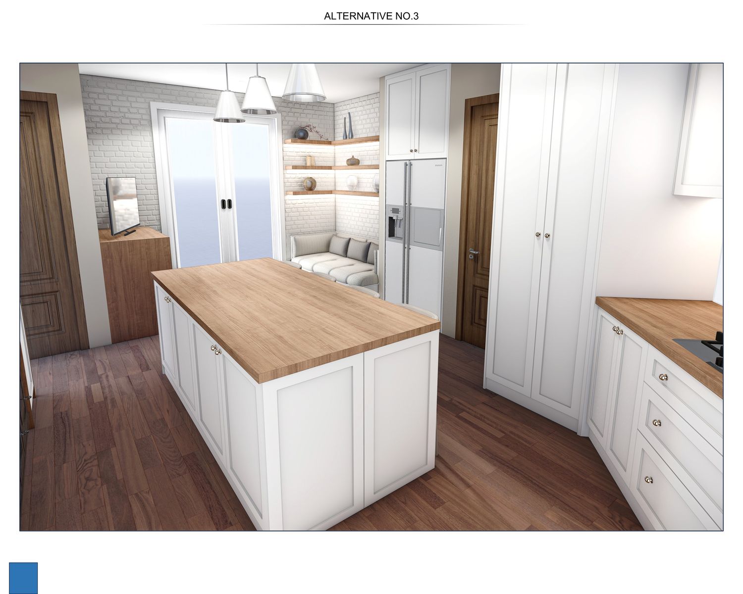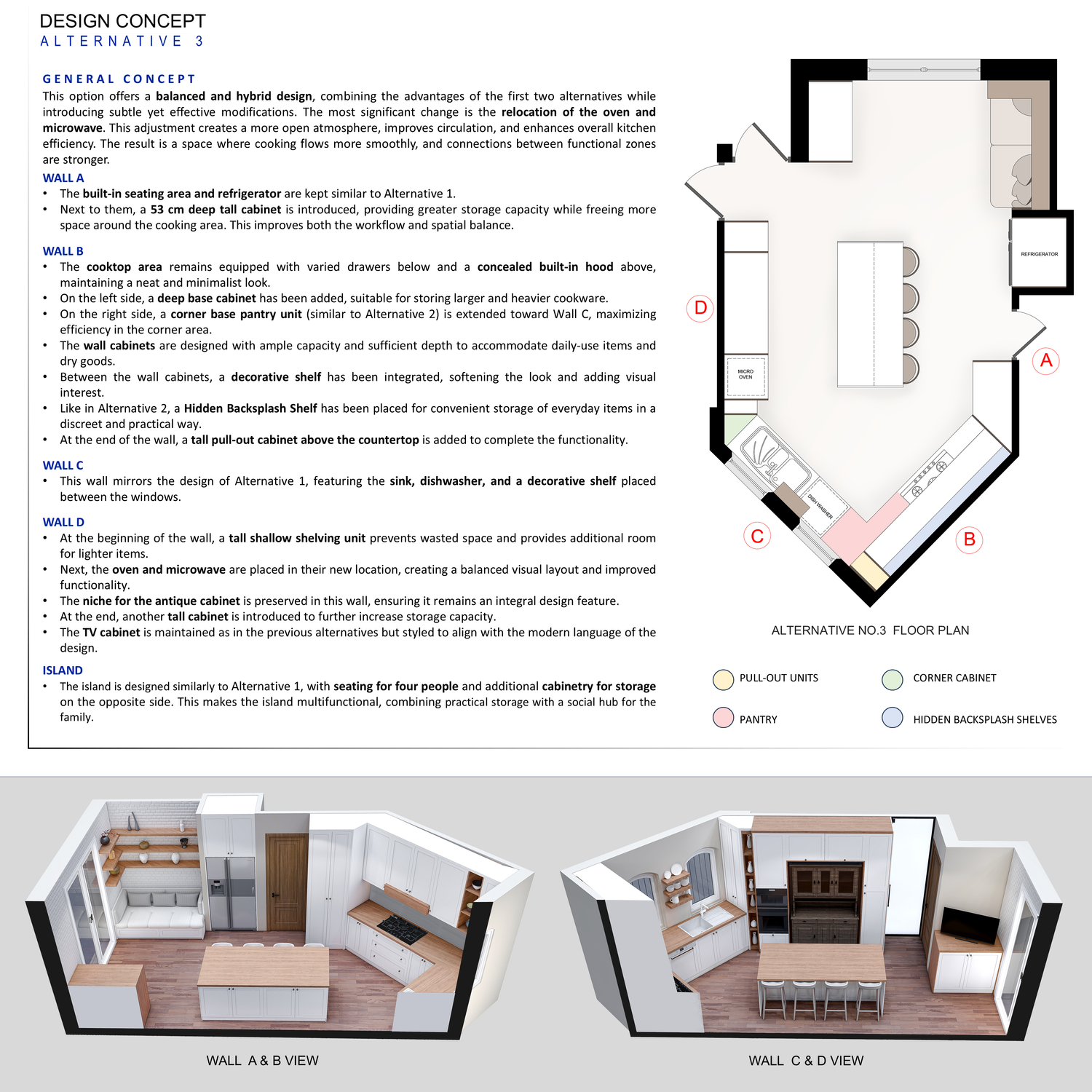Considering existing constraints such as the fixed location of the refrigerator and the preservation of the parquet flooring, and with the goal of addressing challenges like insufficient storage space and inaccessible cabinets, we have prepared three distinct yet fully actionable design concepts. Each of these proposals offers a different approach to creating an ideal space where: