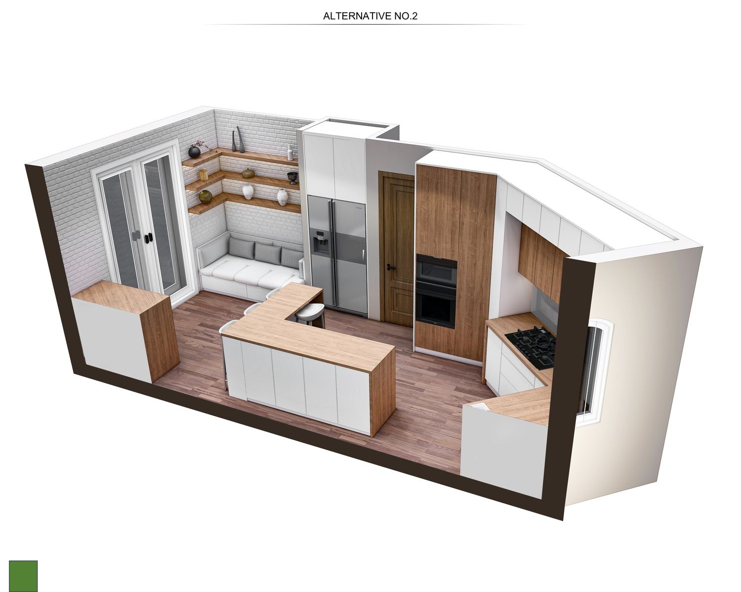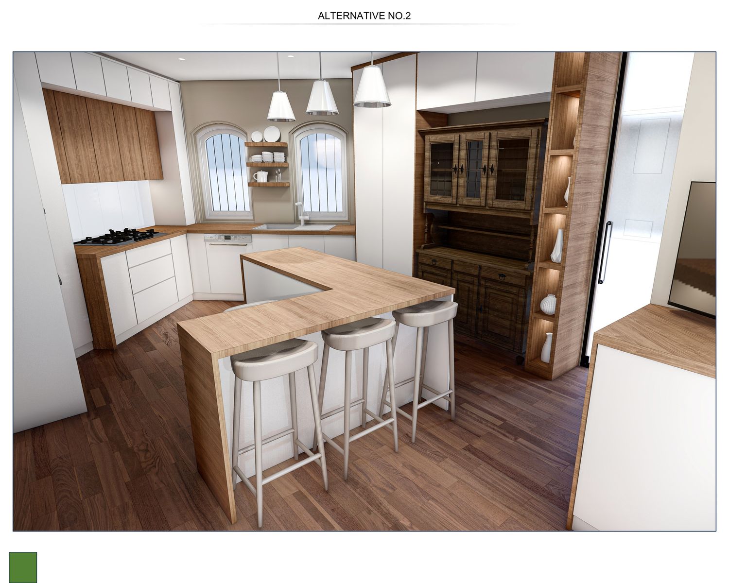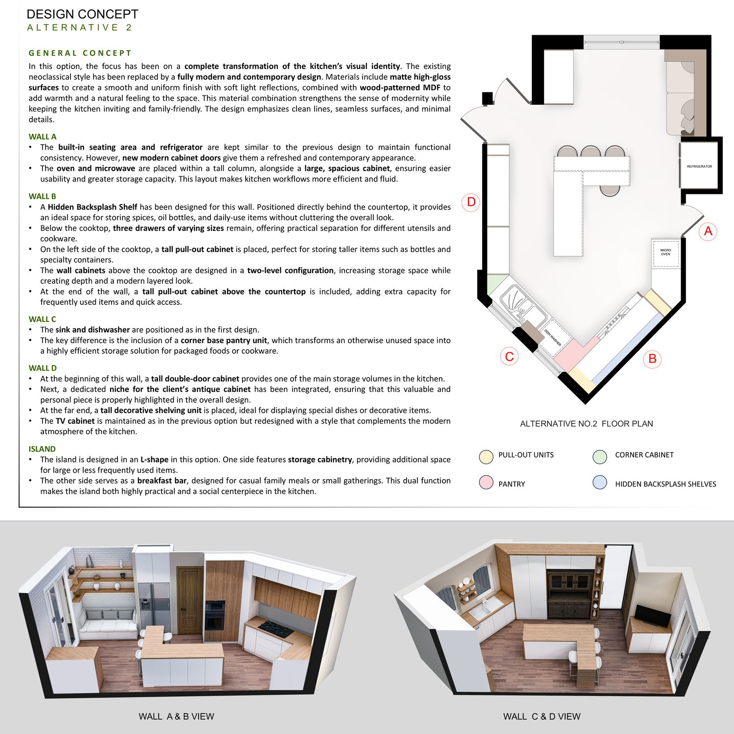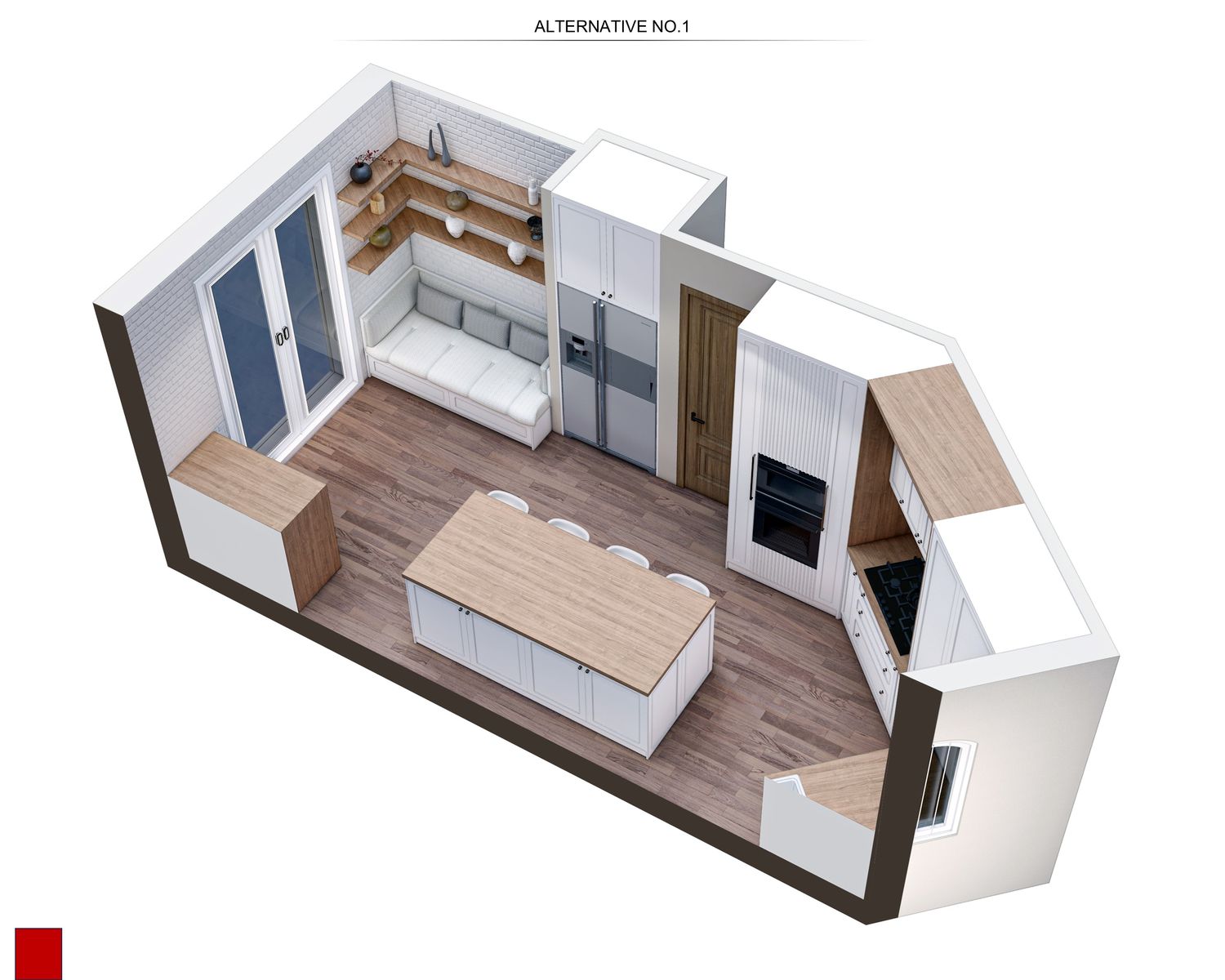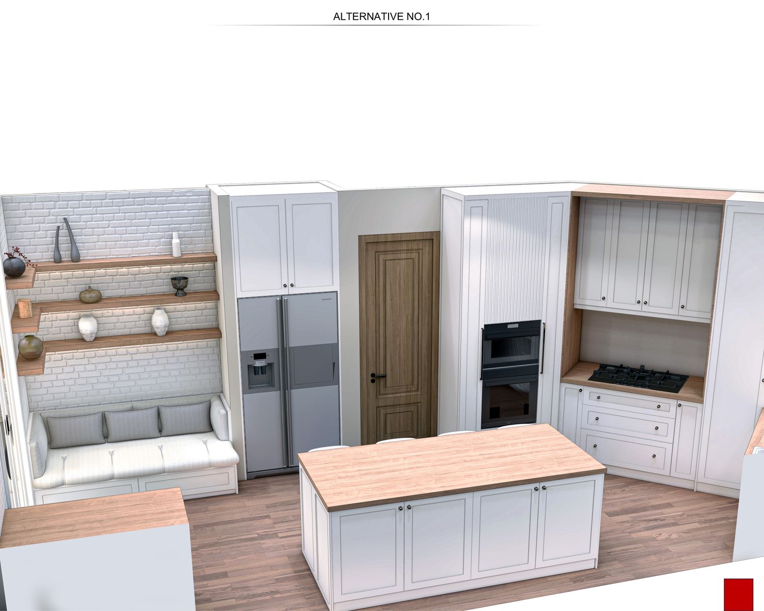 Considering existing constraints such as the fixed location of the refrigerator and the preservation of the parquet flooring, and with the goal of addressing challenges like insufficient storage space and inaccessible cabinets, we have prepared three distinct yet fully actionable design concepts. Each of these proposals offers a different approach to creating an ideal space where: