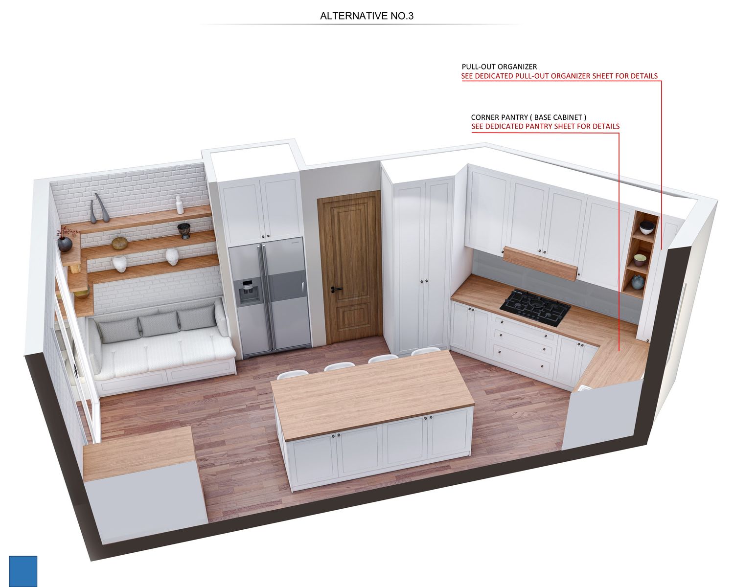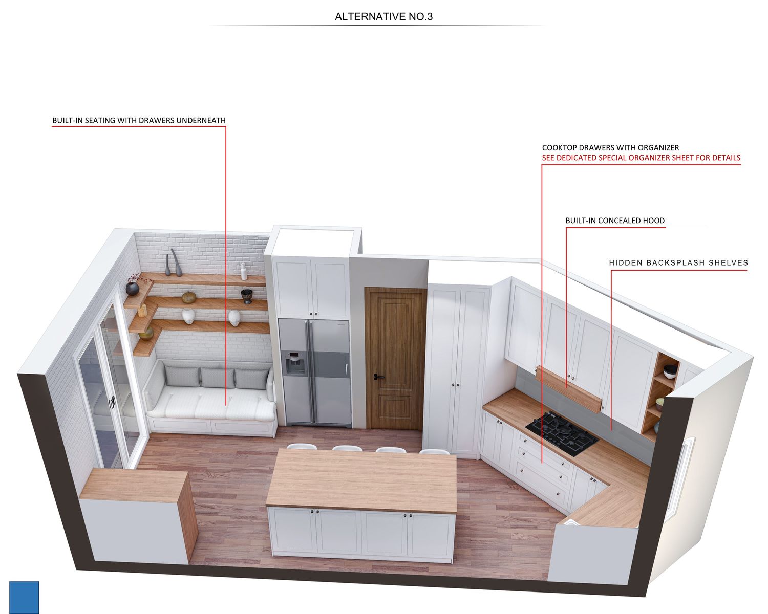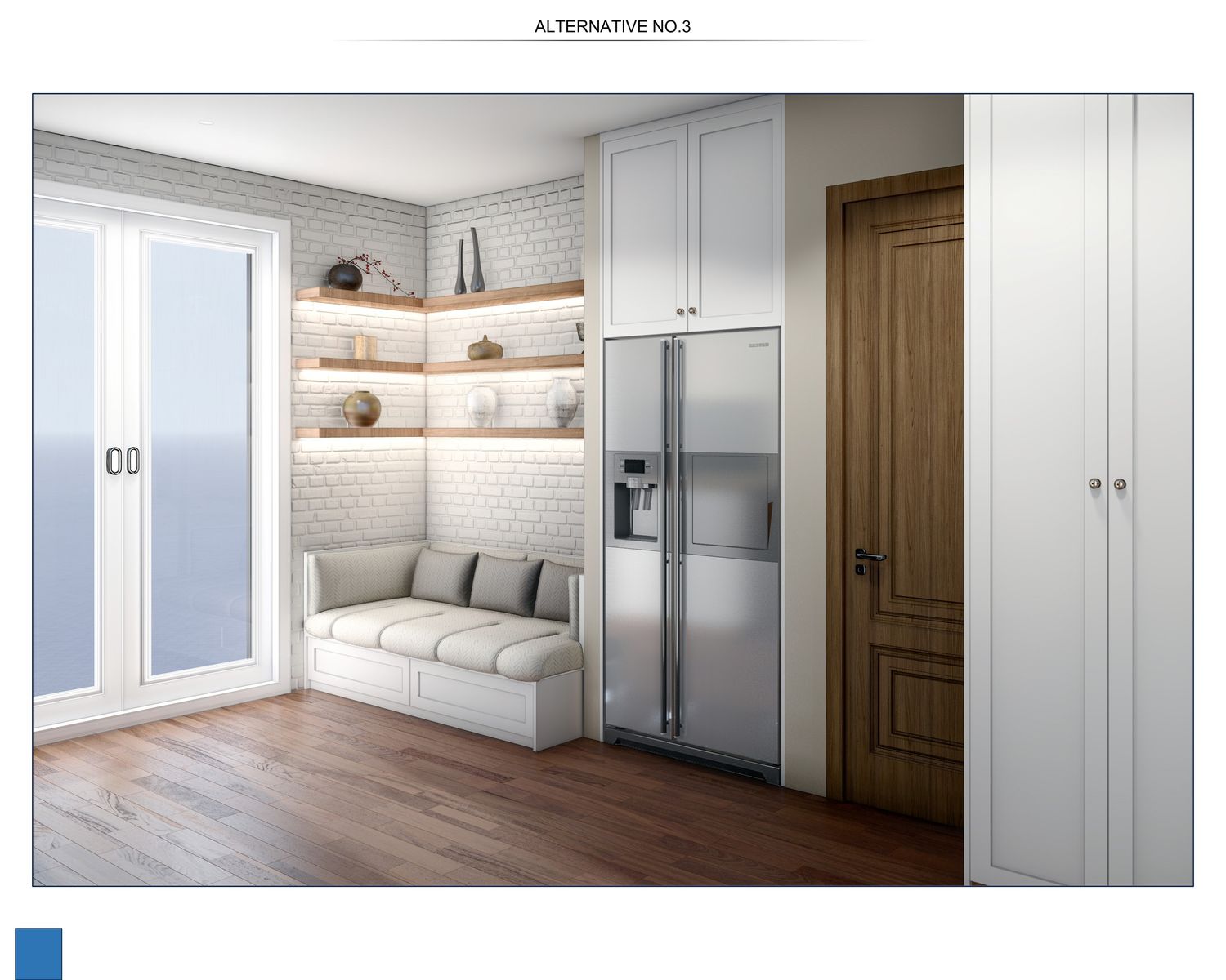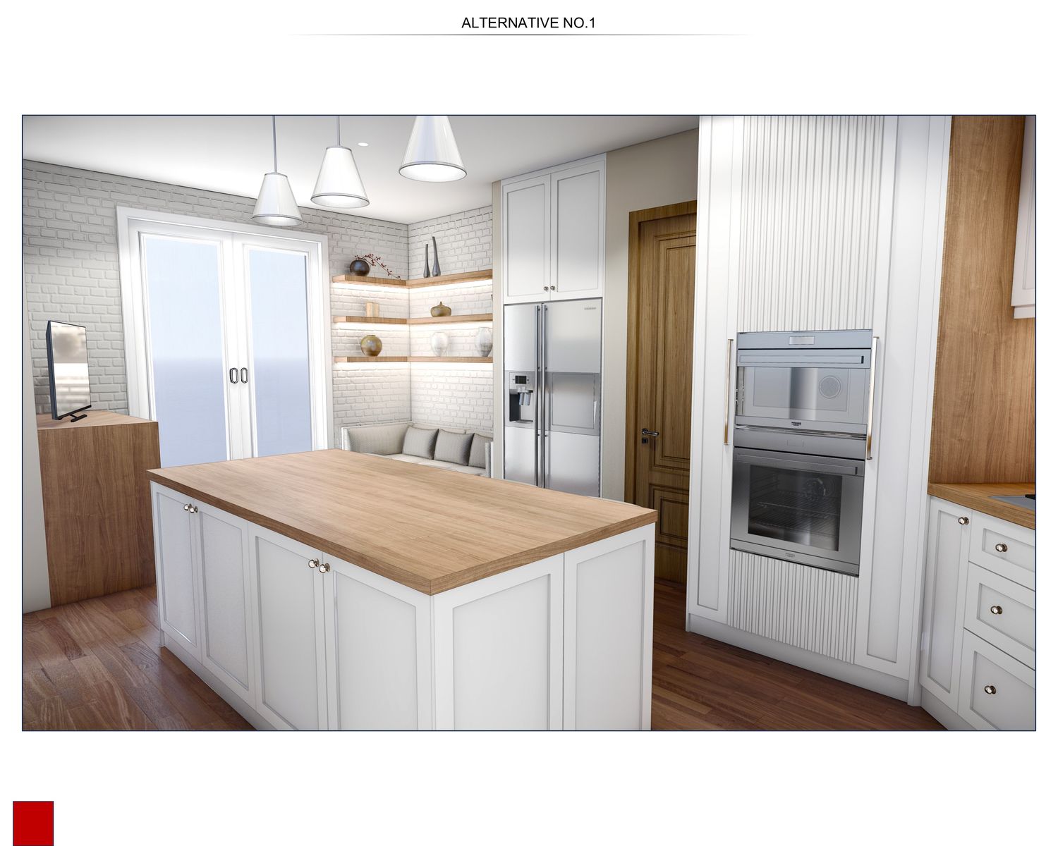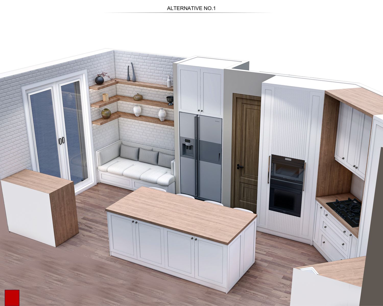 Considering existing constraints such as the fixed location of the refrigerator and the preservation of the parquet flooring, and with the goal of addressing challenges like insufficient storage space and inaccessible cabinets, we have prepared three distinct yet fully actionable design concepts. Each of these proposals offers a different approach to creating an ideal space where: