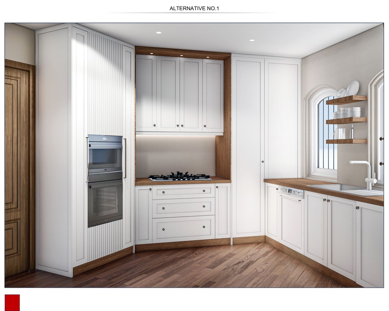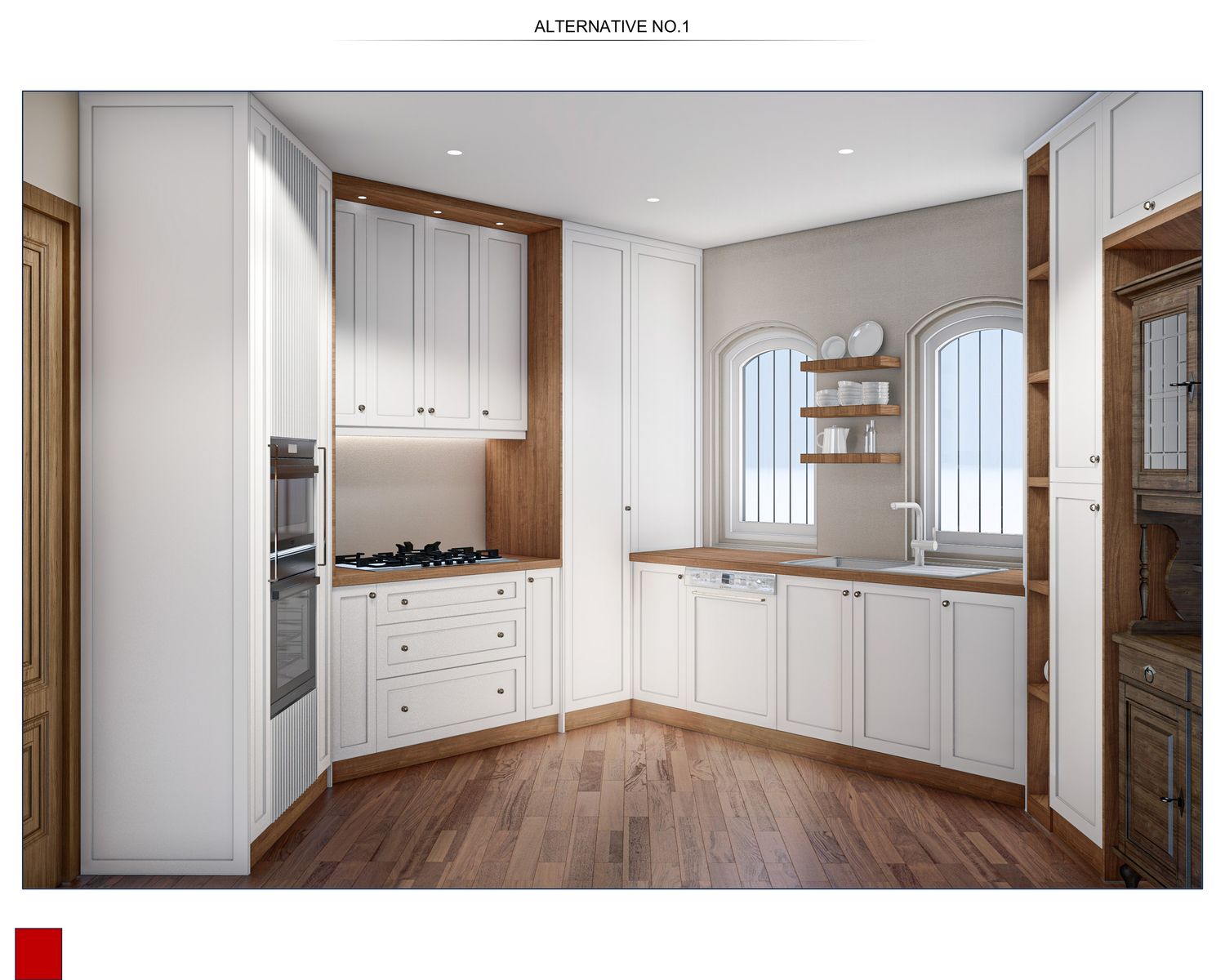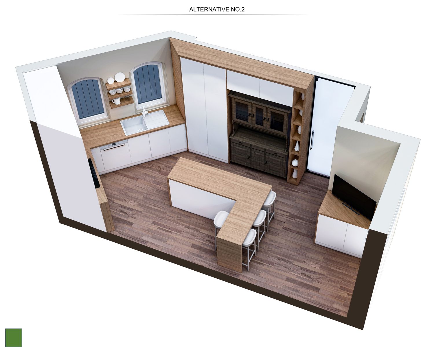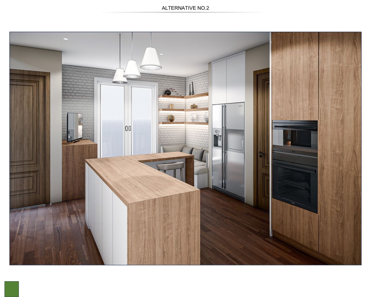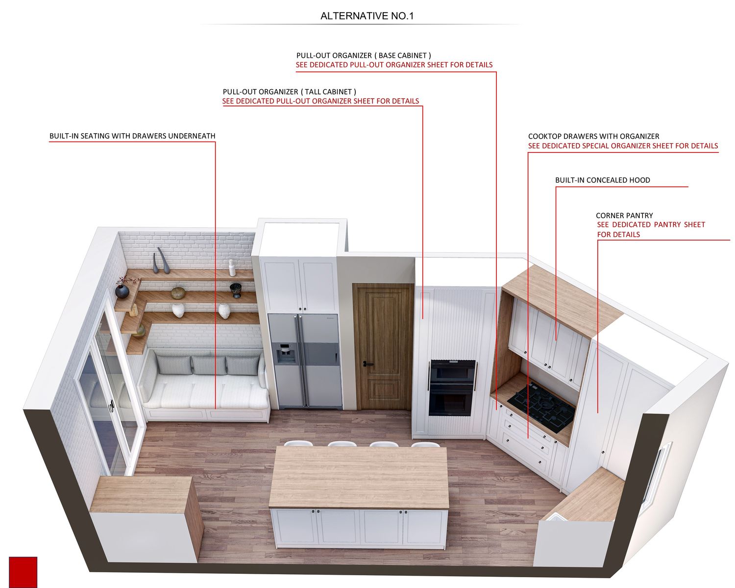 Considering existing constraints such as the fixed location of the refrigerator and the preservation of the parquet flooring, and with the goal of addressing challenges like insufficient storage space and inaccessible cabinets, we have prepared three distinct yet fully actionable design concepts. Each of these proposals offers a different approach to creating an ideal space where: