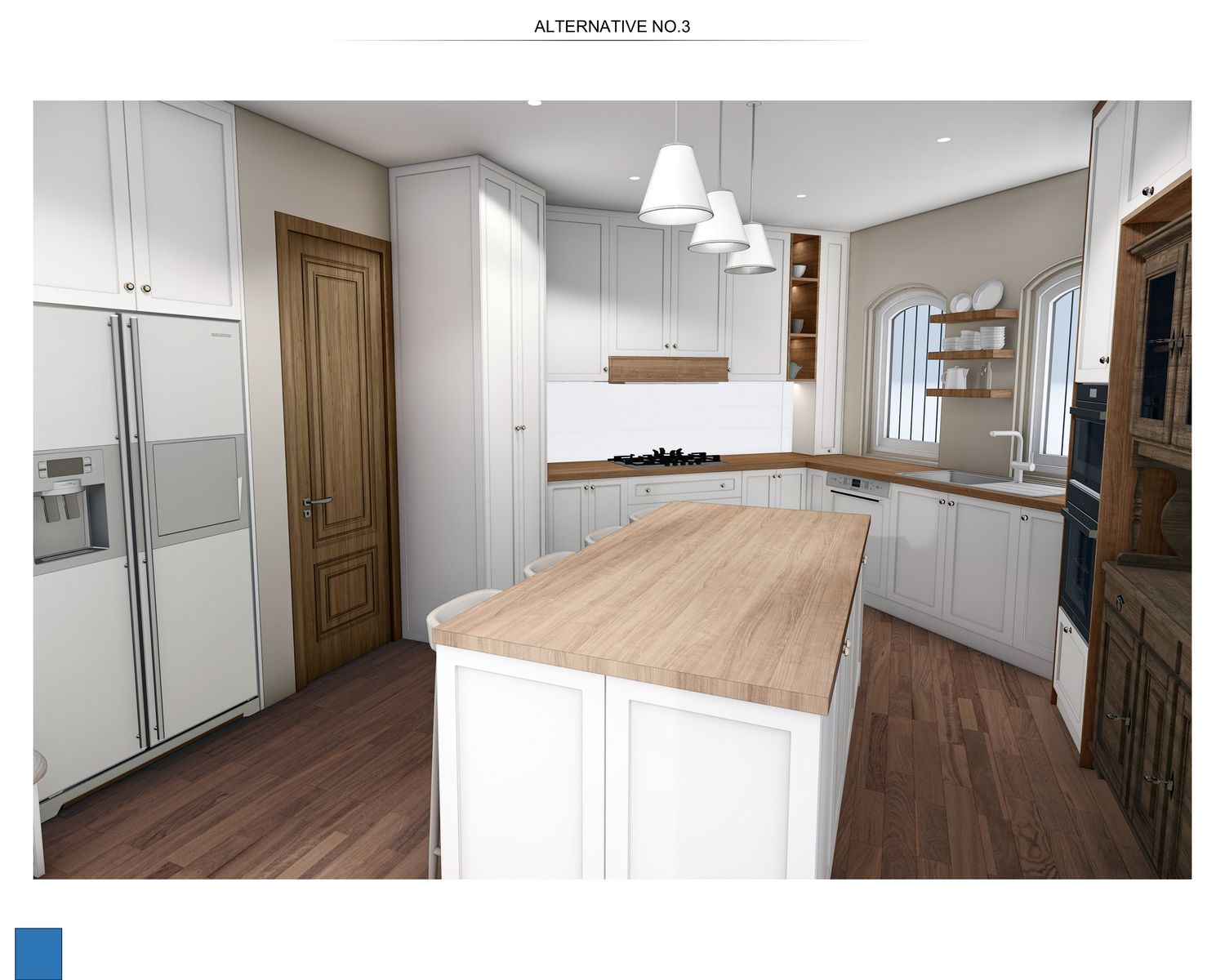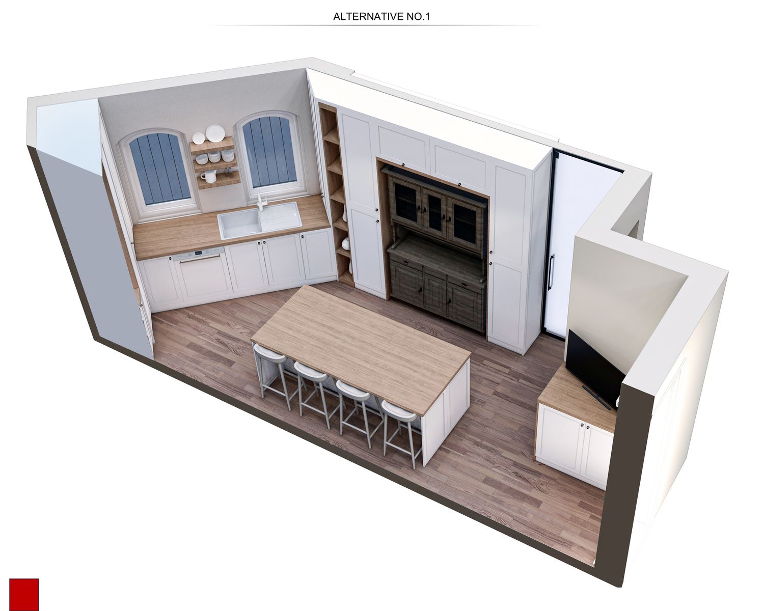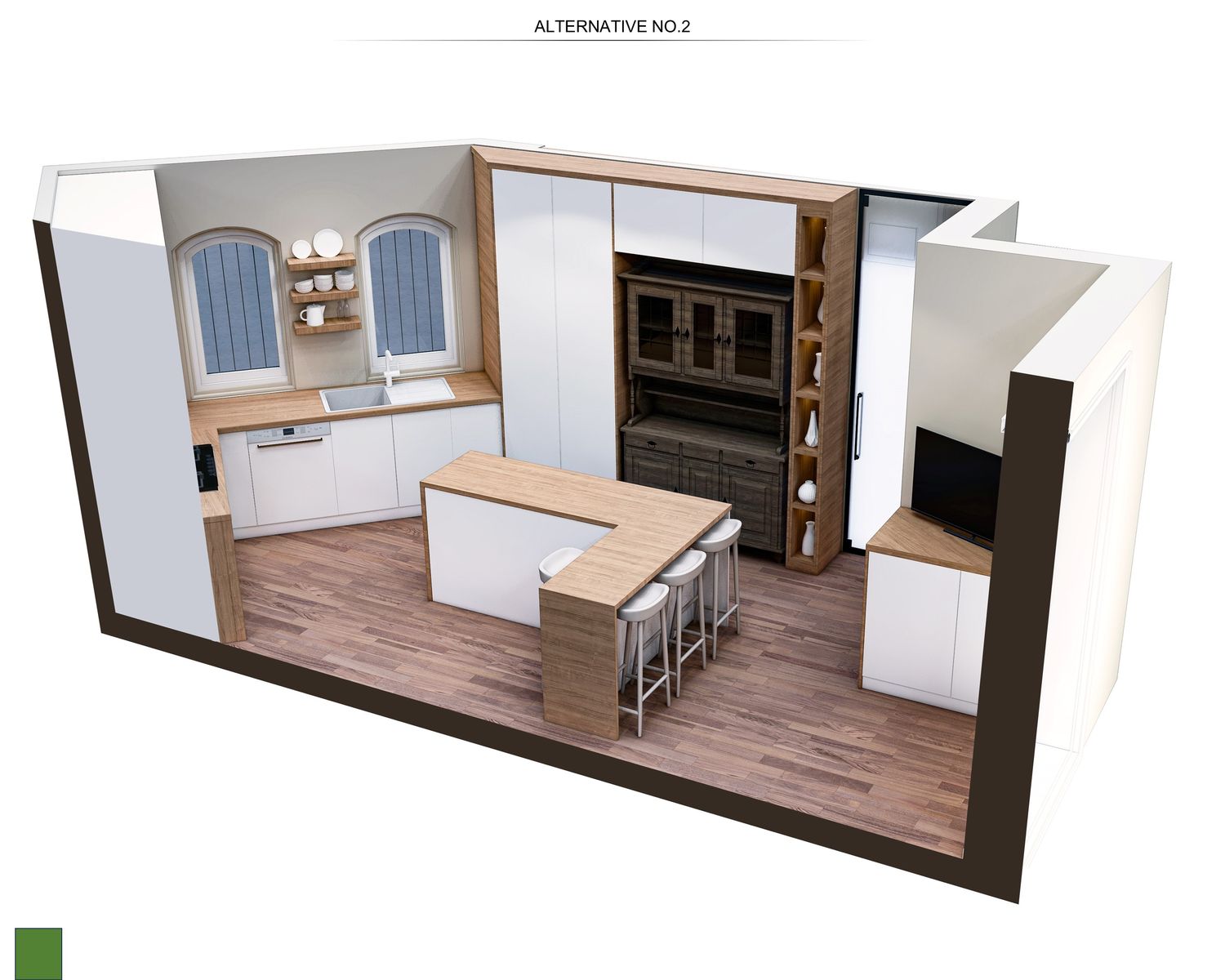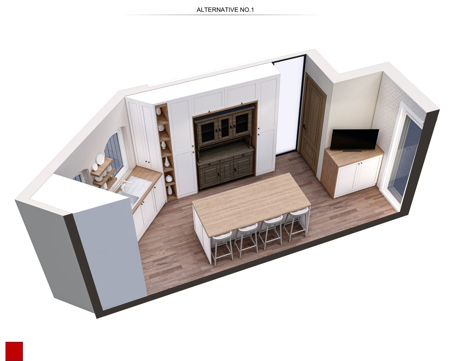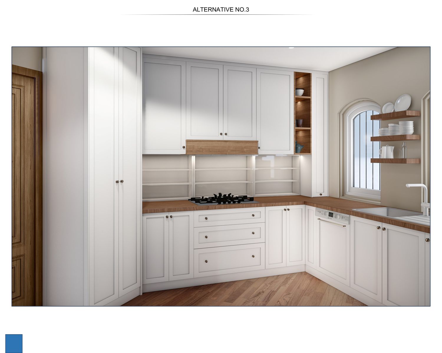 Considering existing constraints such as the fixed location of the refrigerator and the preservation of the parquet flooring, and with the goal of addressing challenges like insufficient storage space and inaccessible cabinets, we have prepared three distinct yet fully actionable design concepts. Each of these proposals offers a different approach to creating an ideal space where: