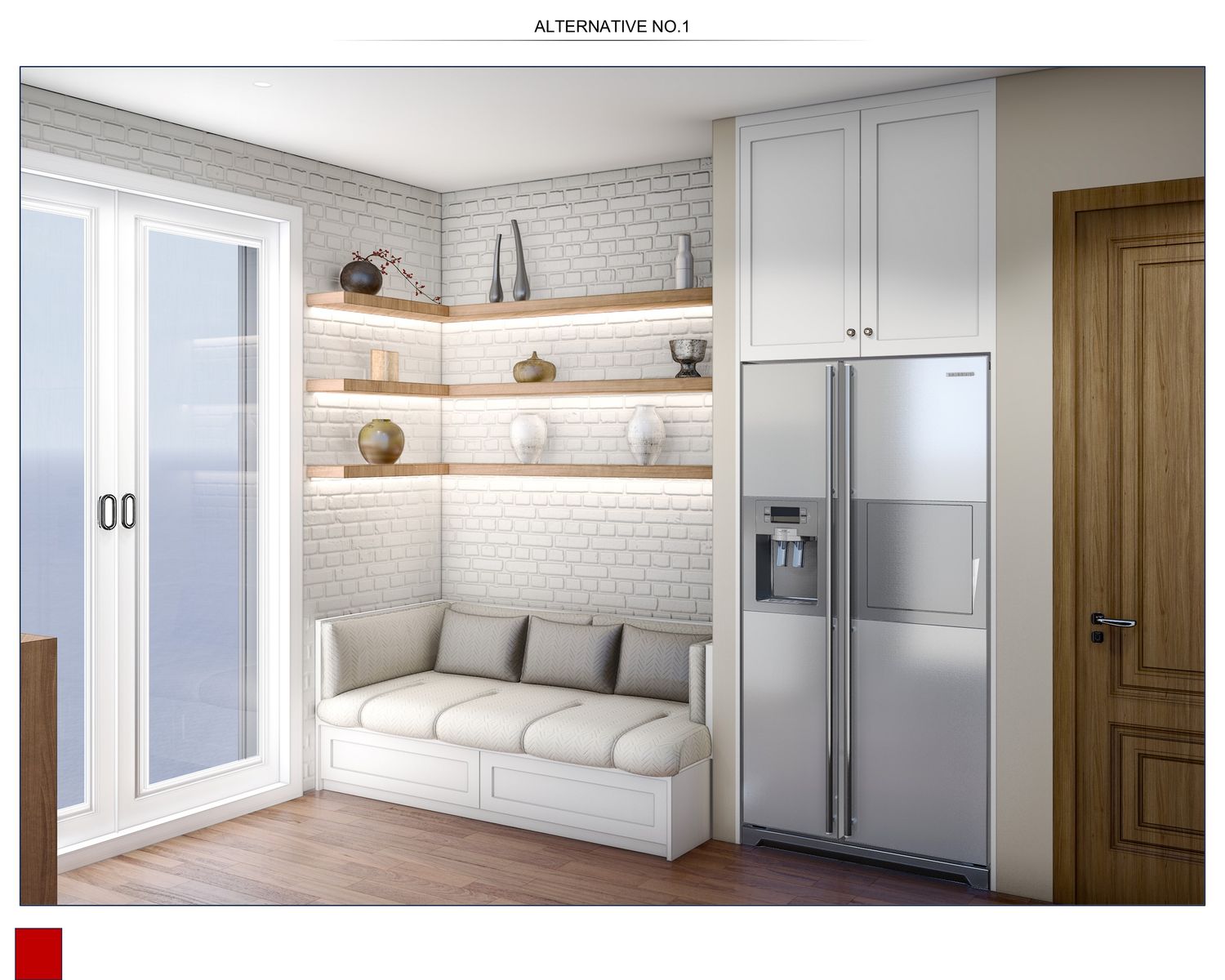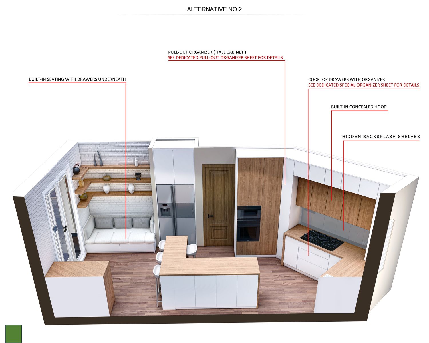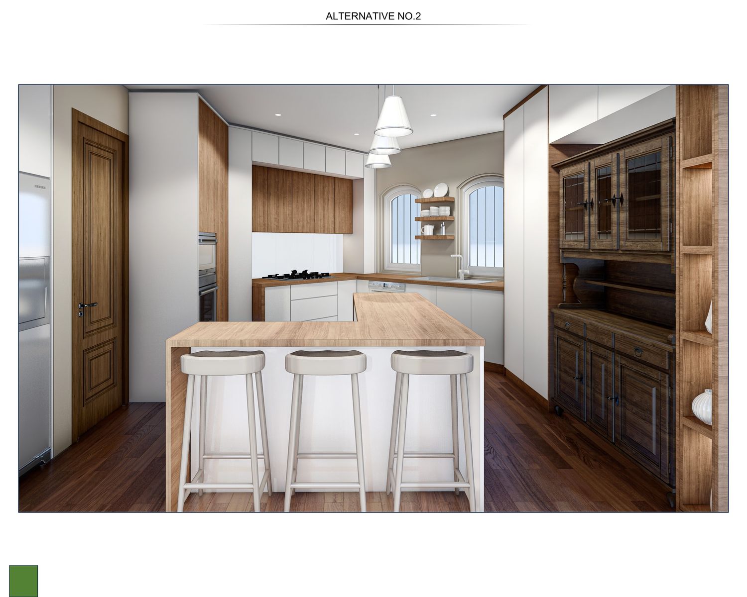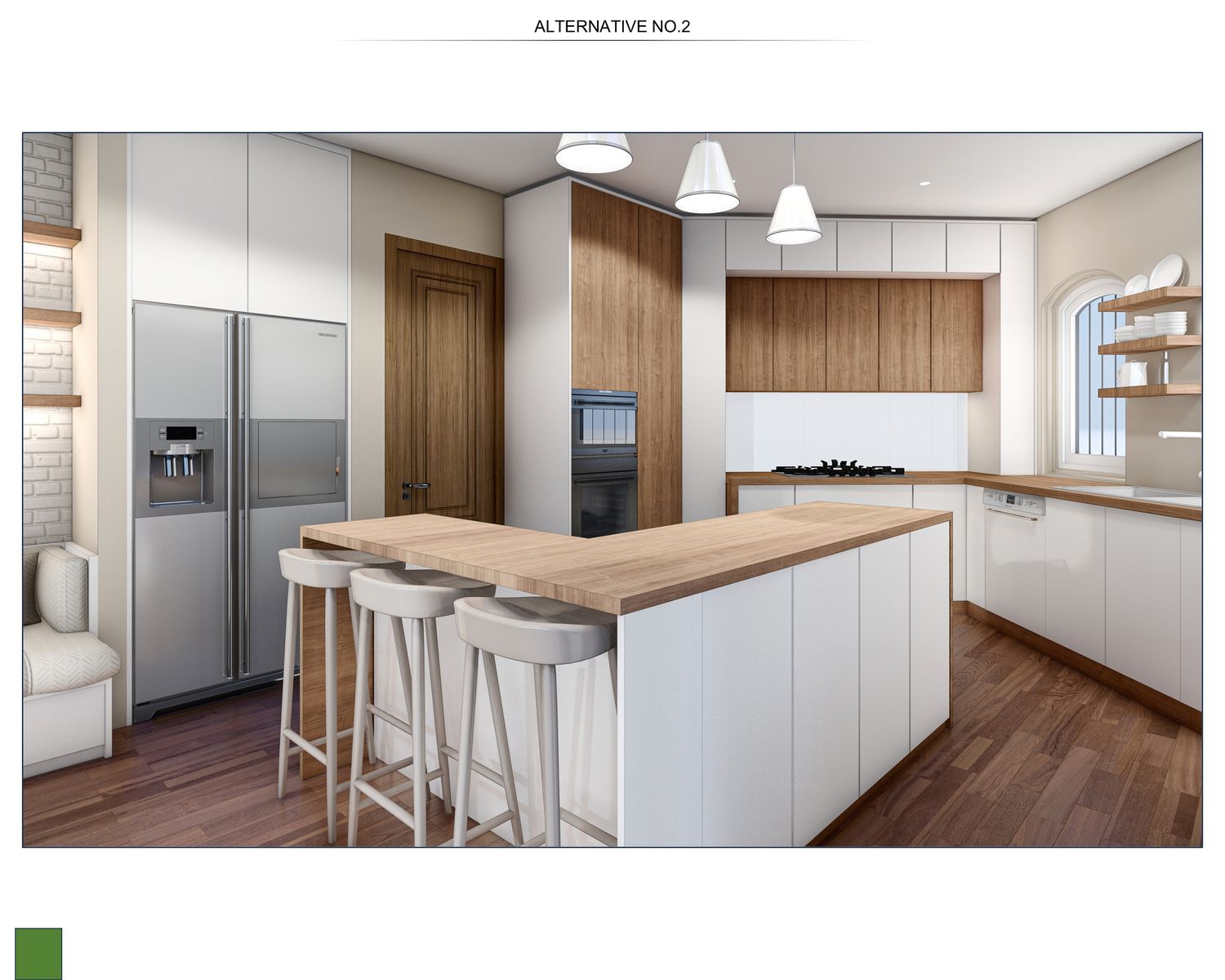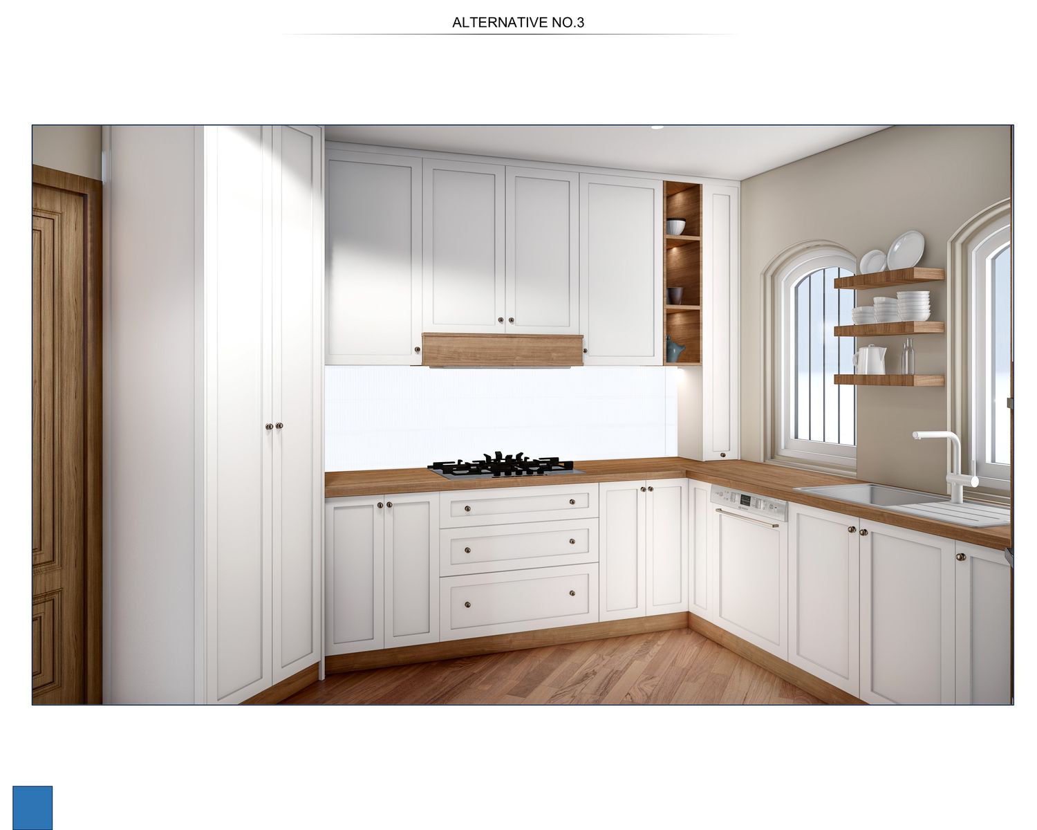 Considering existing constraints such as the fixed location of the refrigerator and the preservation of the parquet flooring, and with the goal of addressing challenges like insufficient storage space and inaccessible cabinets, we have prepared three distinct yet fully actionable design concepts. Each of these proposals offers a different approach to creating an ideal space where: